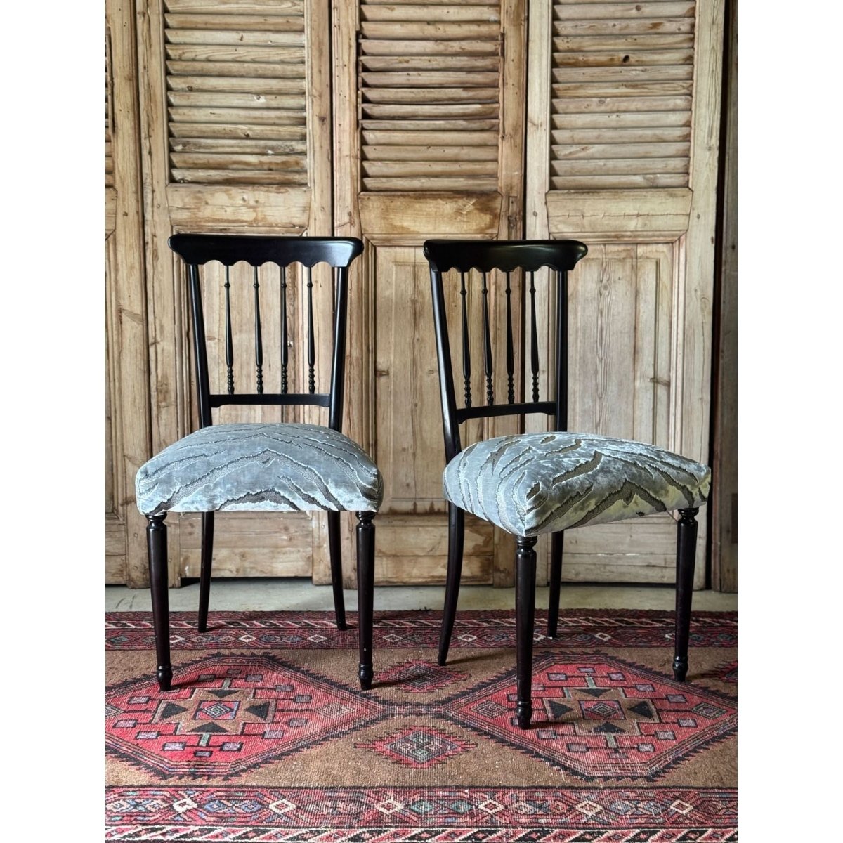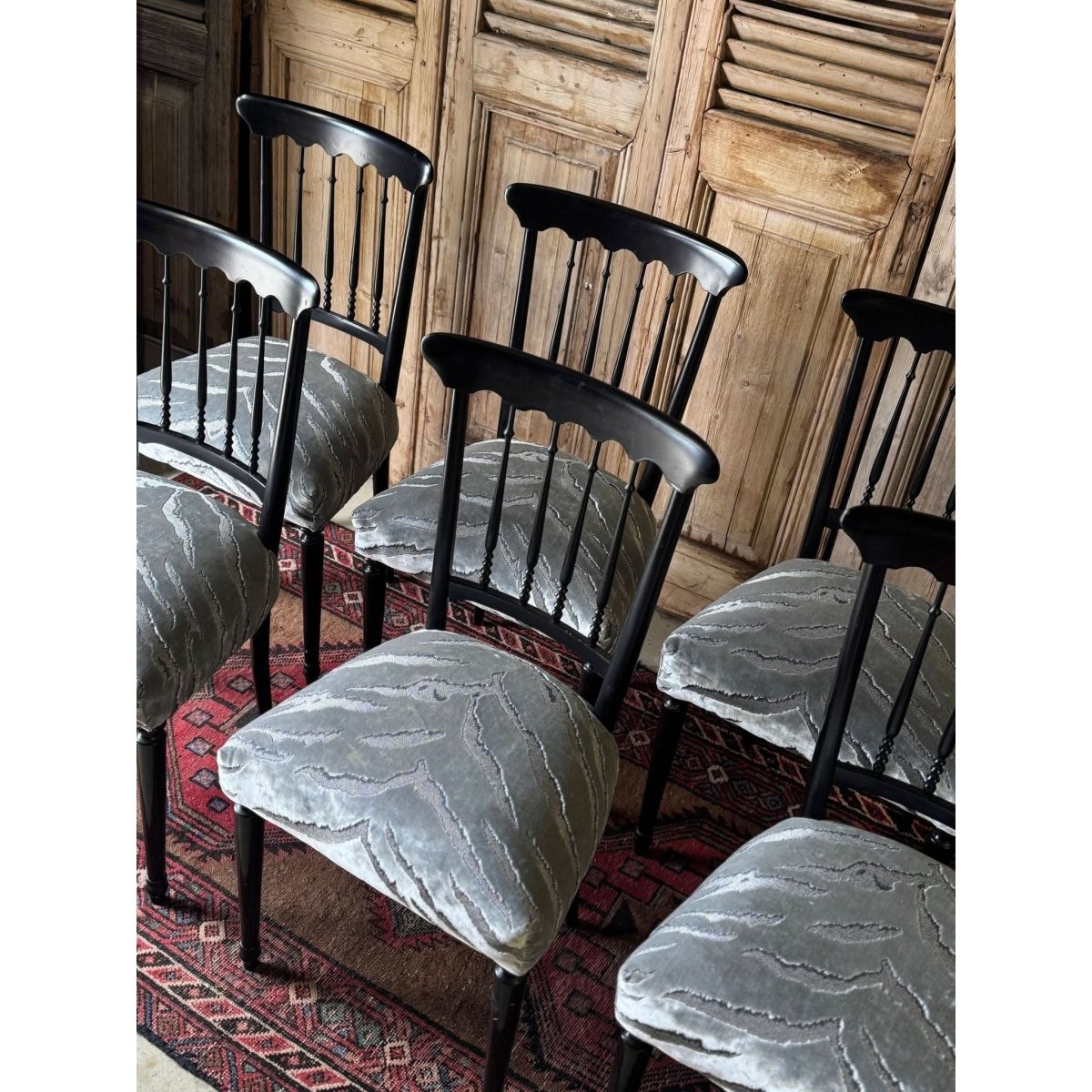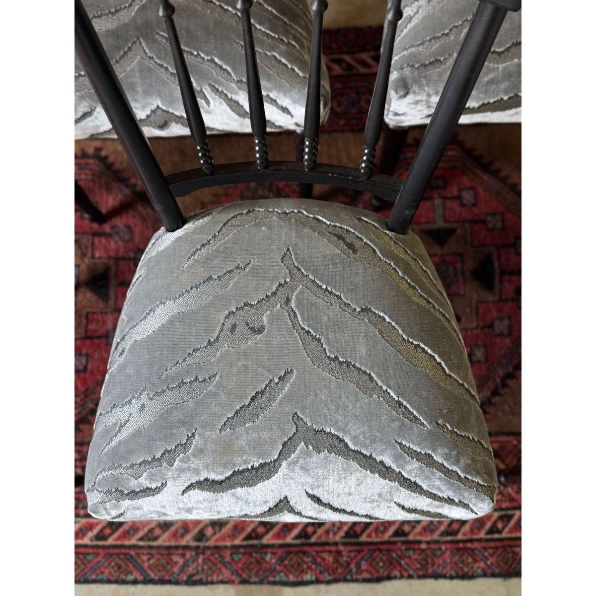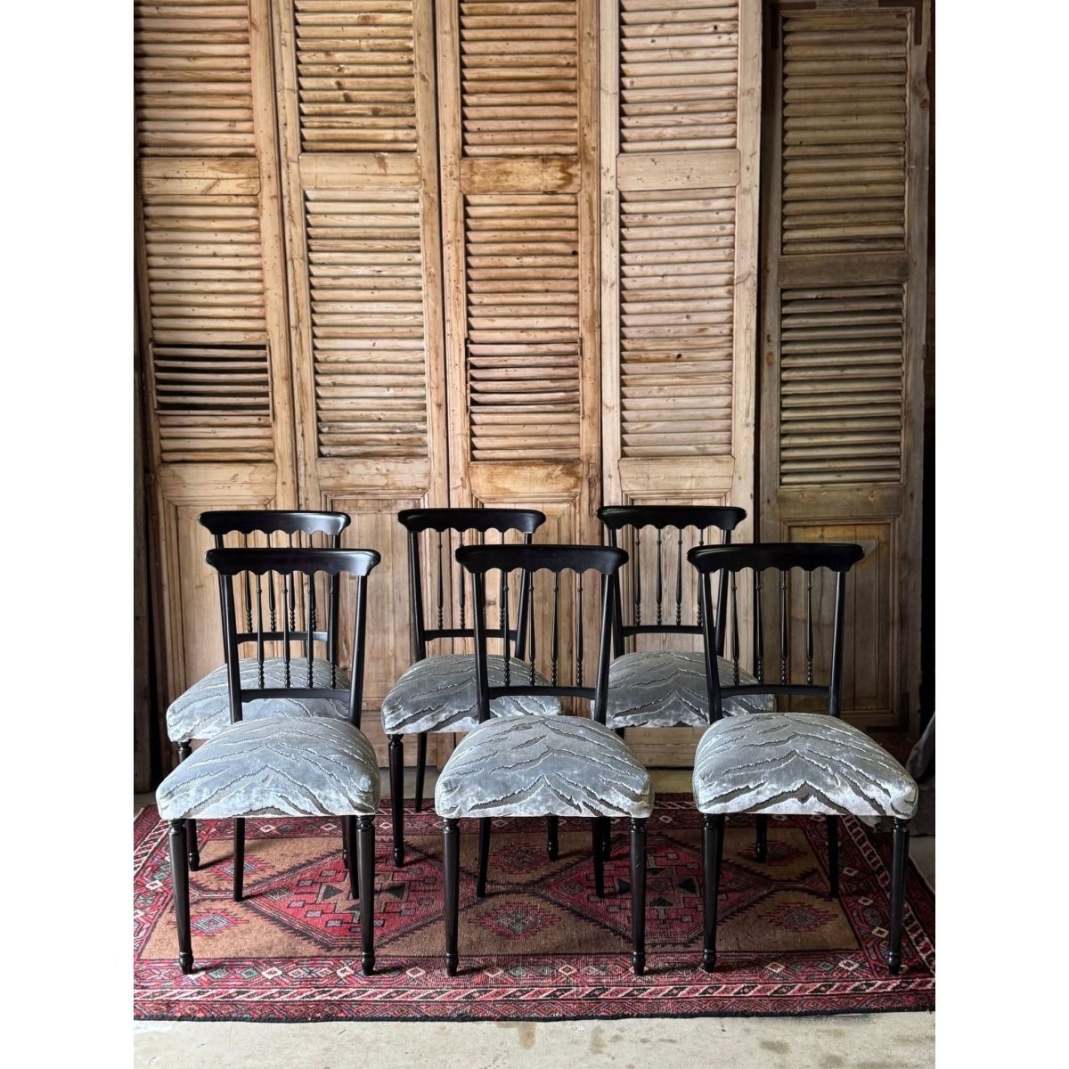 A stunning set of Napoleon III style vintage timber dining chairs upholstered in a burnout tiger velvet by Catherine Martin. Minor scuff marks to frames.