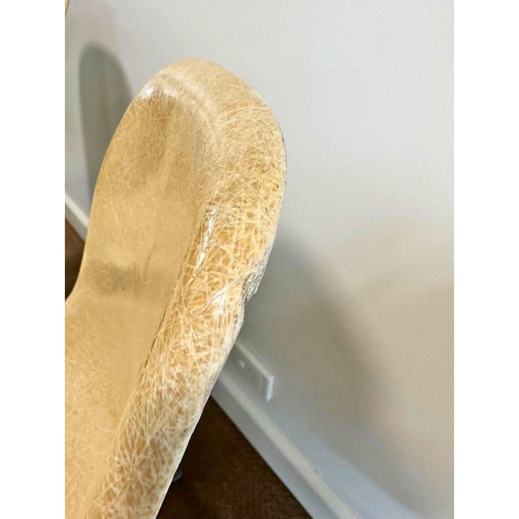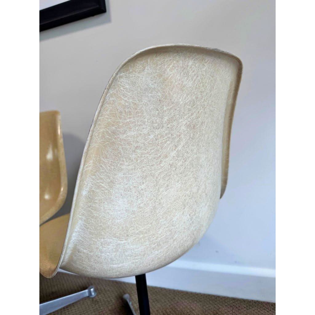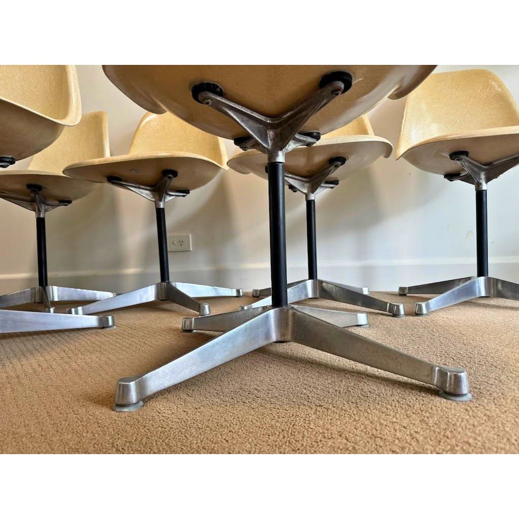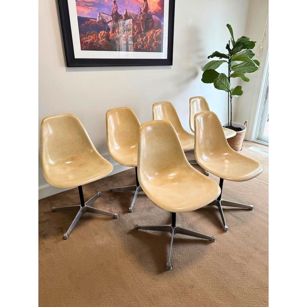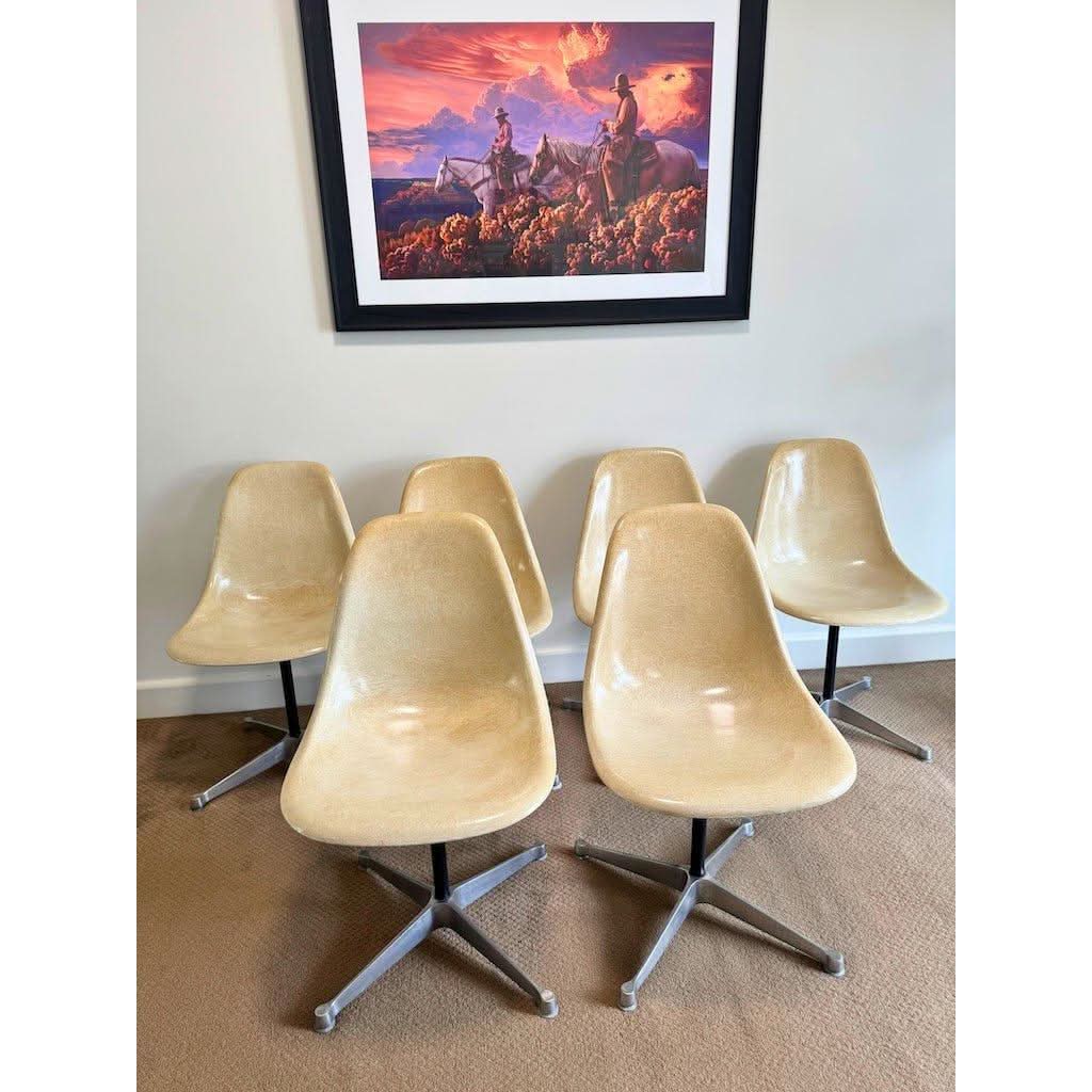 After years of experimentation and design refinement, Charles and Ray Eames perfected the 'Pivoting Side Chair' (PSC), produced by Herman Miller throughout the 1960s and 1970s. This rare and highly collectible set features six matching chairs in a beautiful bone-coloured fibreglass finish - an iconic example of mid-century American design.