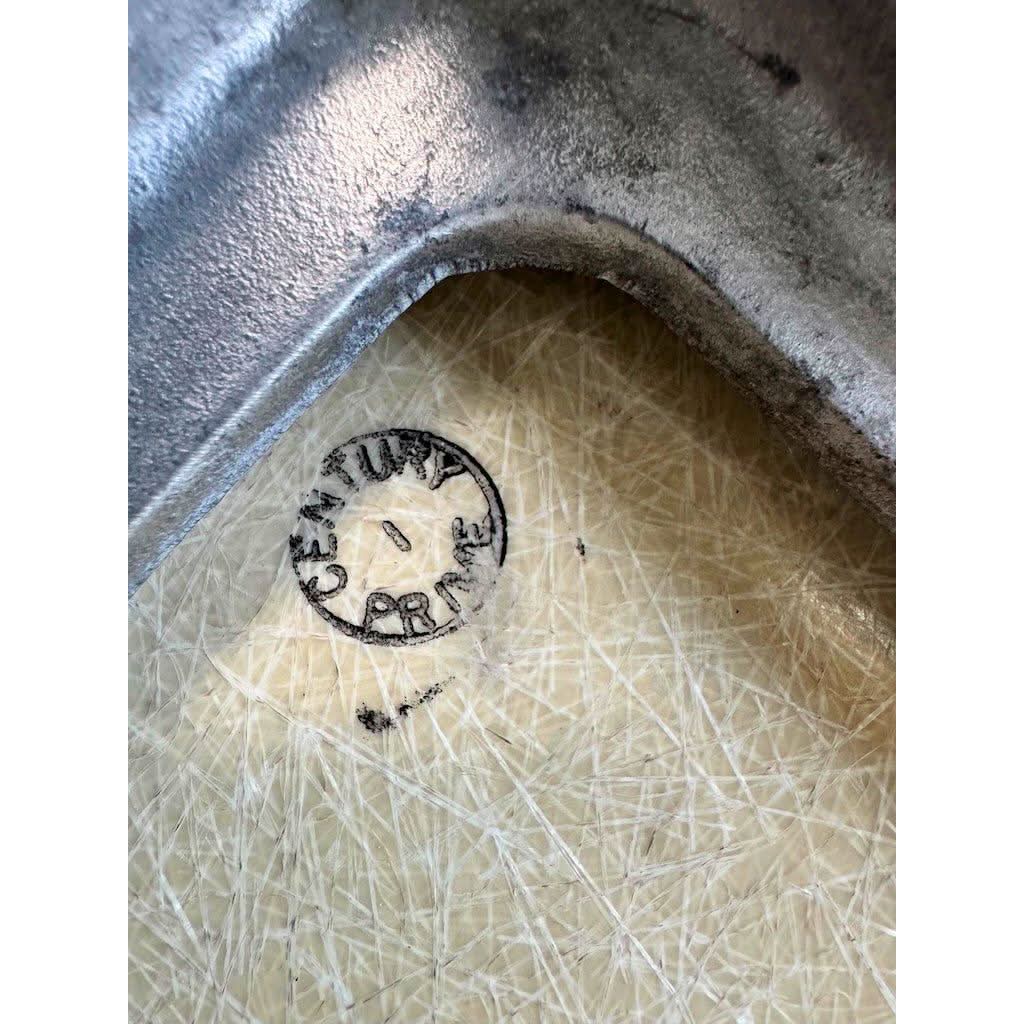 Each chair features the classic contract swivel base and presents in very good vintage condition, with no structural issues, smooth swivel action, and clean aluminum bases. One chair shows a small surface chip to the fibreglass edge (pictured), which does not affect function or integrity.