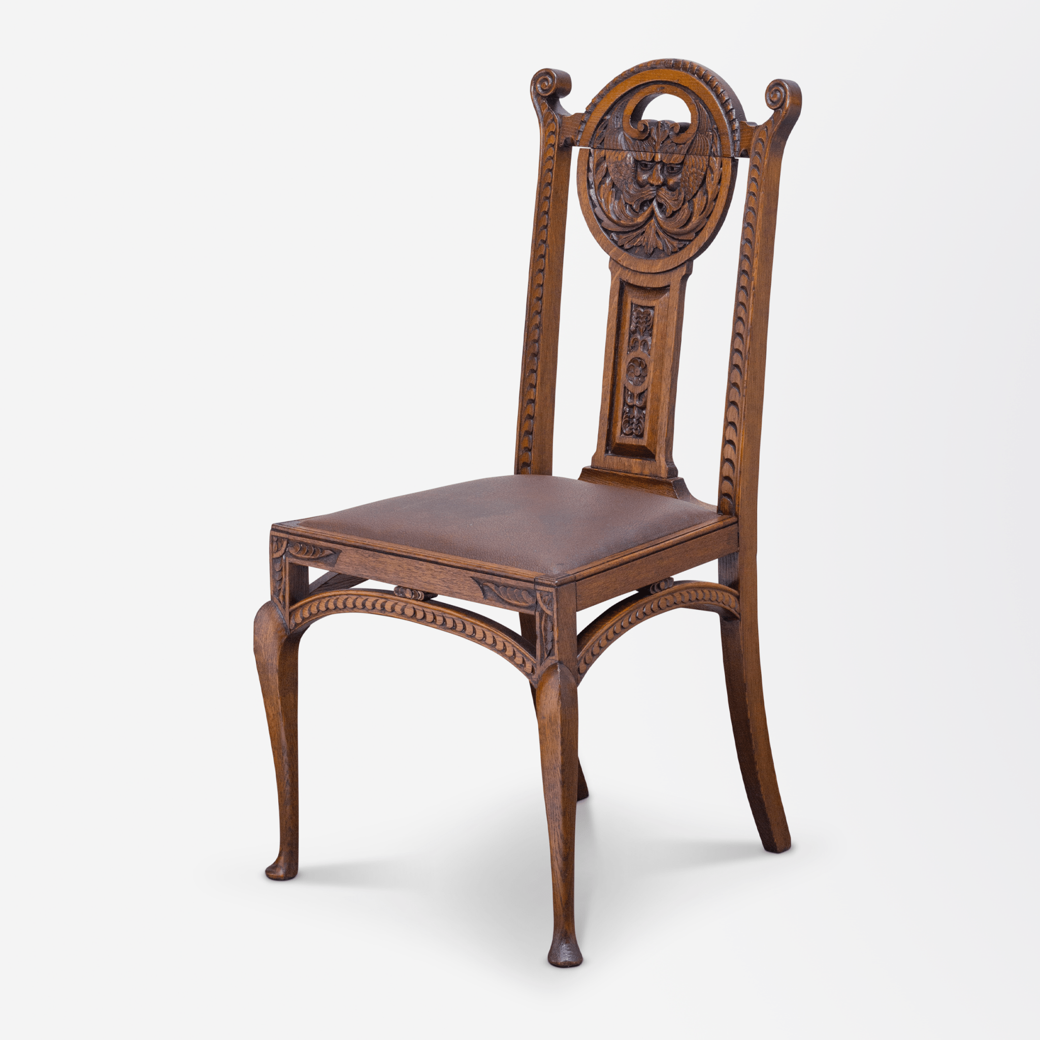 A set of four quality, hand-carved chestnut, 'Man of the Northwind' dining chairs, circa 1900. Two chairs have leather upholstered seats, and two are painted canvas.