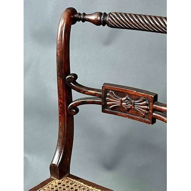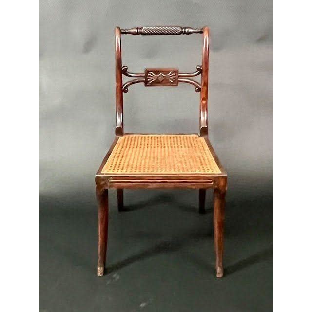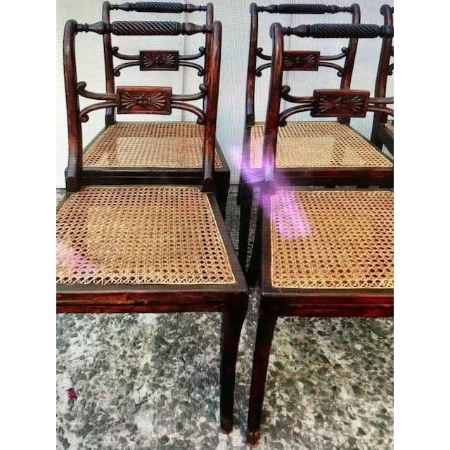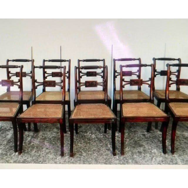 These are a rare long set of ten genuine antique English Georgian regency period ( 1811 - 1820 ) Dining Chairs with classic Regency features. The show timber frames are made out of solid Beech and were hand grained so as to simulate the prestigious Rosewood.