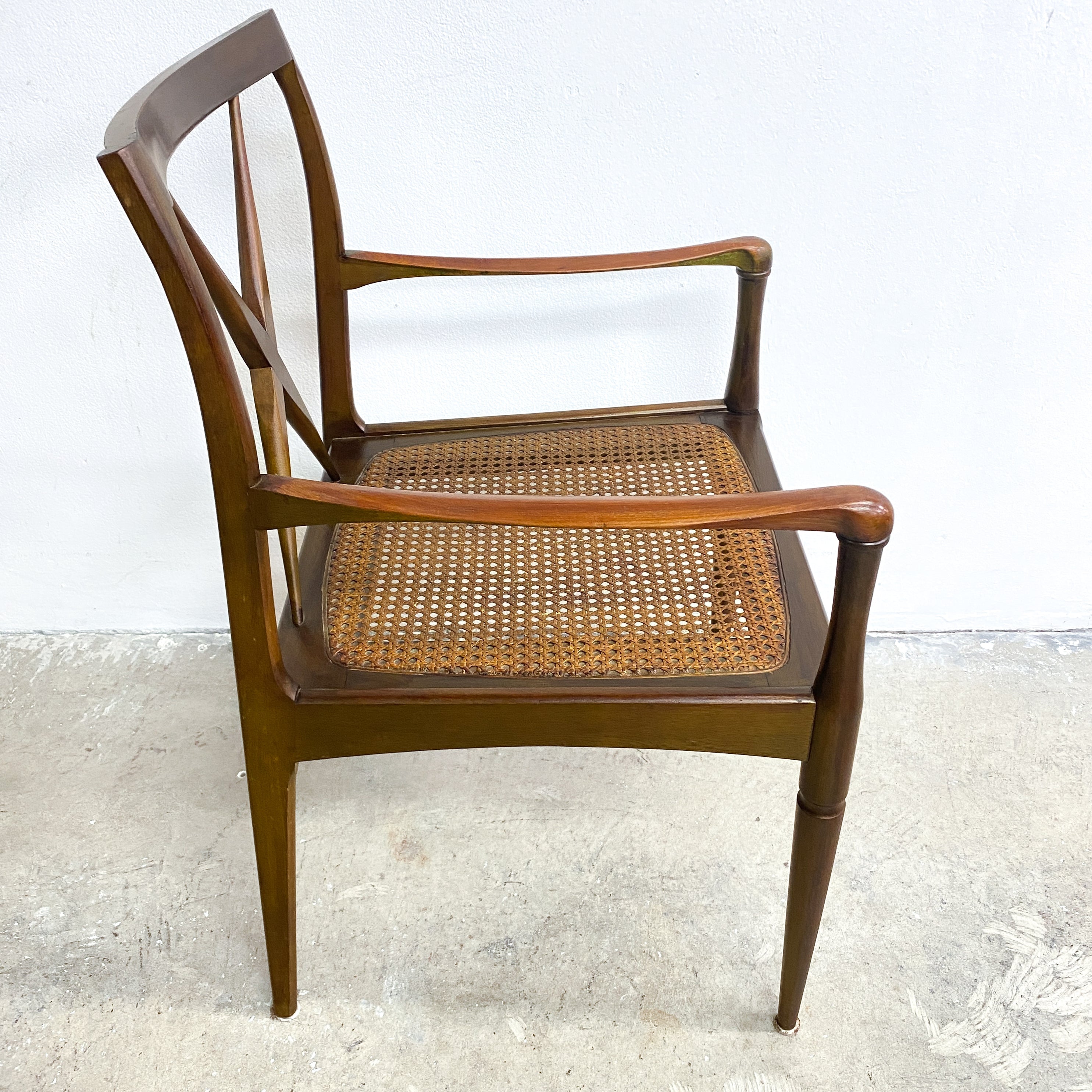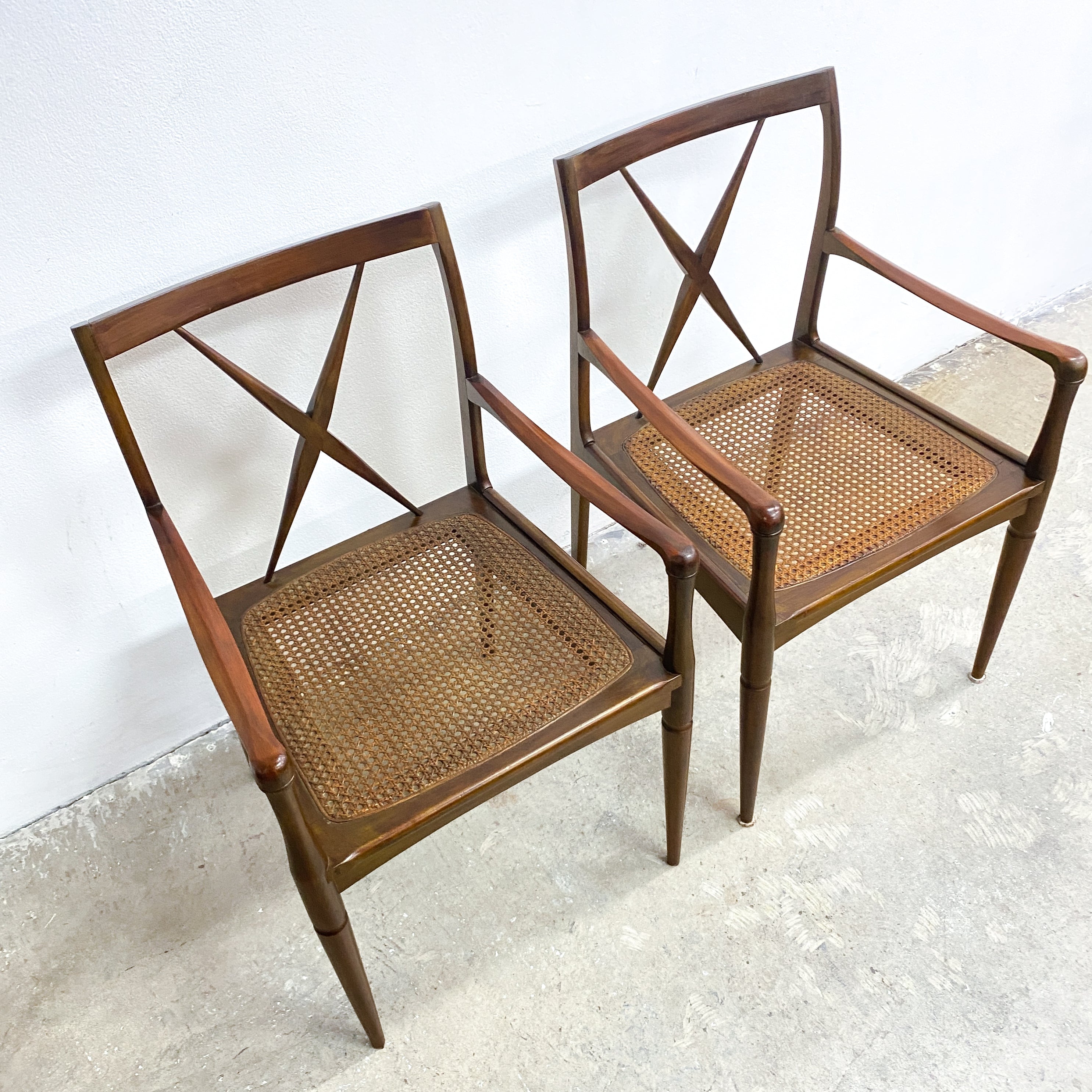 Stunning set of 2 mid century carver dining chairs by Australian designer/maker John Duffecy. With rattan seats, a cross back detail and carved tapered legs, these chairs are both elegant and timeless. In excellent original condition.