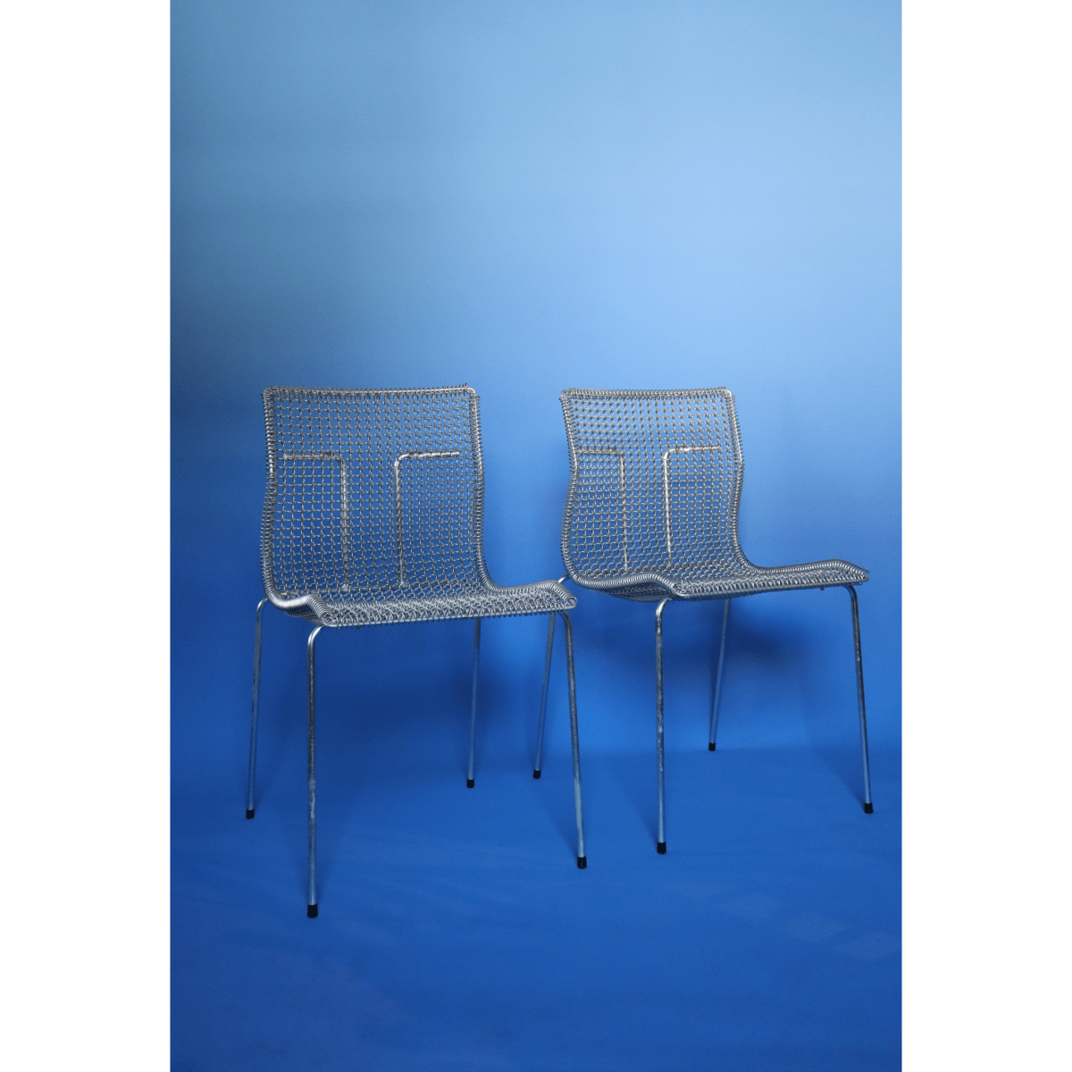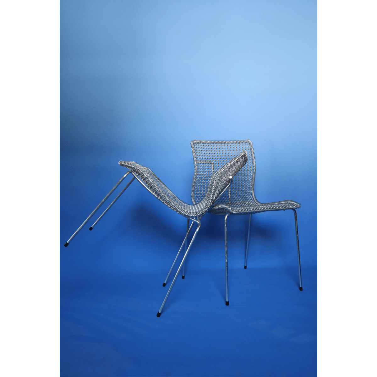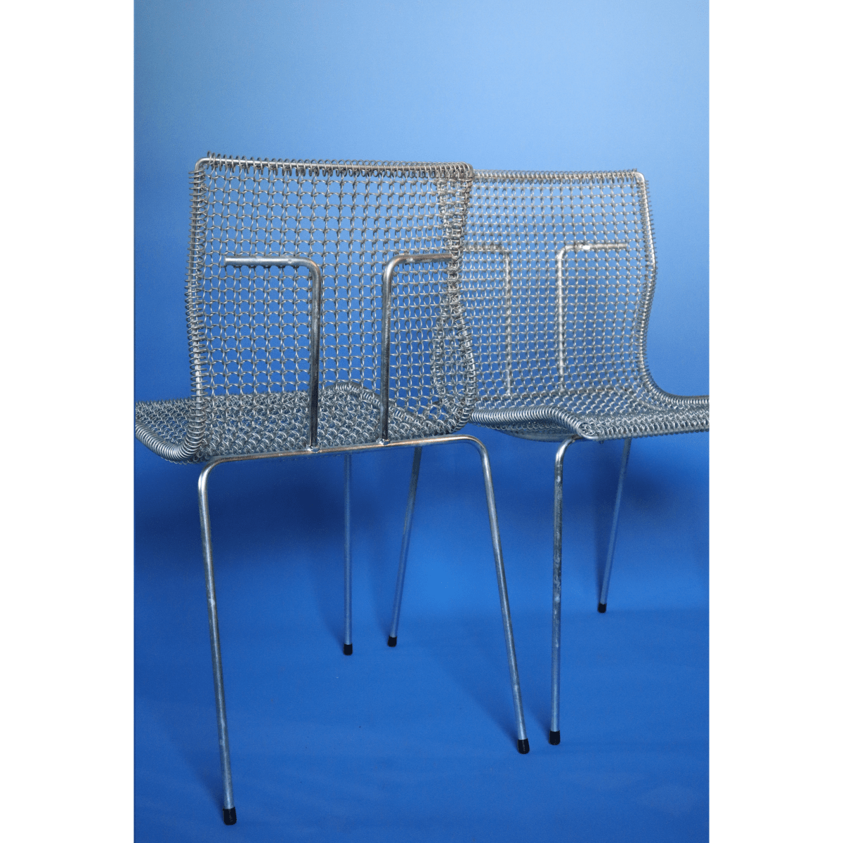 Designed in the 1970s for Dutch manufacturer Spectrum, the Rascal chair exemplifies the brand’s bold approach to postmodern seating. Its chain-link wire construction creates a sculptural, transparent silhouette while maintaining durability and comfort through subtle ergonomic curves.