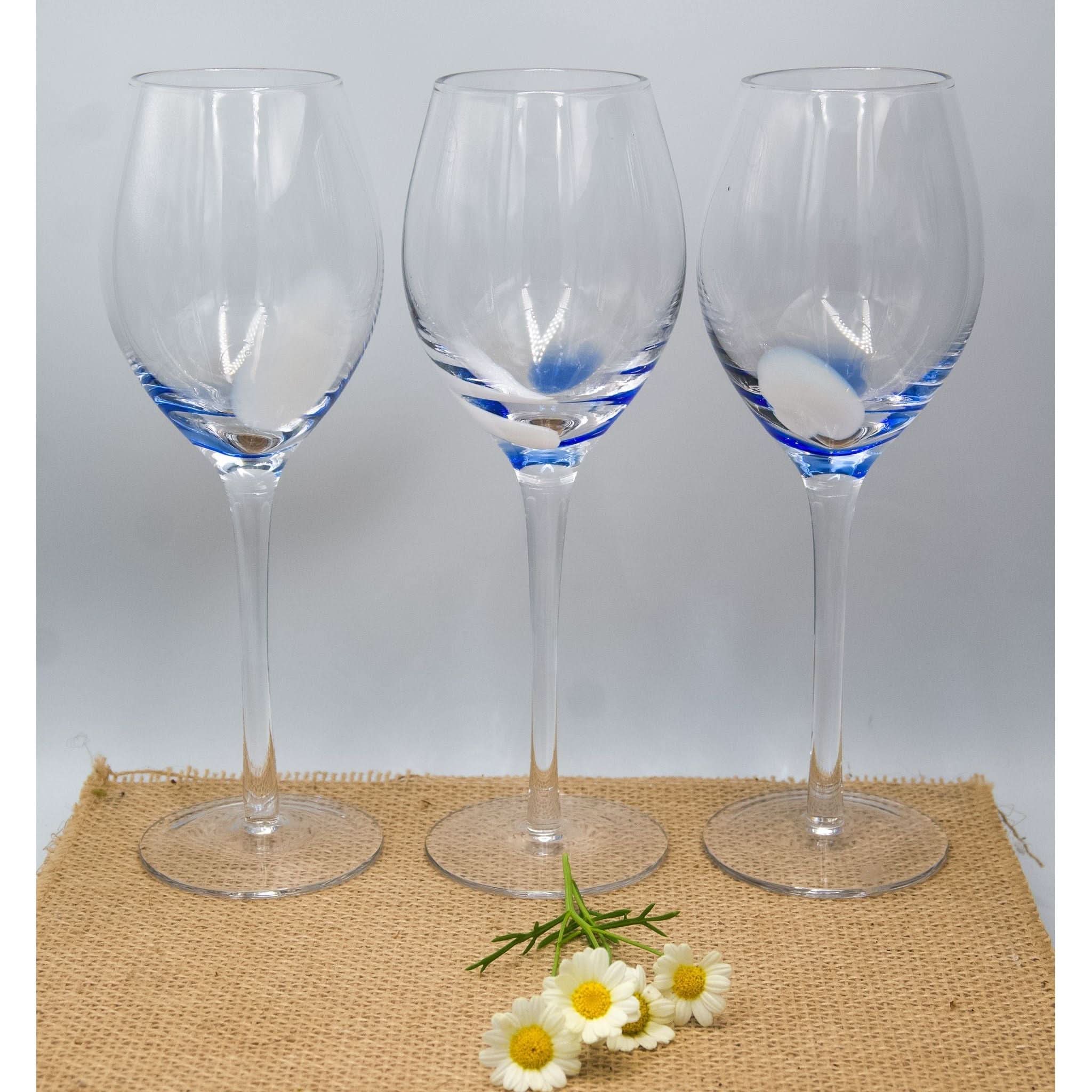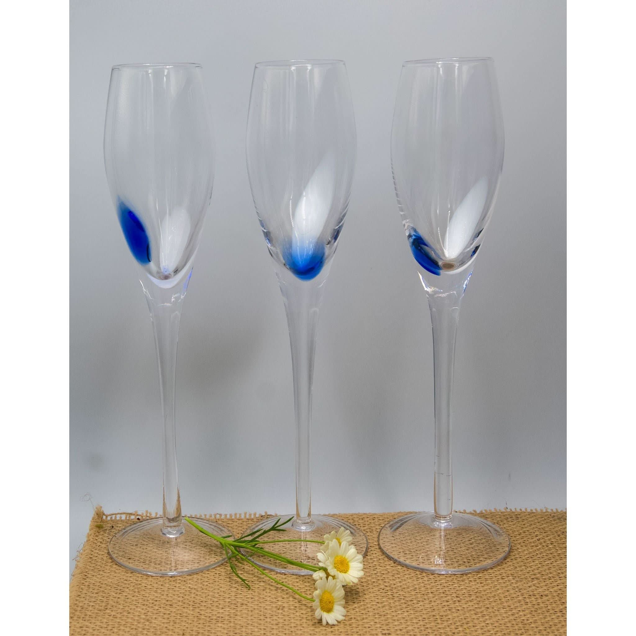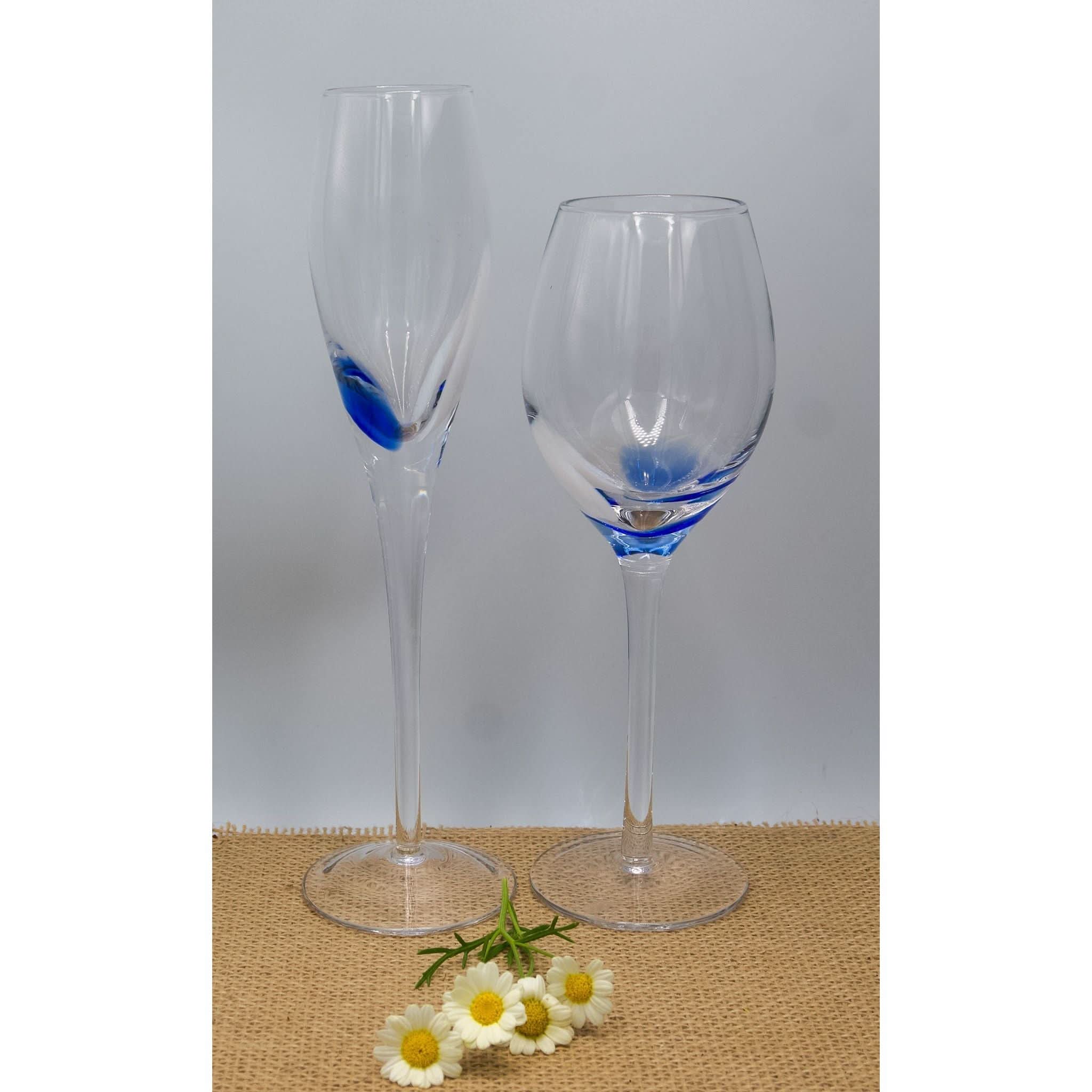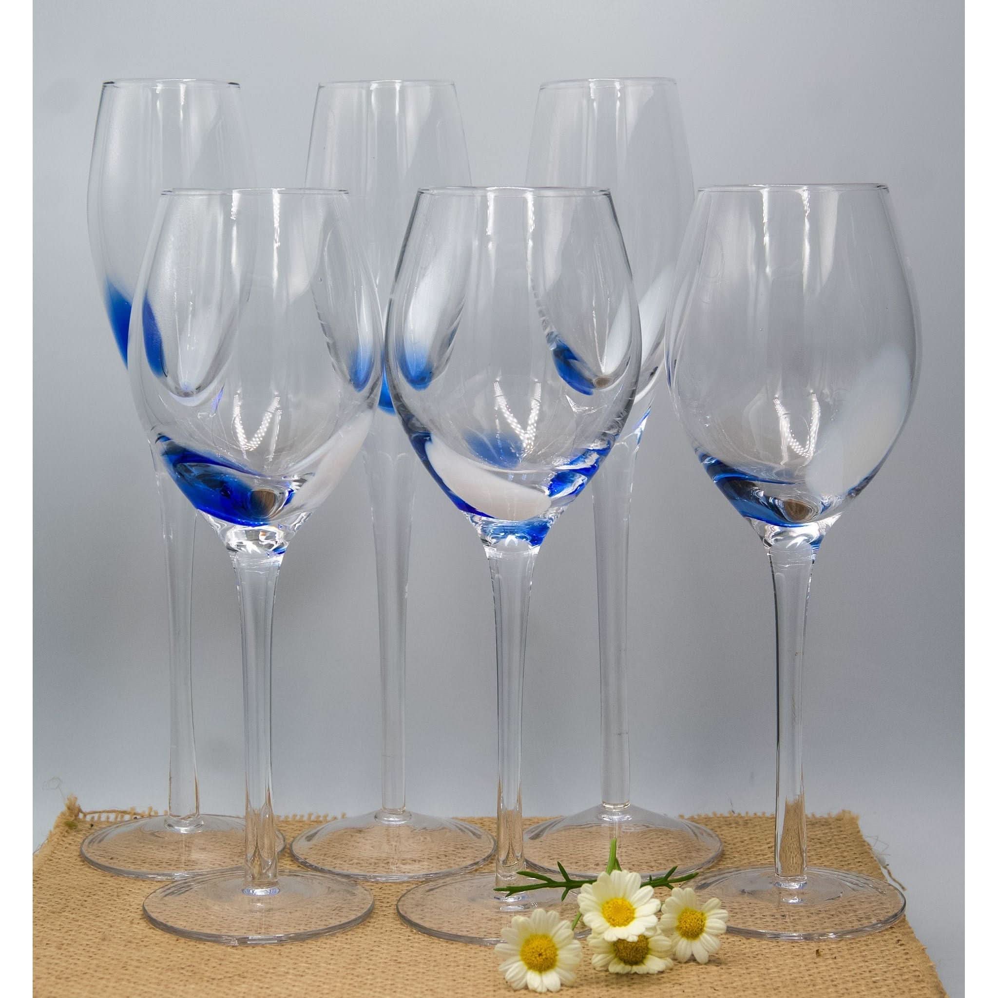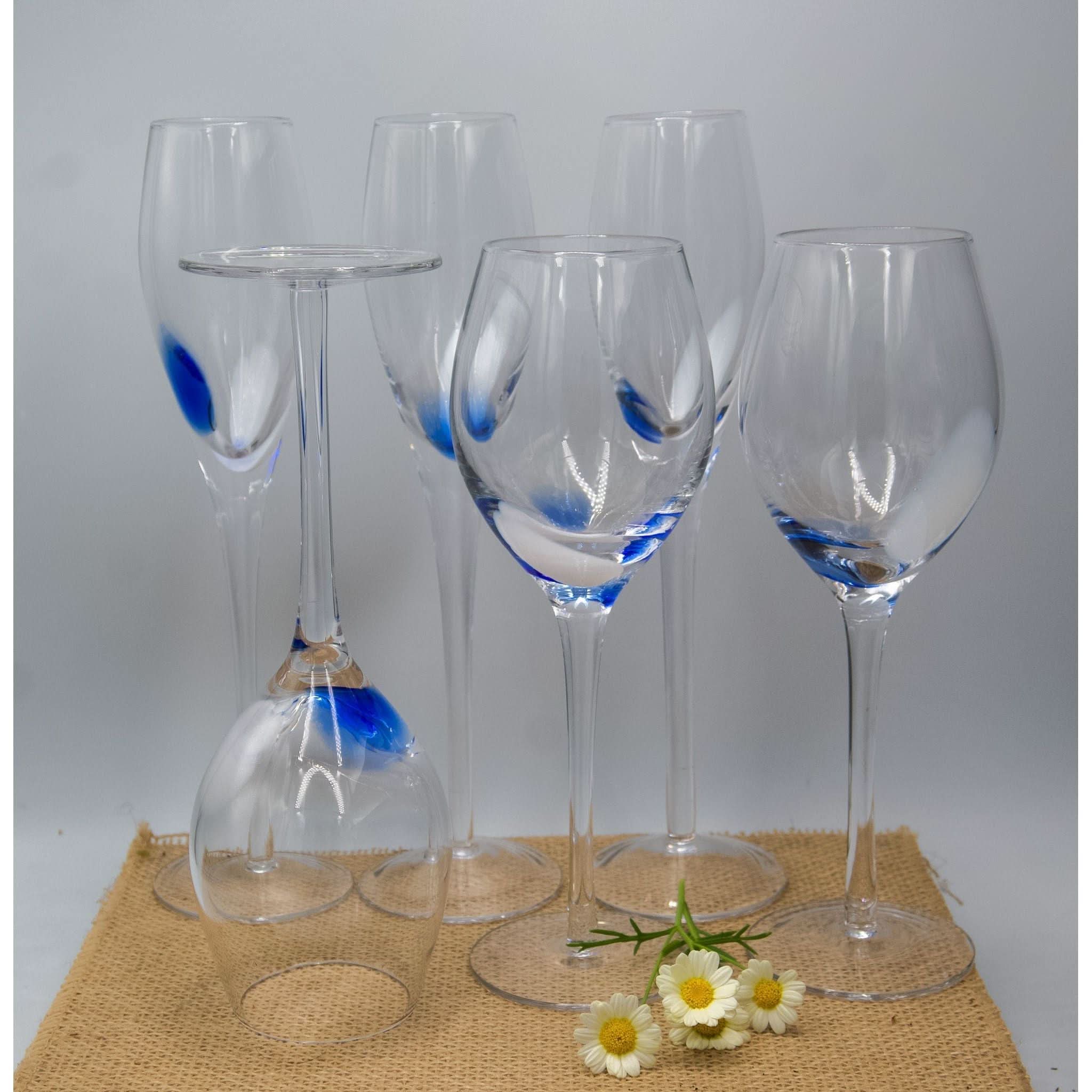 Stunning Mixed Set Of Wine/ Champagne Glasses with white and blue featured flashes at the base of each bowl.These glasses are perfect for a dinner party where the guests have different preferences of what they drink.