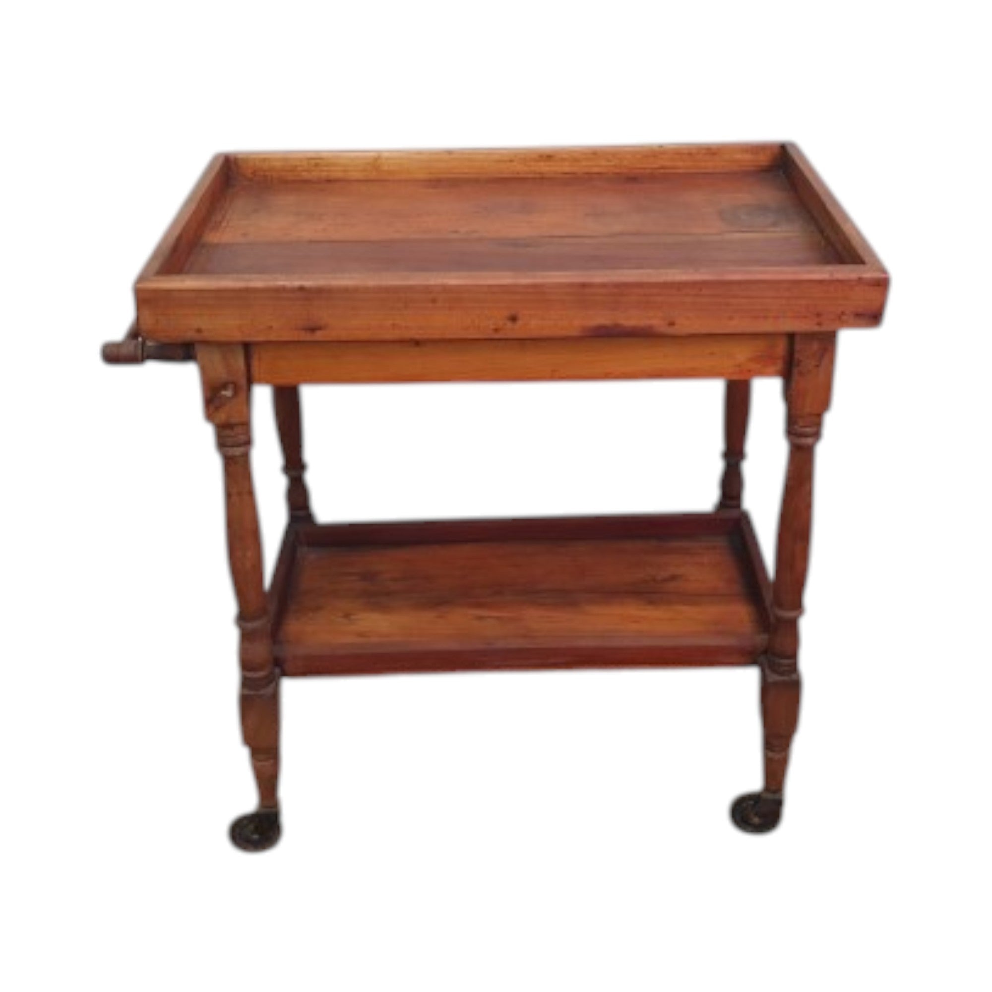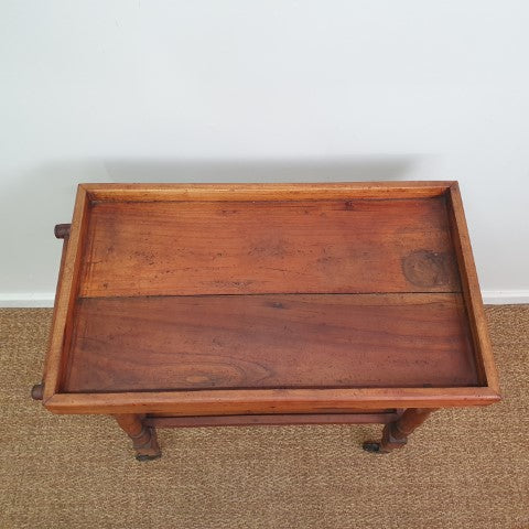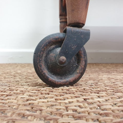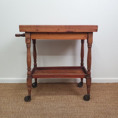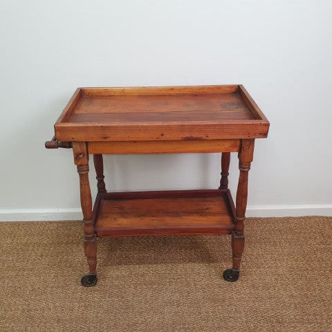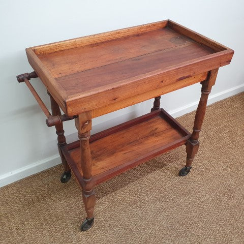 This vintage Australian kauri pine drinks trolley features two tiers and original castors, showcasing the timber’s warm tones and natural grain. Its classic design works well as a bar cart or for displaying decorative items, adding a stylish and functional element to living areas or entertaining spaces.