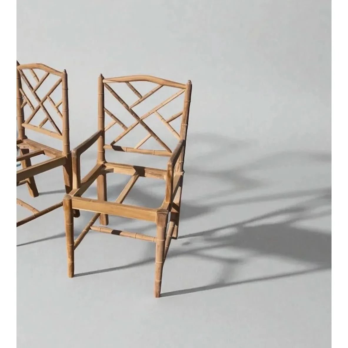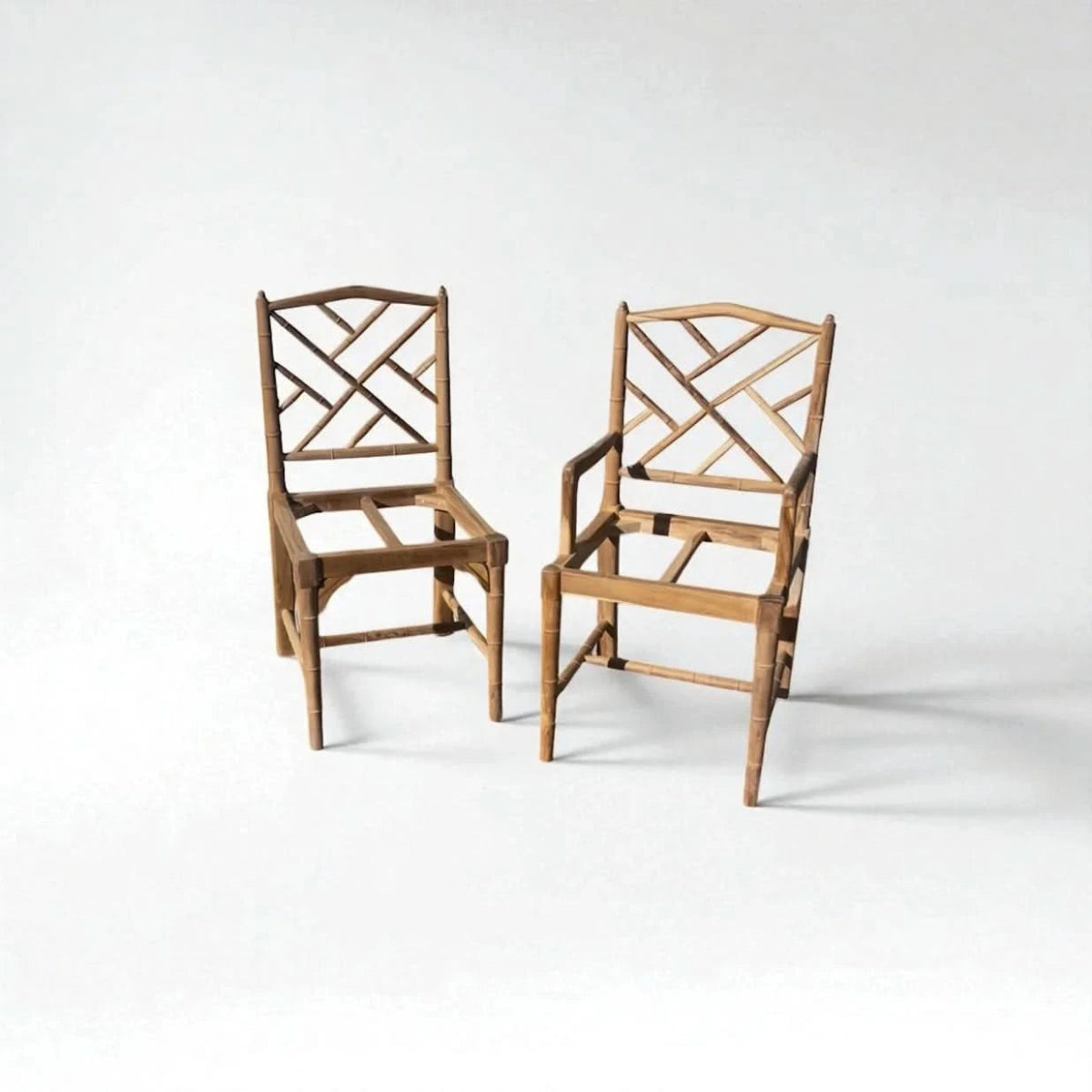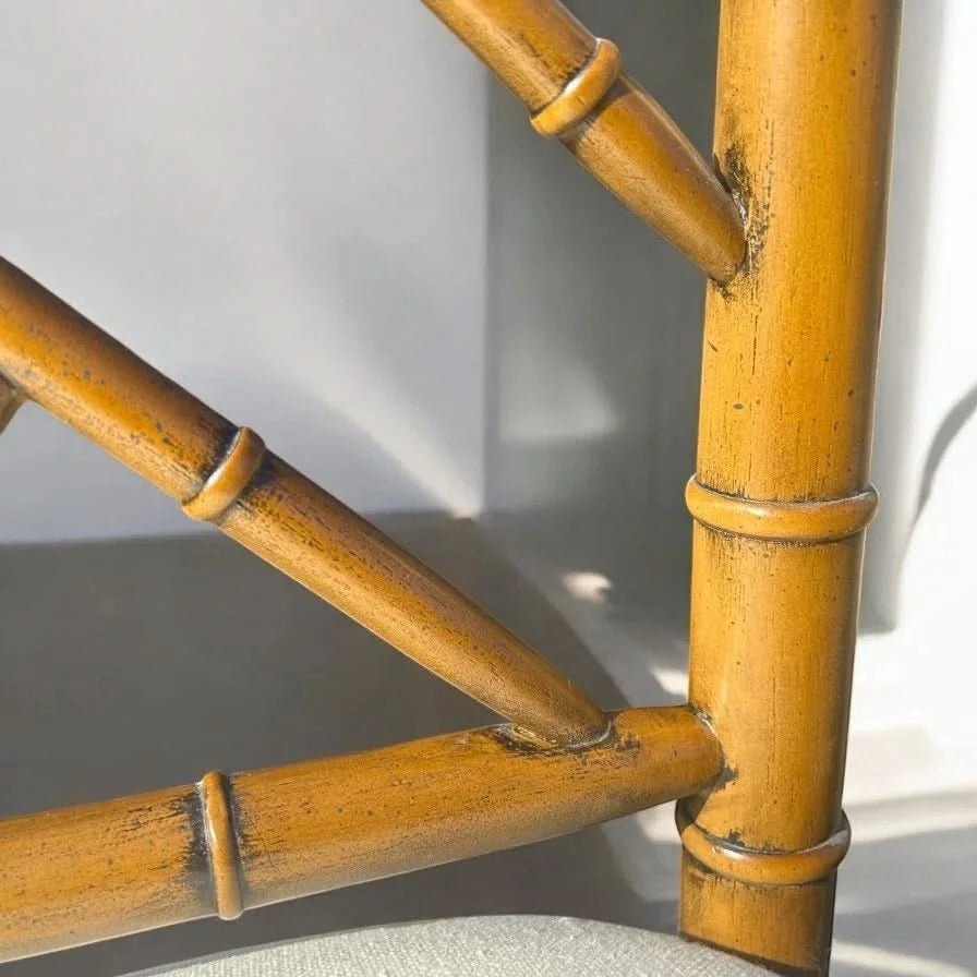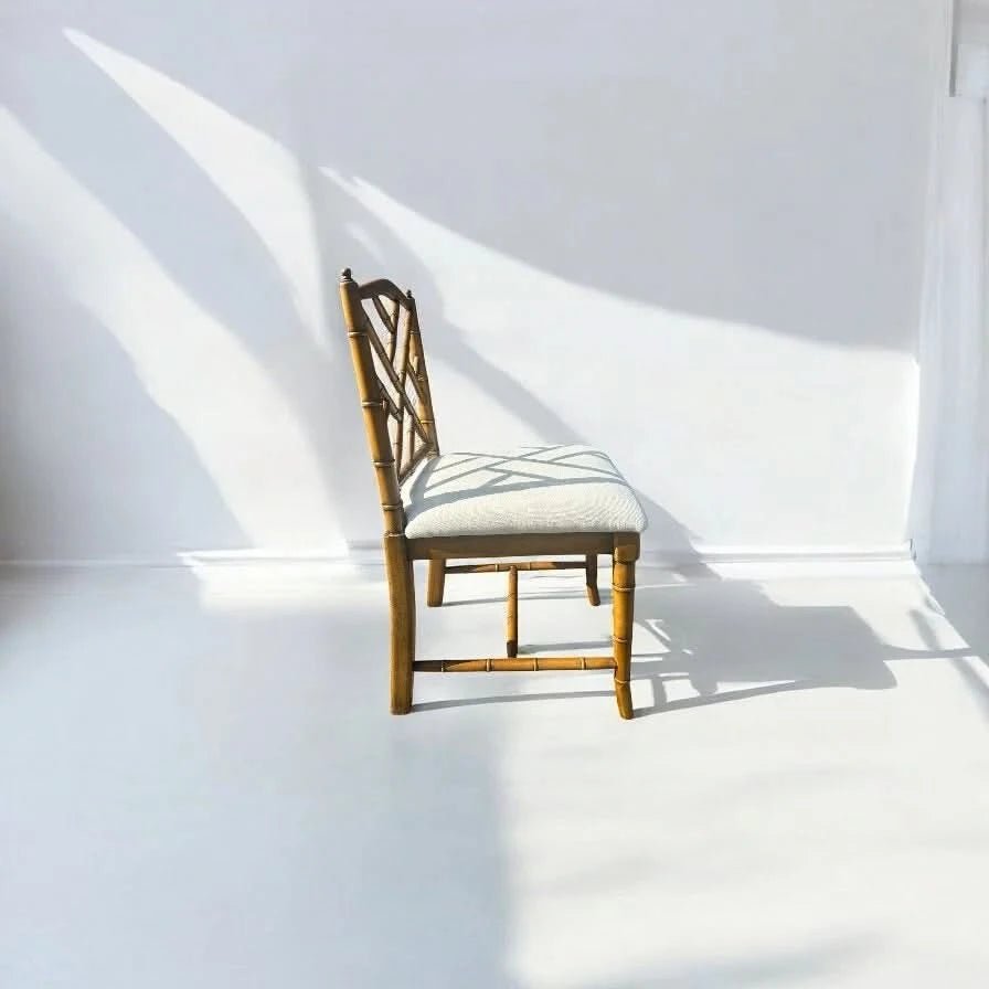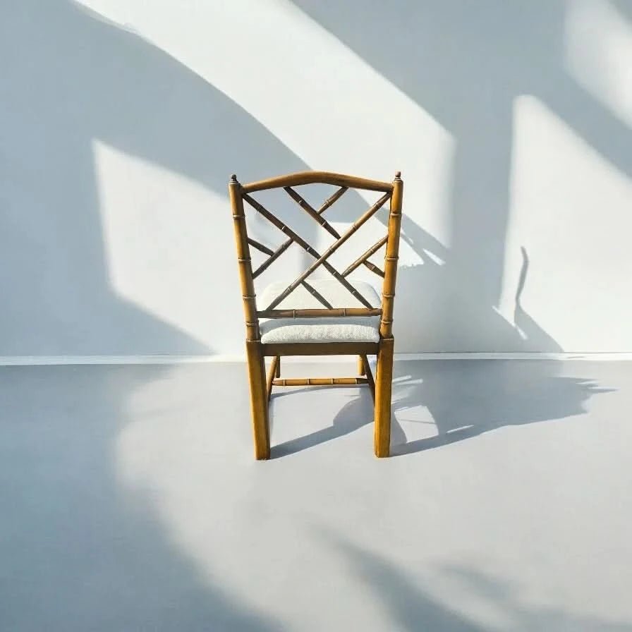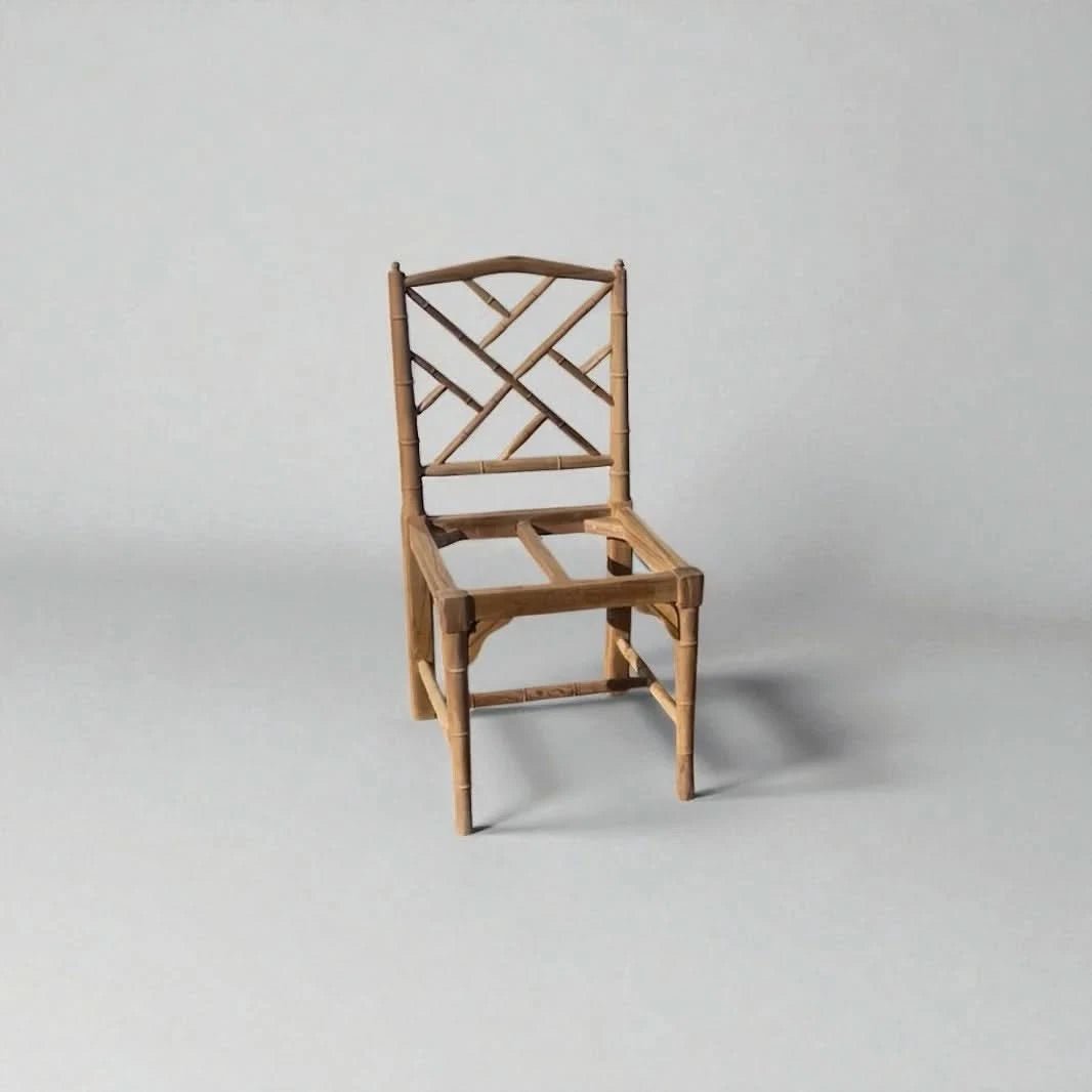 A rare opportunity to create a truly bespoke piece. Available in both a side chair and carver (armchair) design, these vintage timber frames feature an intimate lattice back and faux-bamboo detailing, ready to be finished to your taste.