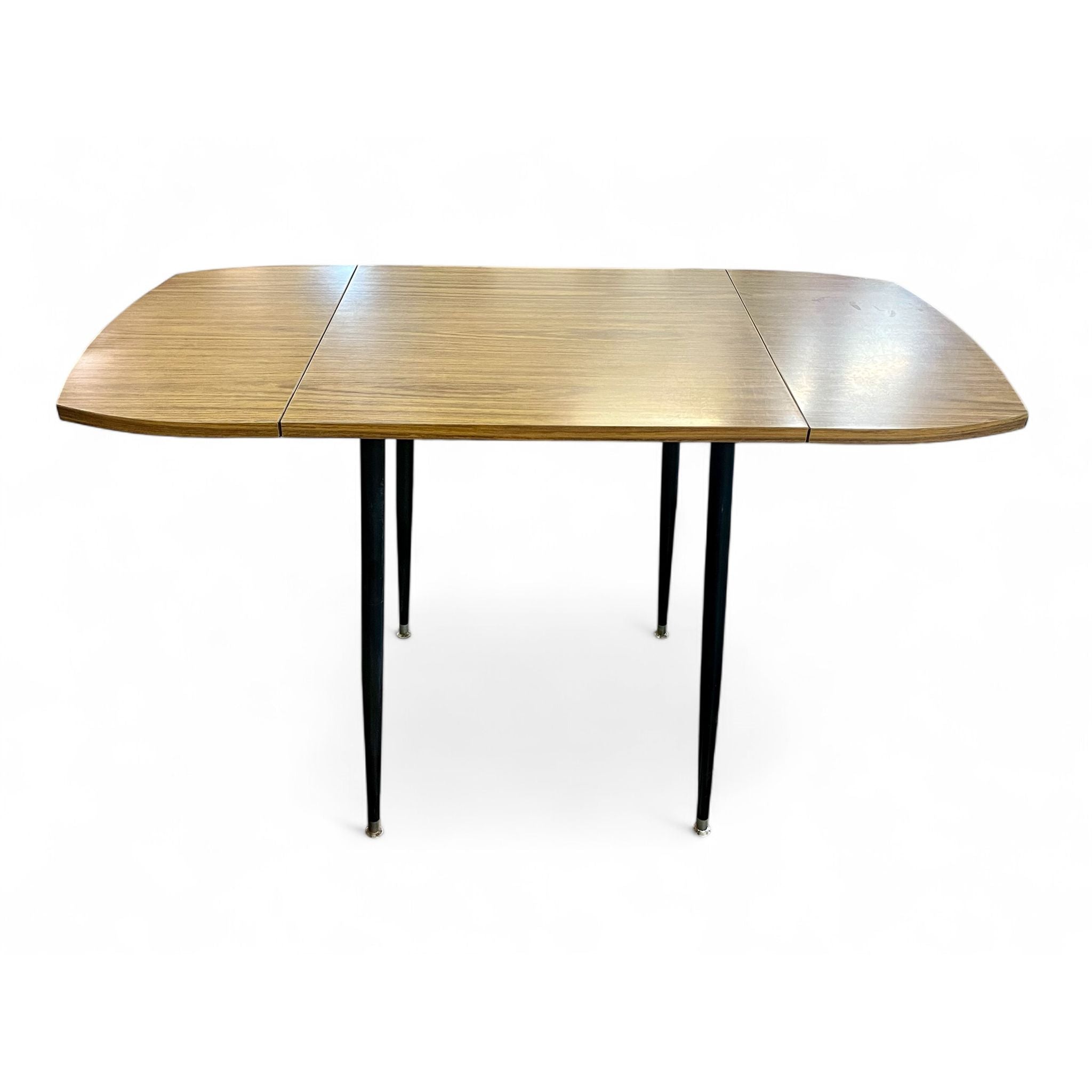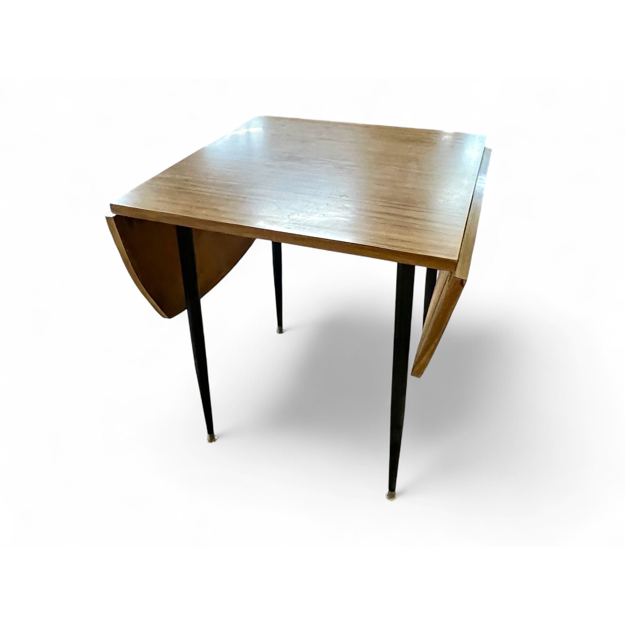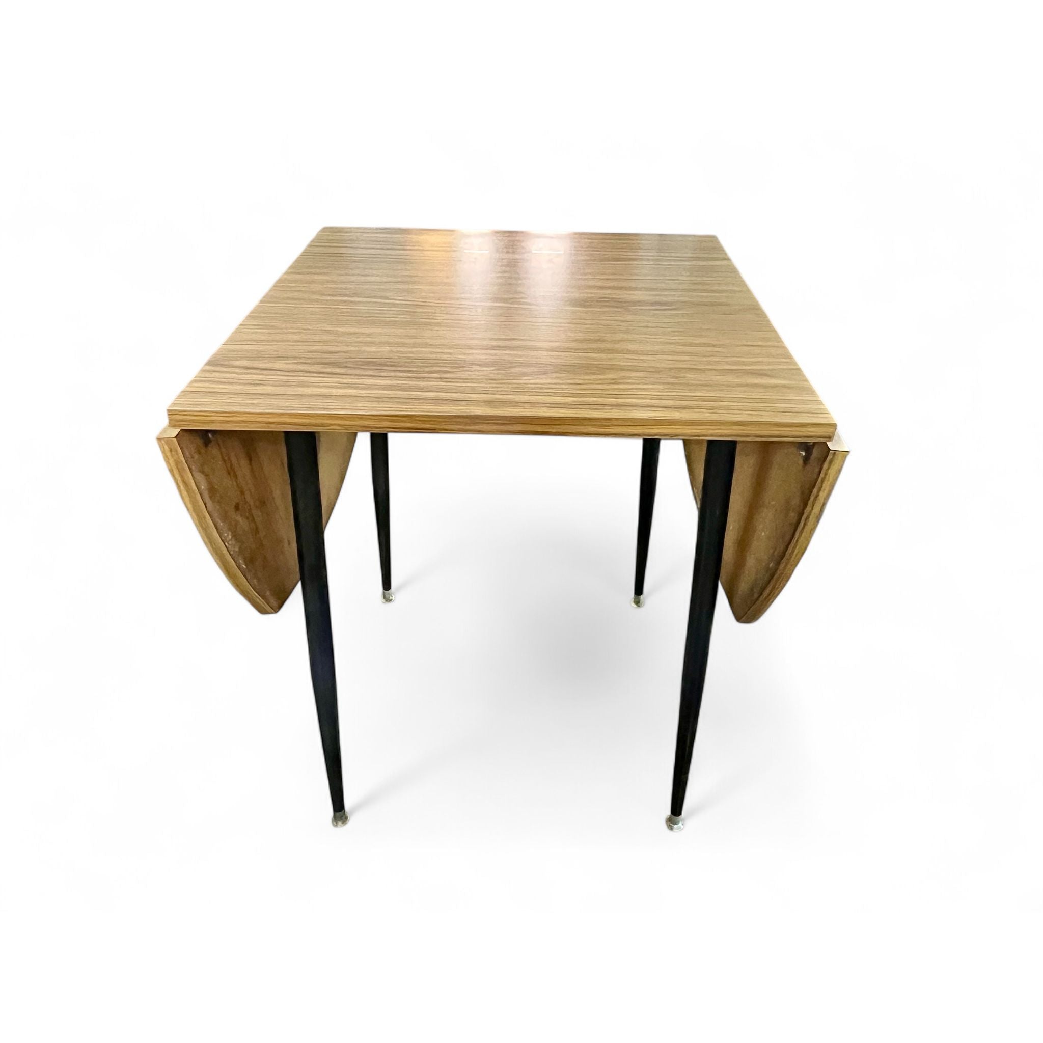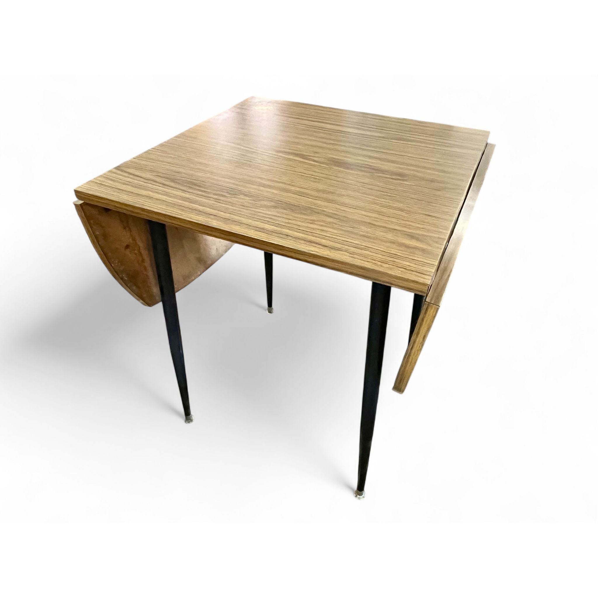 Vintage "NAMCO" laminate drop leaf side table mid-century modern 1970's AUSTRALIA. Medium size, square or rectangular shaped. Dining kitchen table. Brown laminate top, black metal steel tapered legs. Space saving. X3 different sizes. Extend with posts underside table. Mid-century modern style. Stamp on table reads as follows: "Namco Furniture (Vic.) 541 Graham Street Port Melbourne 3207 3 Aug 71". Made in Australia in 1970's. Sourced within the Mornington Peninsula.