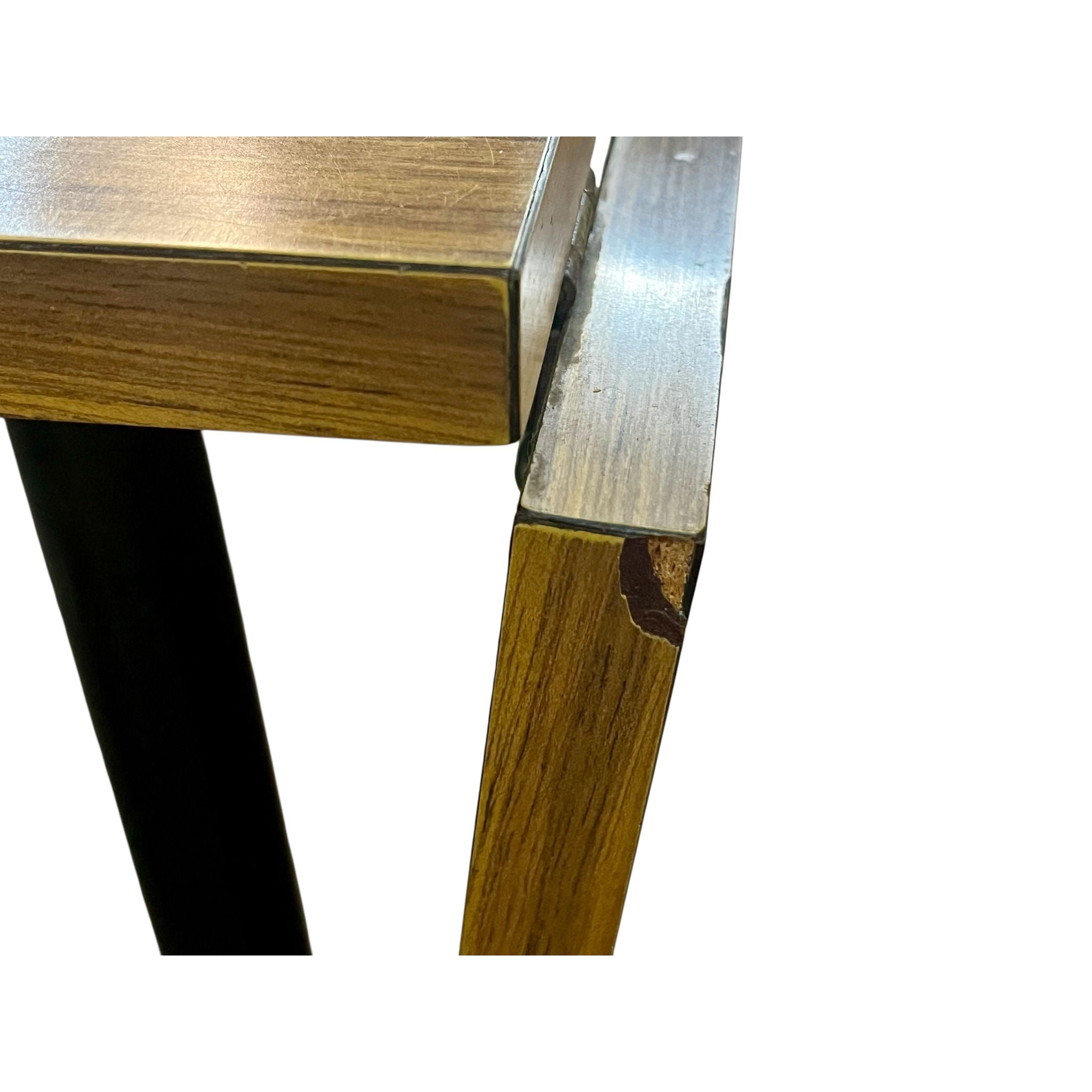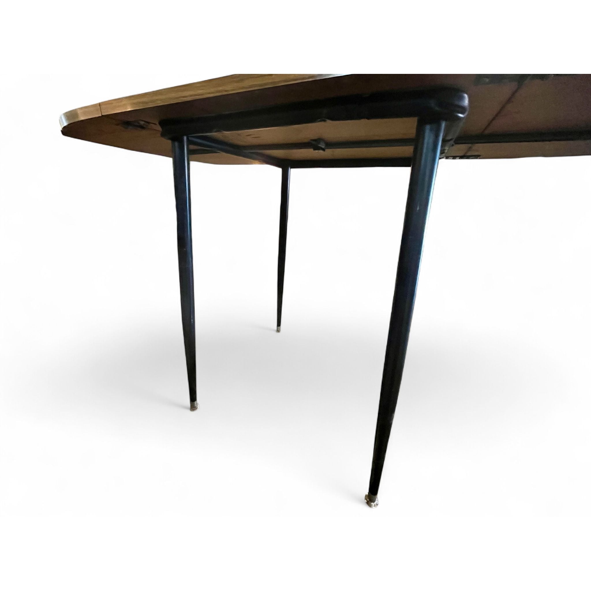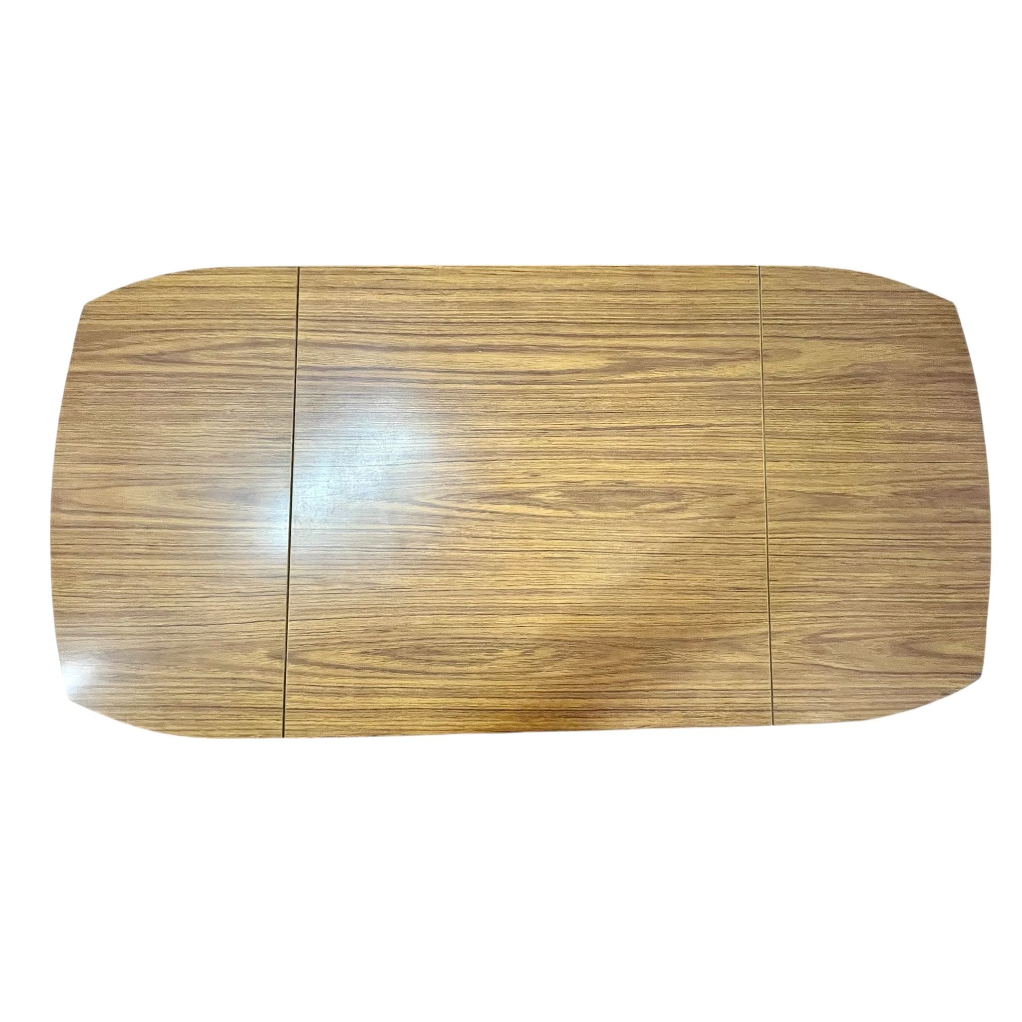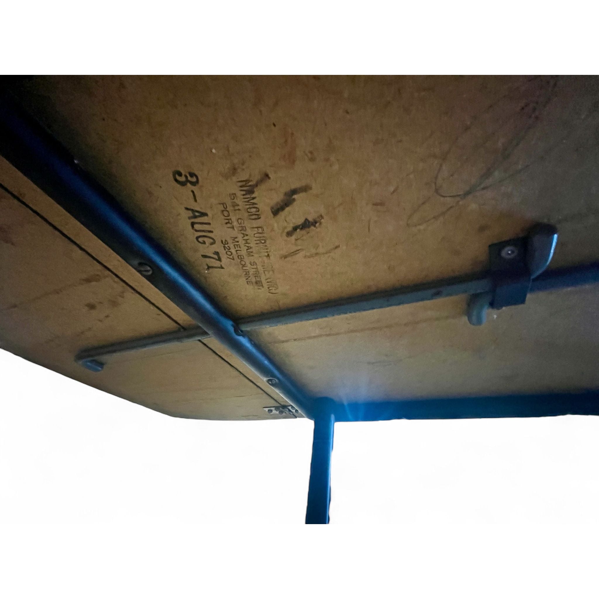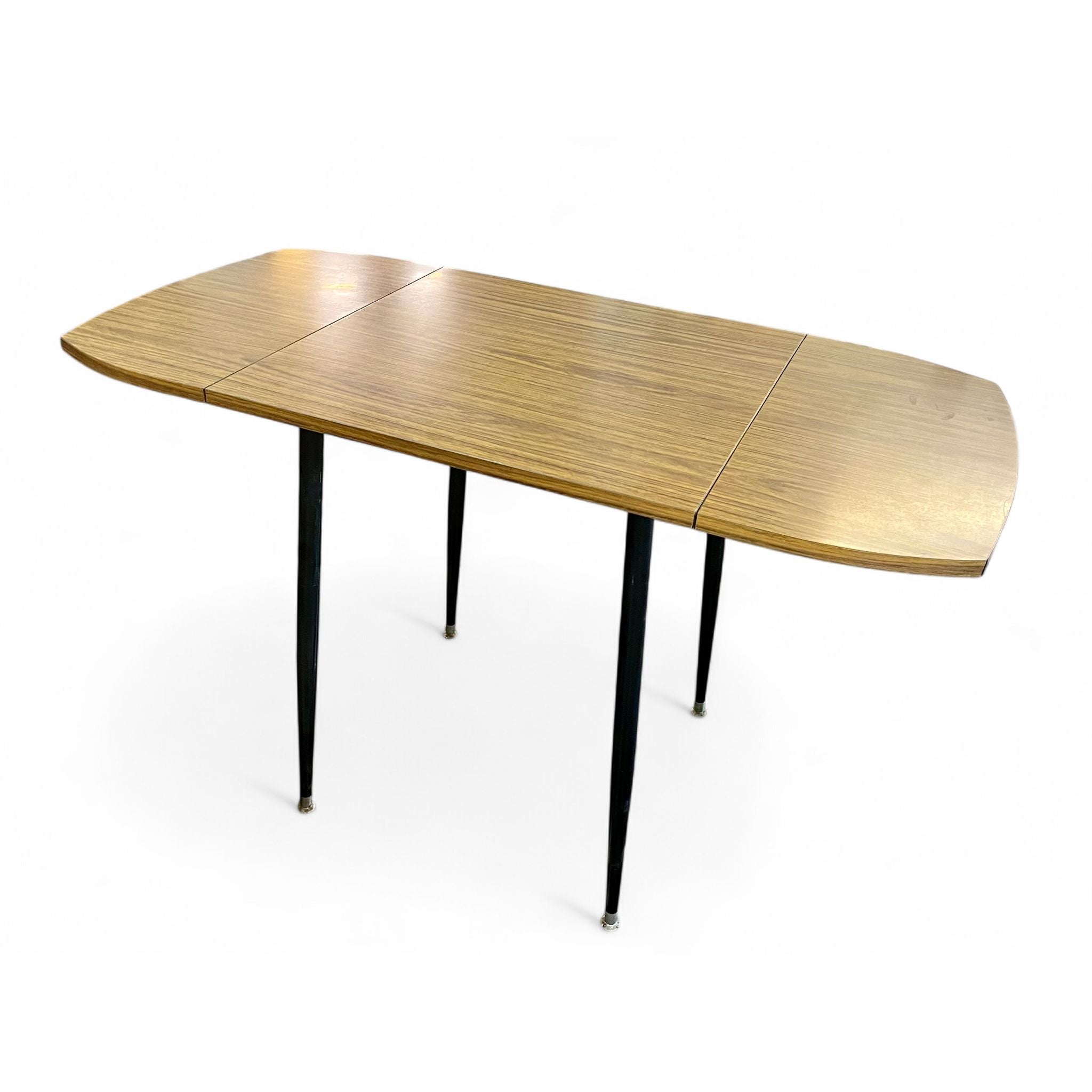 Vintage "NAMCO" laminate drop leaf side table mid-century modern 1970's AUSTRALIA. Medium size, square or rectangular shaped. Dining kitchen table. Brown laminate top, black metal steel tapered legs. Space saving. X3 different sizes. Extend with posts underside table. Mid-century modern style. Stamp on table reads as follows: "Namco Furniture (Vic.) 541 Graham Street Port Melbourne 3207 3 Aug 71". Made in Australia in 1970's. Sourced within the Mornington Peninsula.