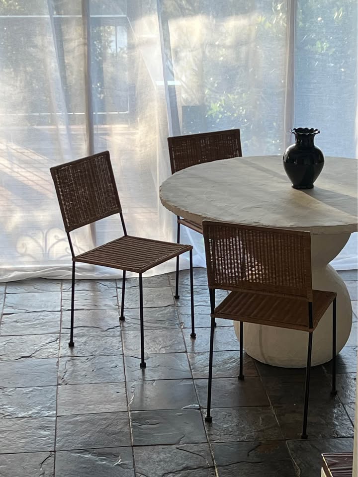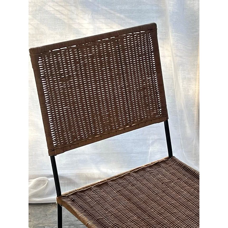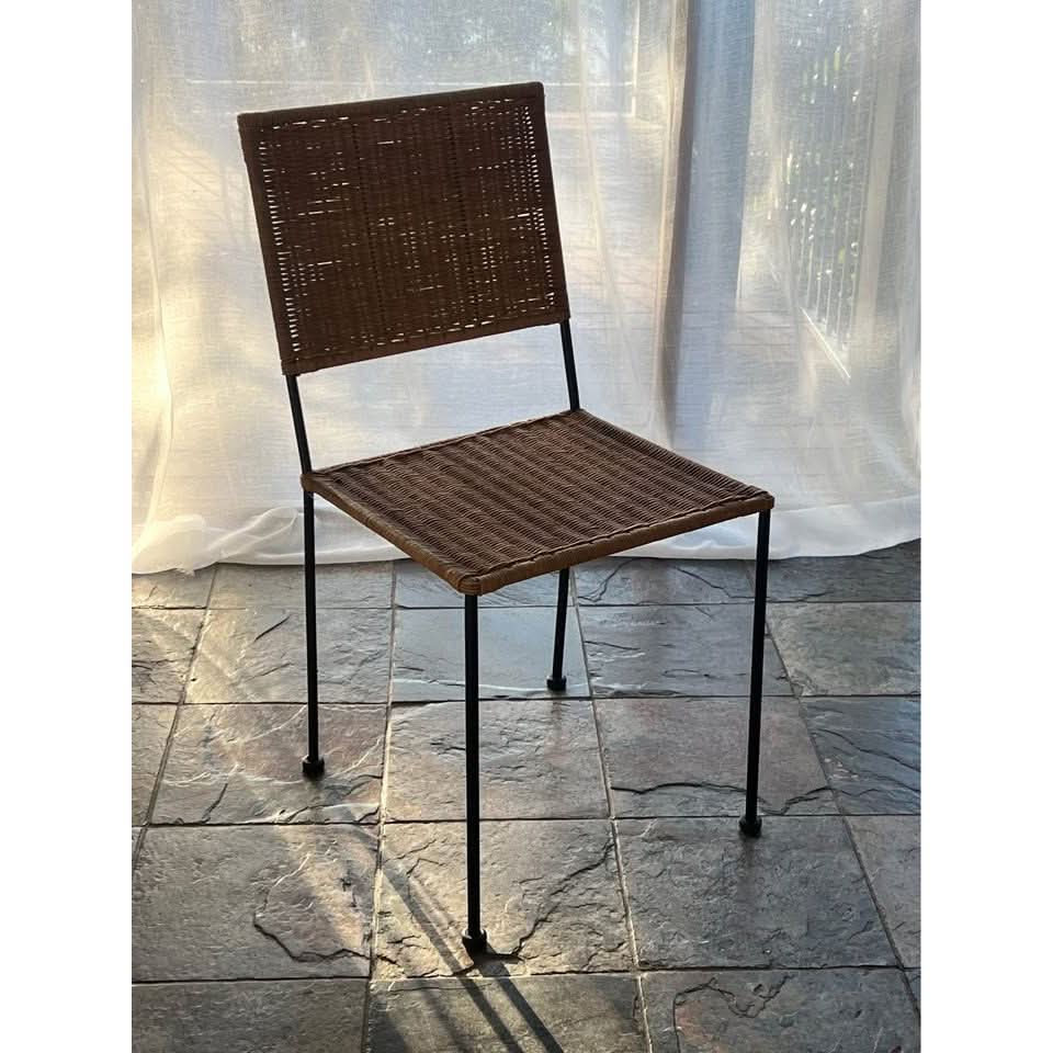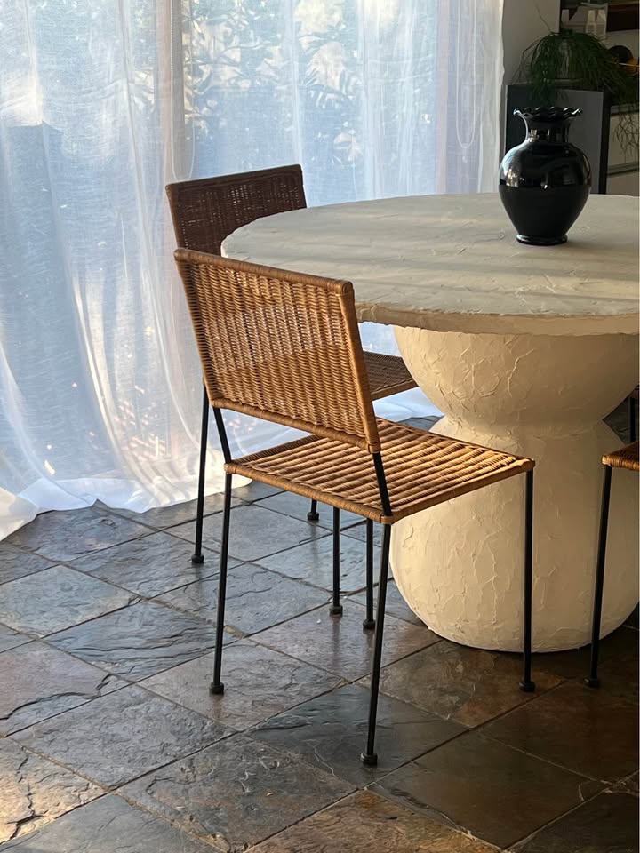 Timeless vintage Mediterranean style wicker dining chairs with a square motif.