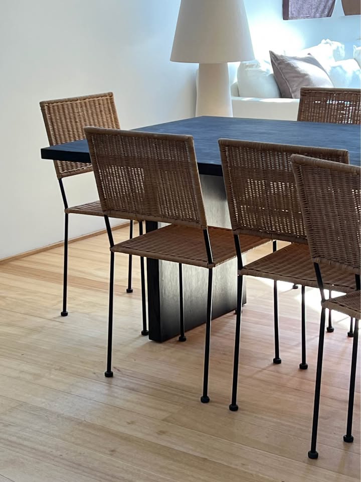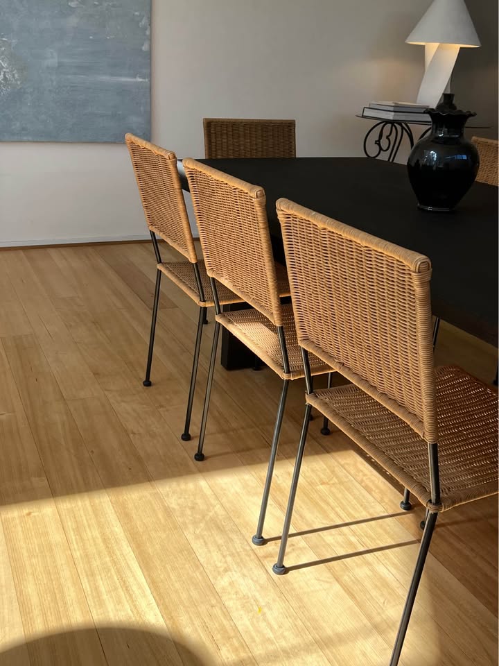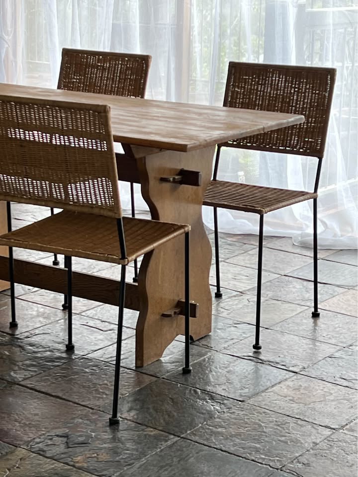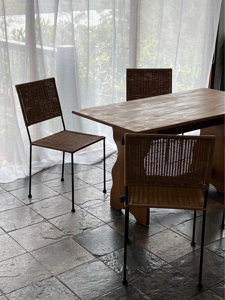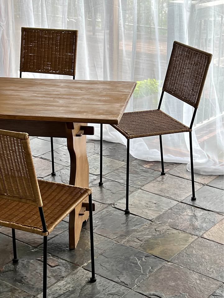 Timeless vintage Mediterranean style wicker dining chairs with a square motif.
