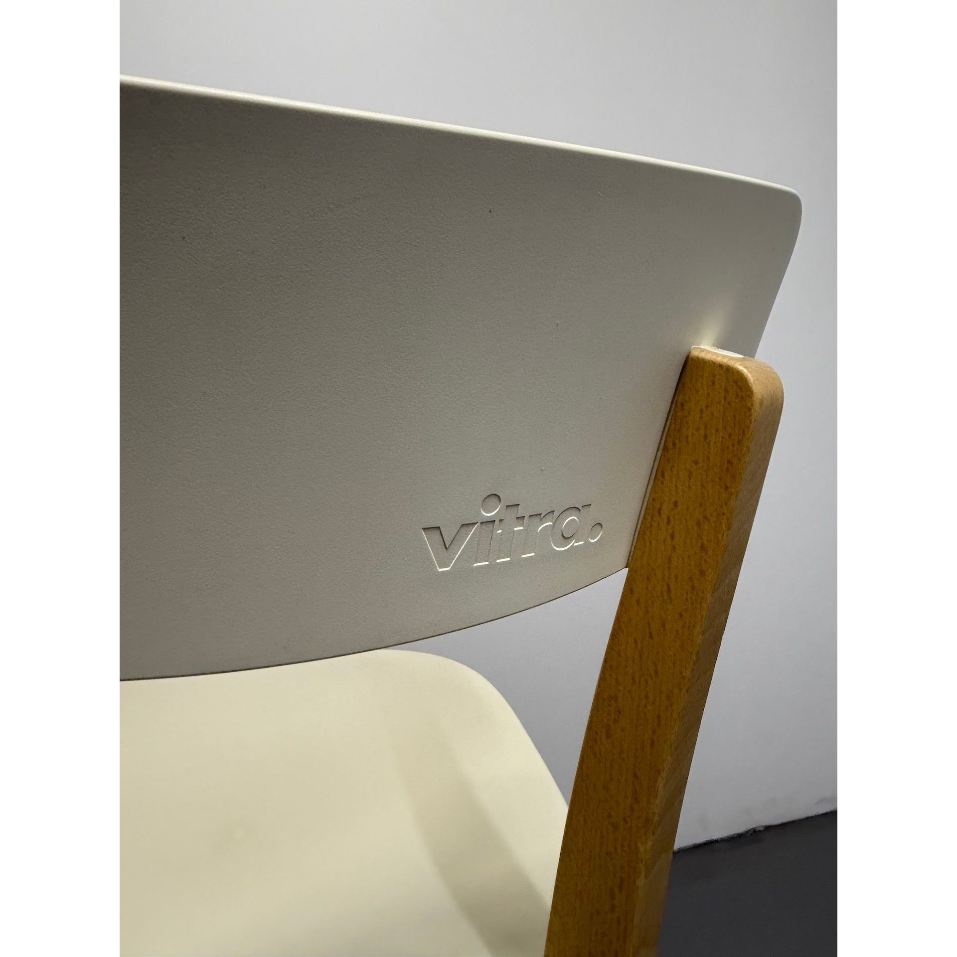 This version pairs a solid beechwood frame with a moulded plastic seat and backrest in white, combining warmth and durability with a contemporary edge.