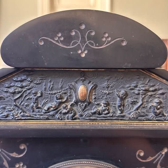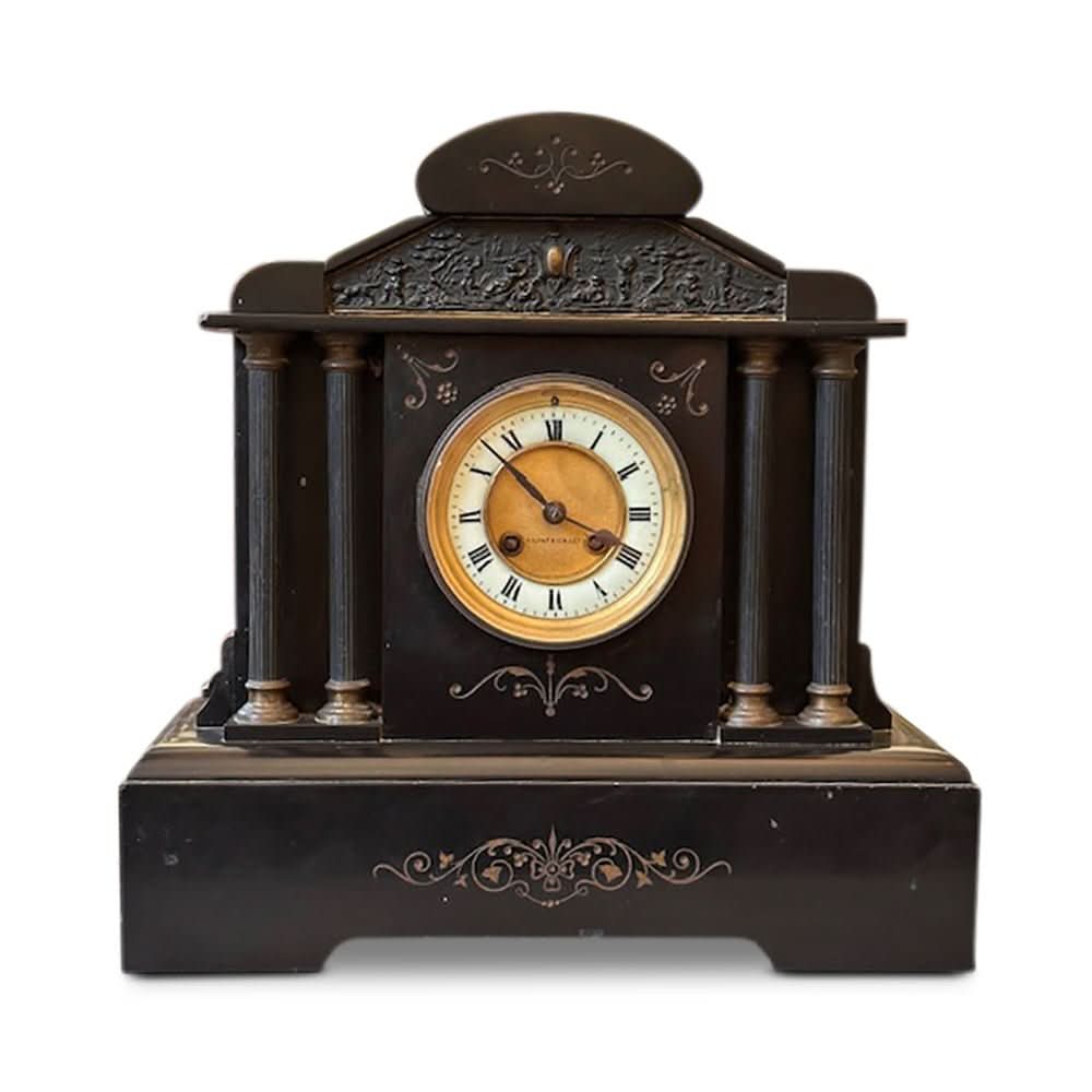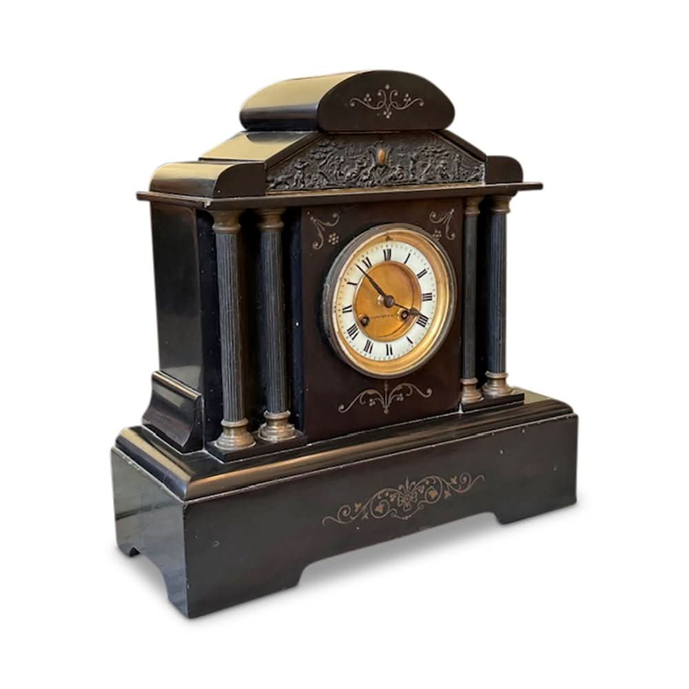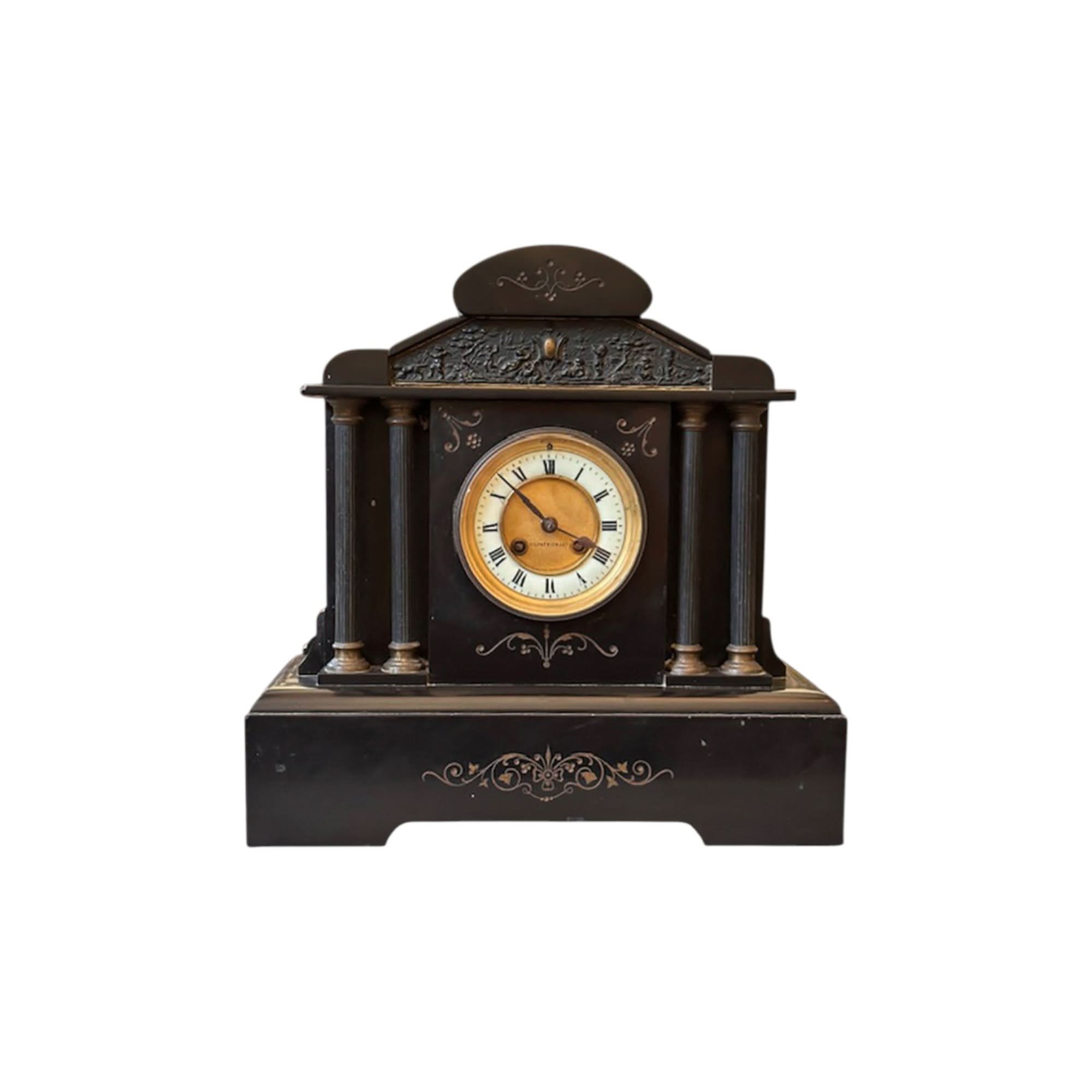 Crafted in France in the late 19th century, the clock is a heavy slate with a commanding stature. It is flanked by 2 columns on each side, and features brass mounts. It is beautifully decorated with scrolling motifs and a sweet embossed scene to the crown.