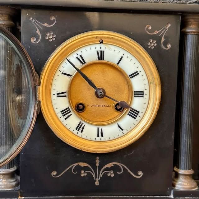 The dial is stunning with clear roman numerals, a gilt centre, and black enamel hands. It is crafted with an 8 day movement. The maker of this lovely piece is Kilpatric & Co.
