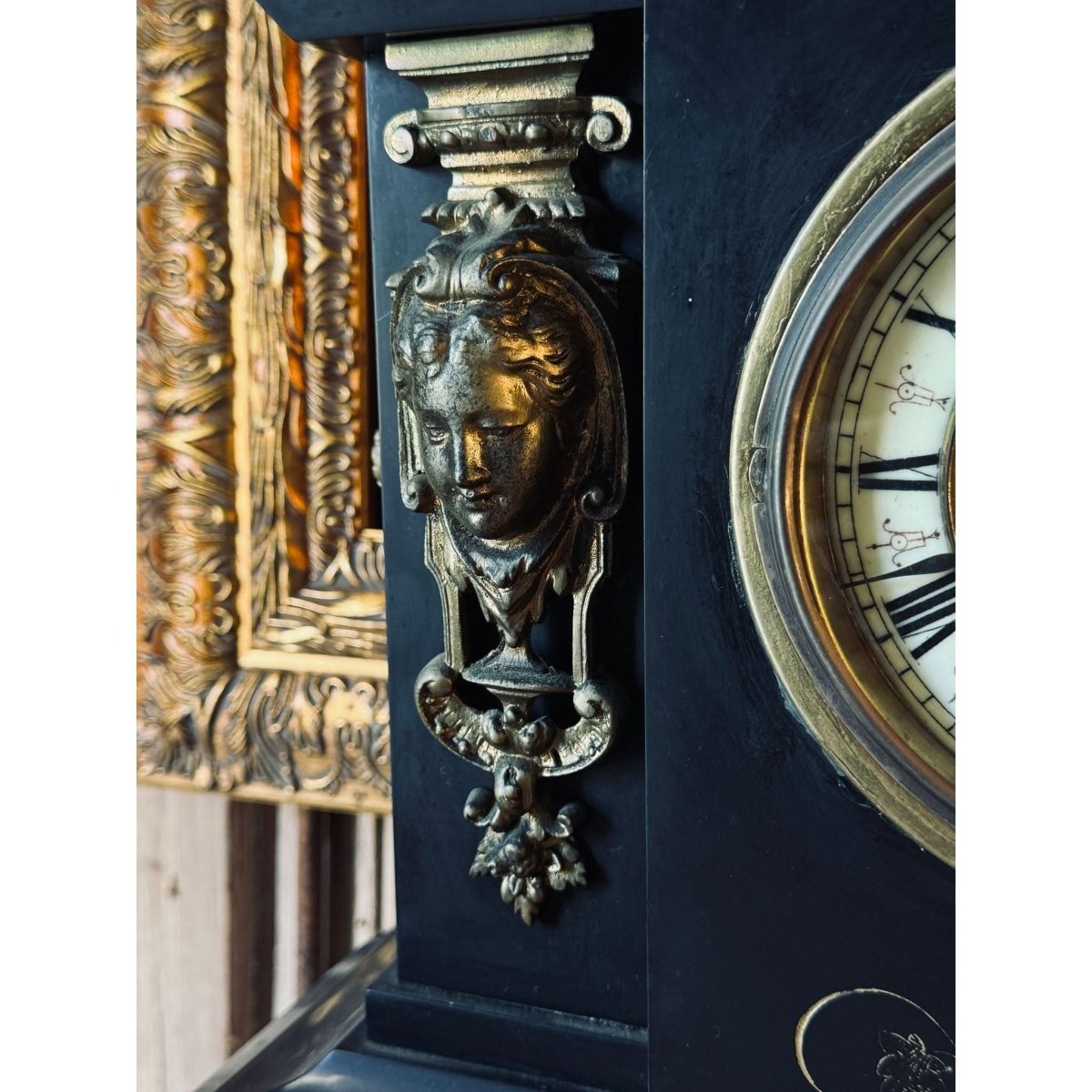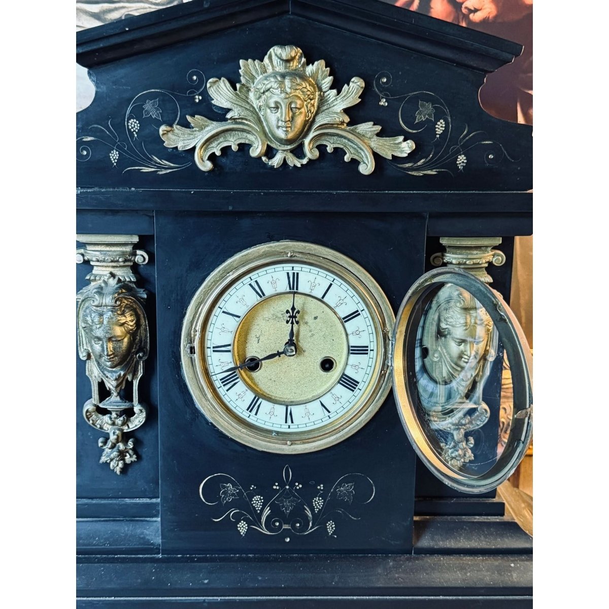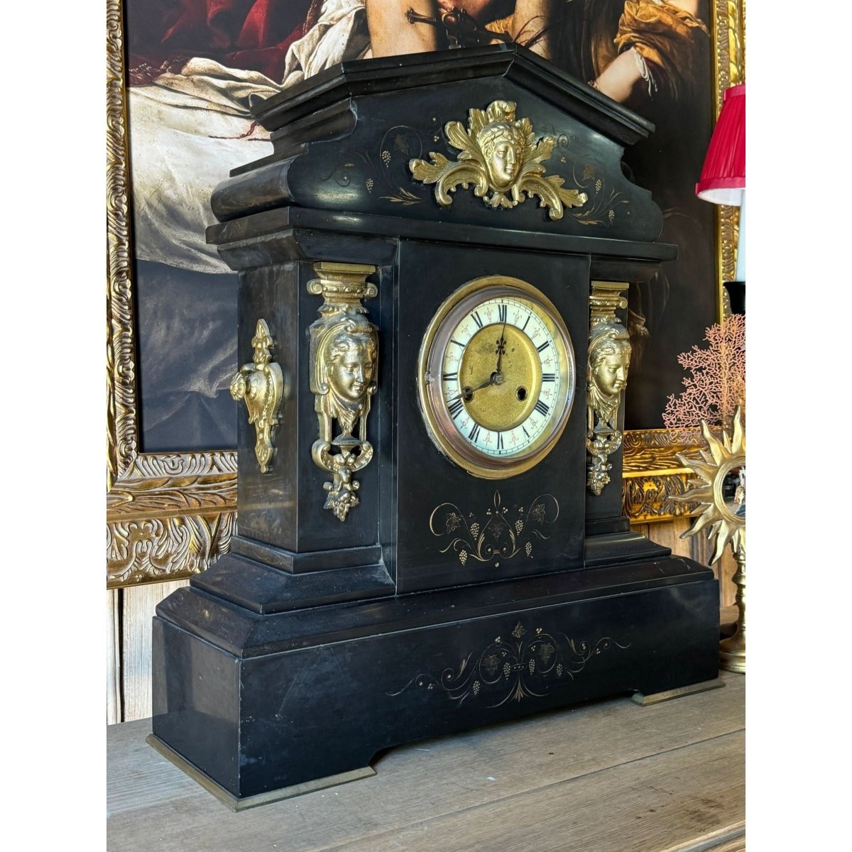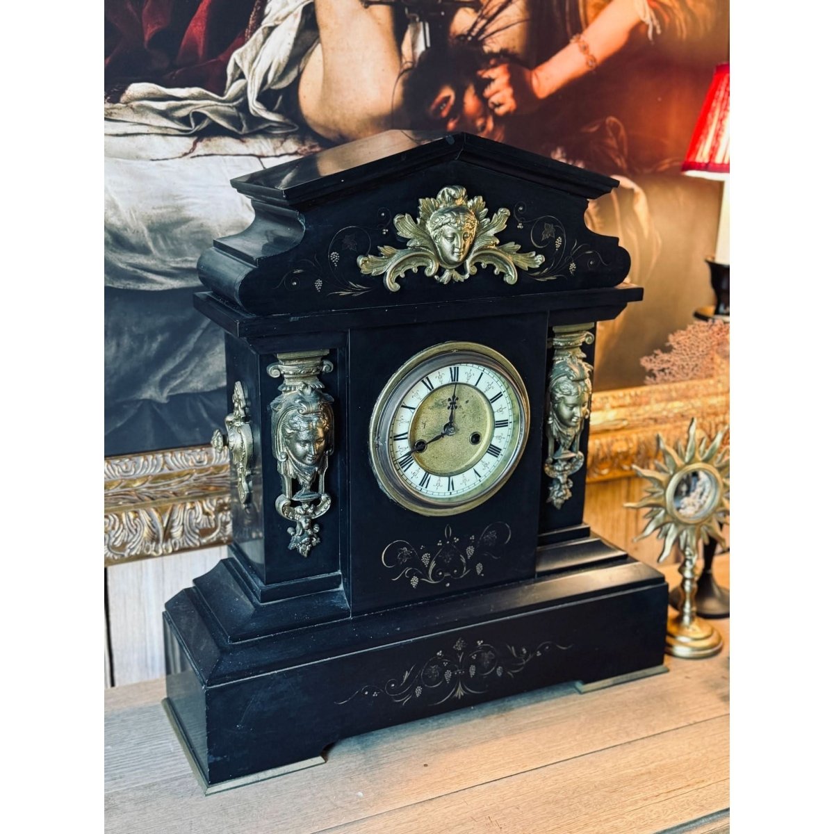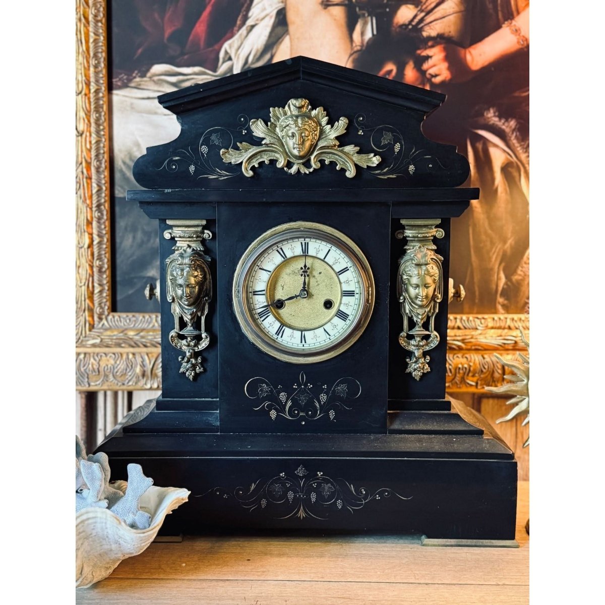 A beautiful large, late 19th century French antique black slate mantel clock with ormolu mask heads and intricate carved details. Clock face features porcelain dial and roman numerals.