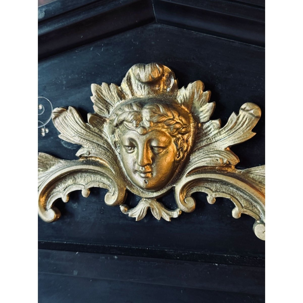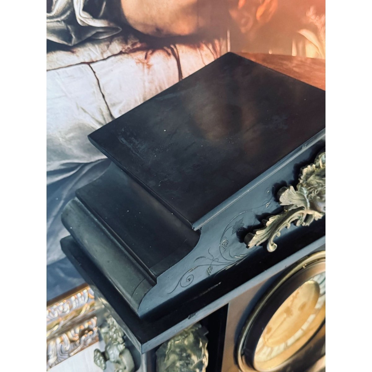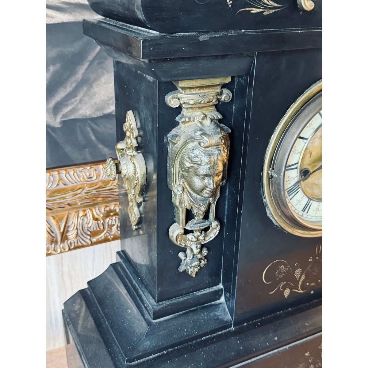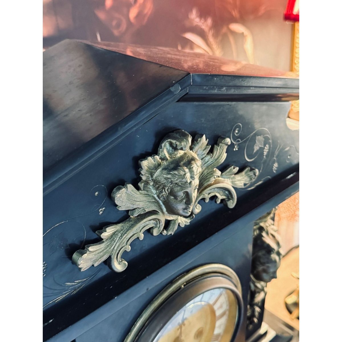 A beautiful large, late 19th century French antique black slate mantel clock with ormolu mask heads and intricate carved details. Clock face features porcelain dial and roman numerals.