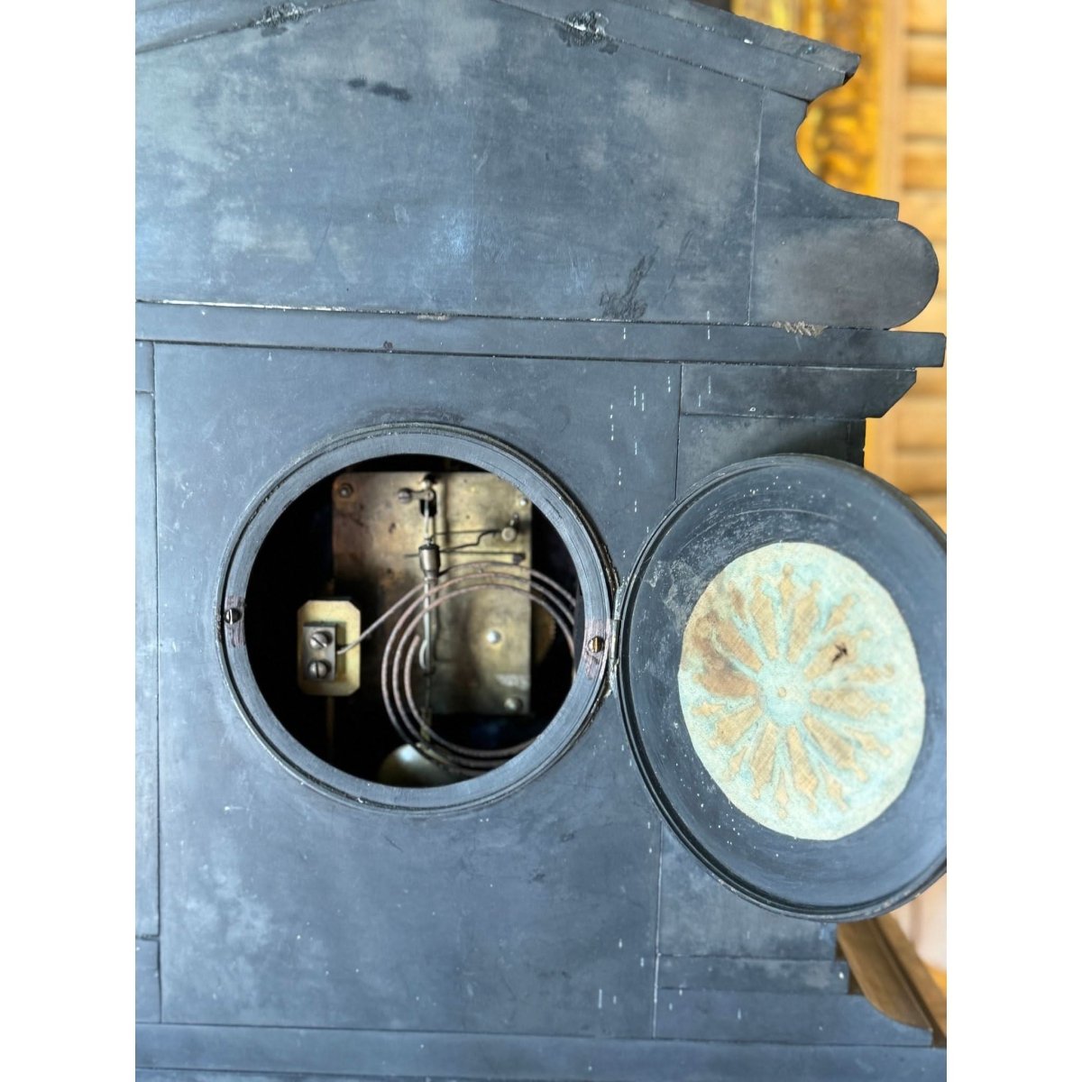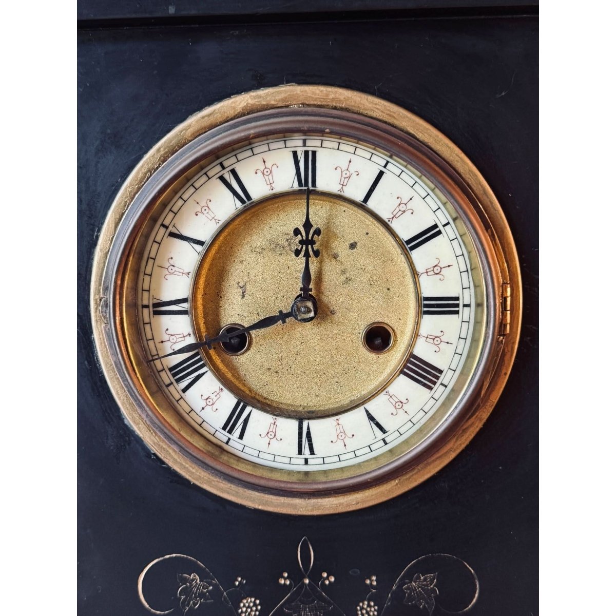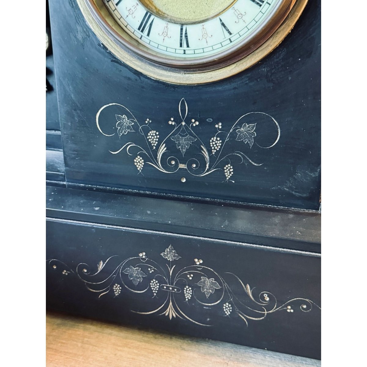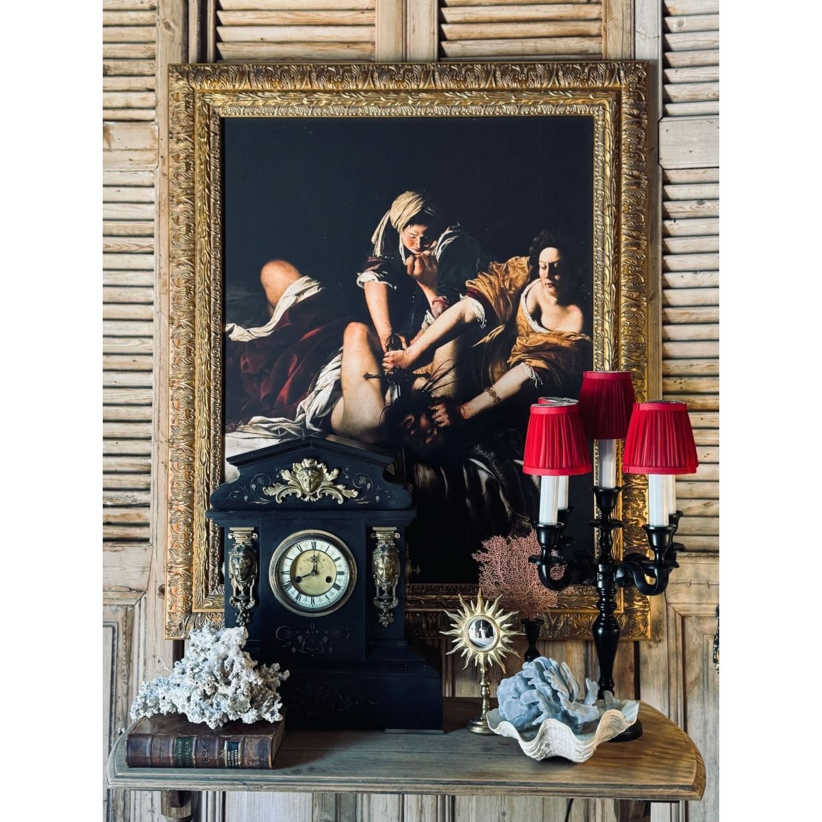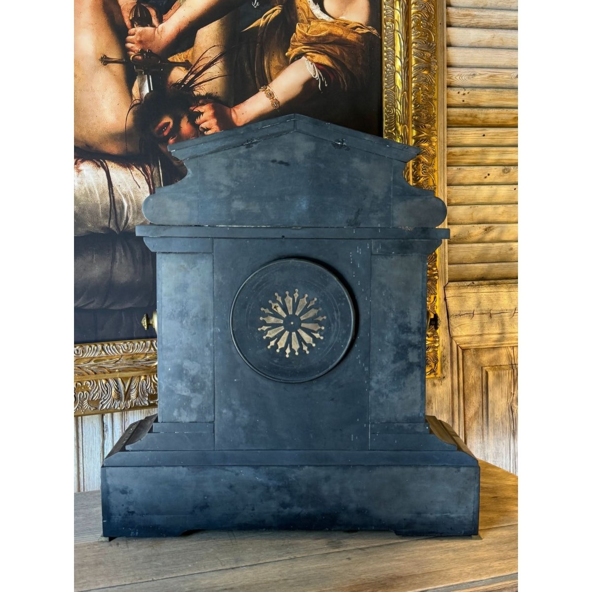 A beautiful large, late 19th century French antique black slate mantel clock with ormolu mask heads and intricate carved details. Clock face features porcelain dial and roman numerals.