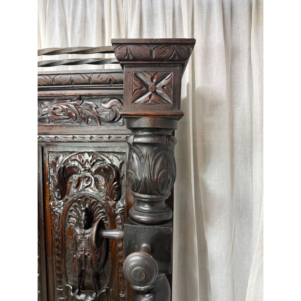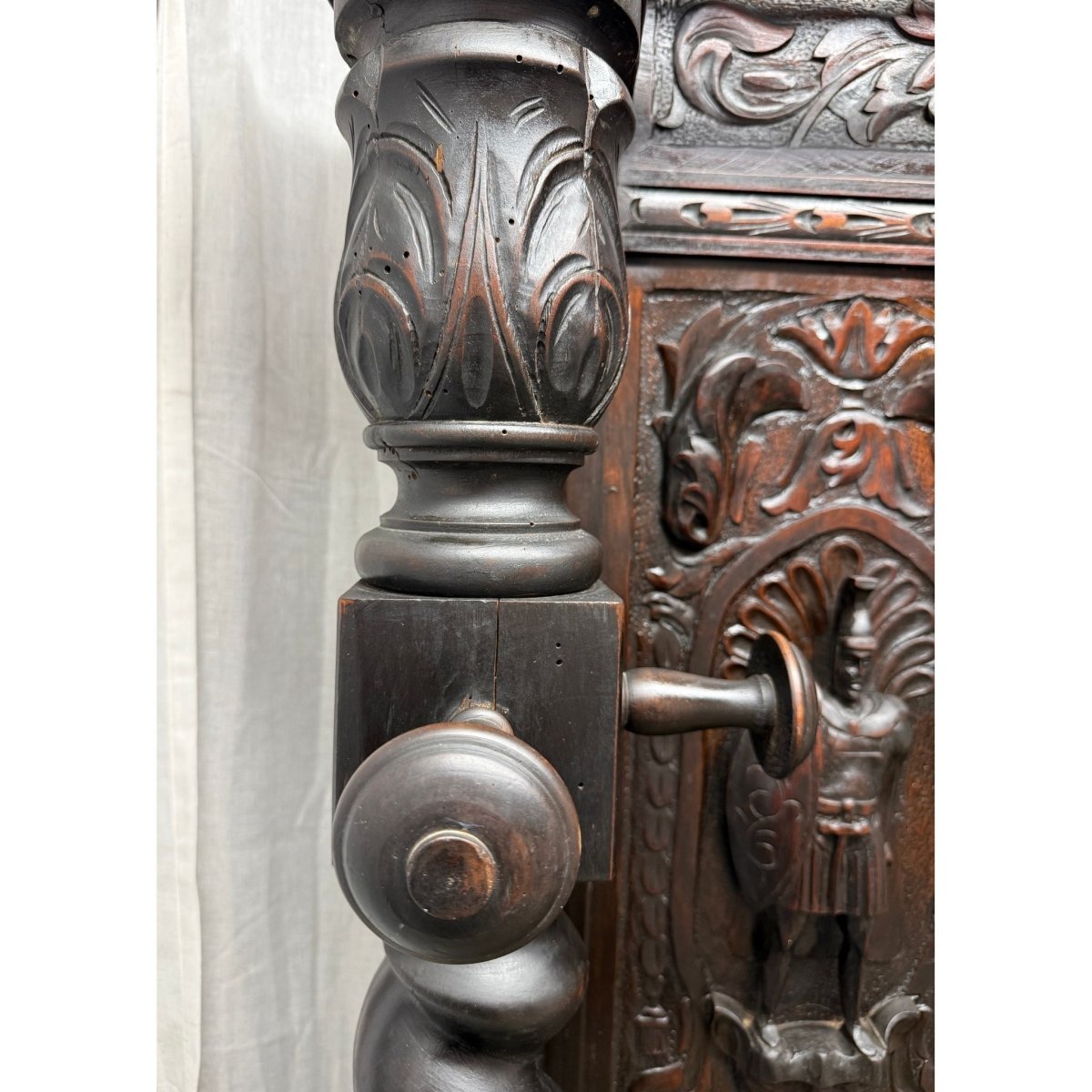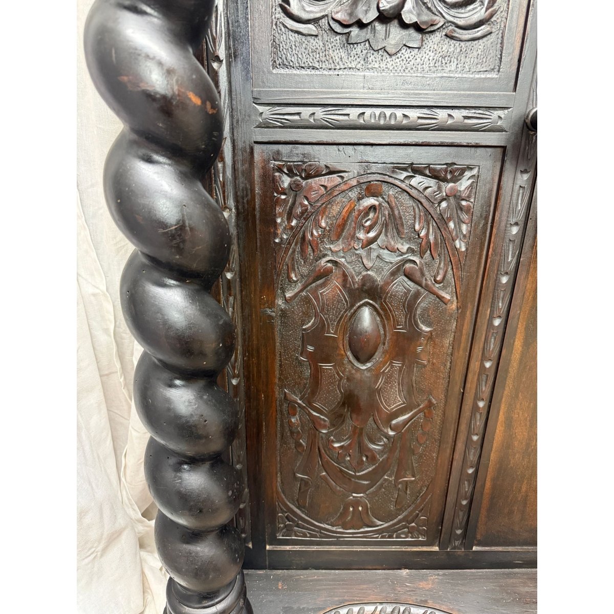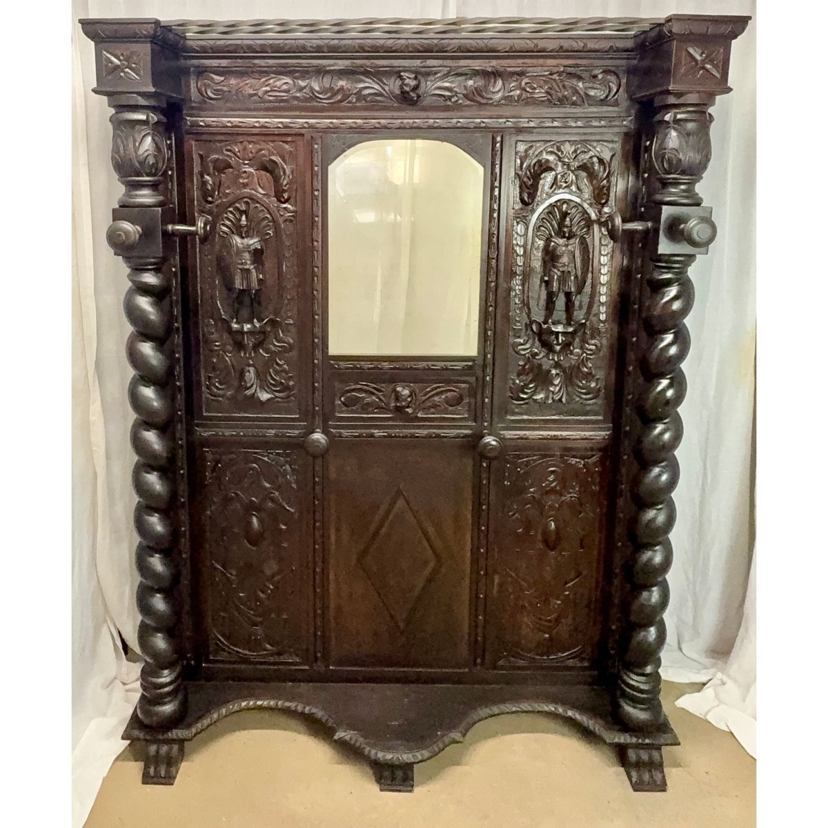 Featuring a mix of classical and mythical carved motifs throughout this is truly an unusual piece. It is carved from oak, still has its original mirror and has two twisted cast iron rods running horizontally across the top.