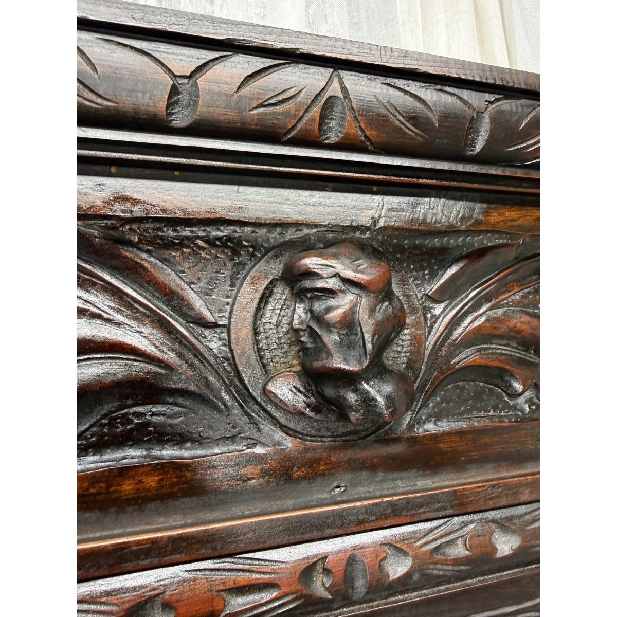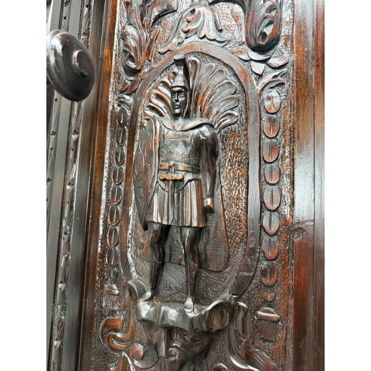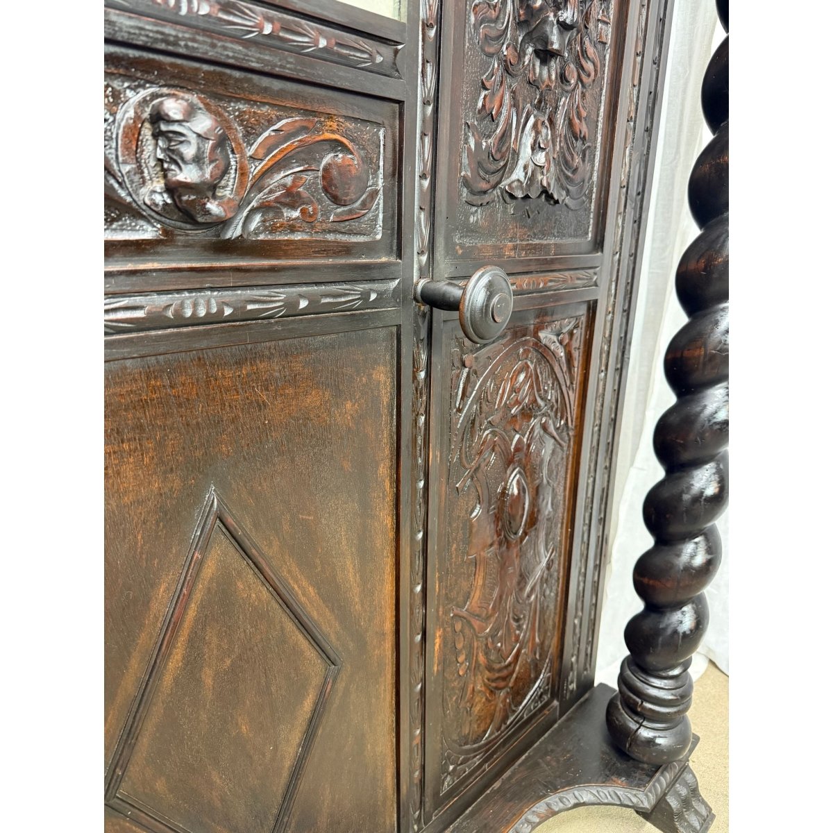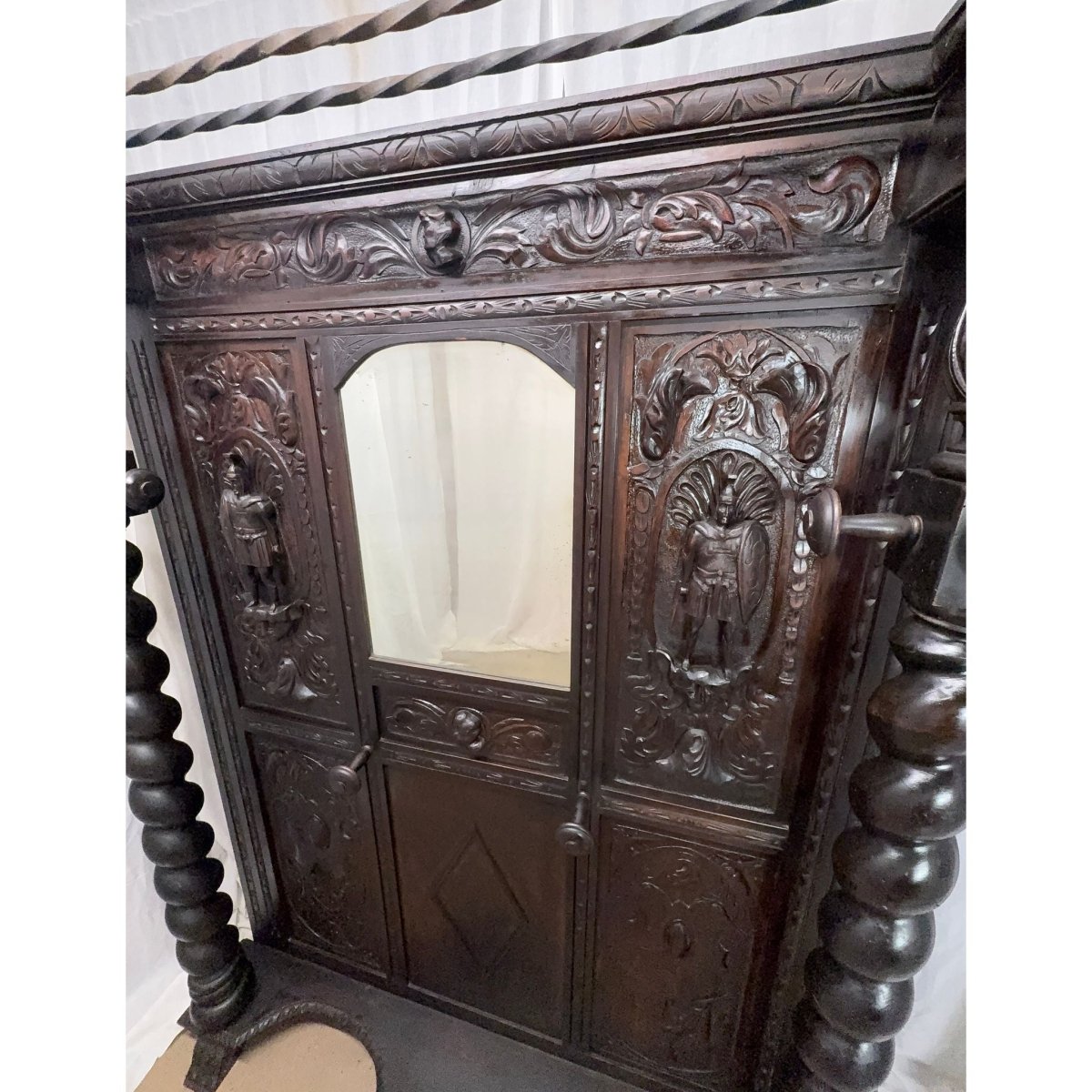 Featuring a mix of classical and mythical carved motifs throughout this is truly an unusual piece. It is carved from oak, still has its original mirror and has two twisted cast iron rods running horizontally across the top.