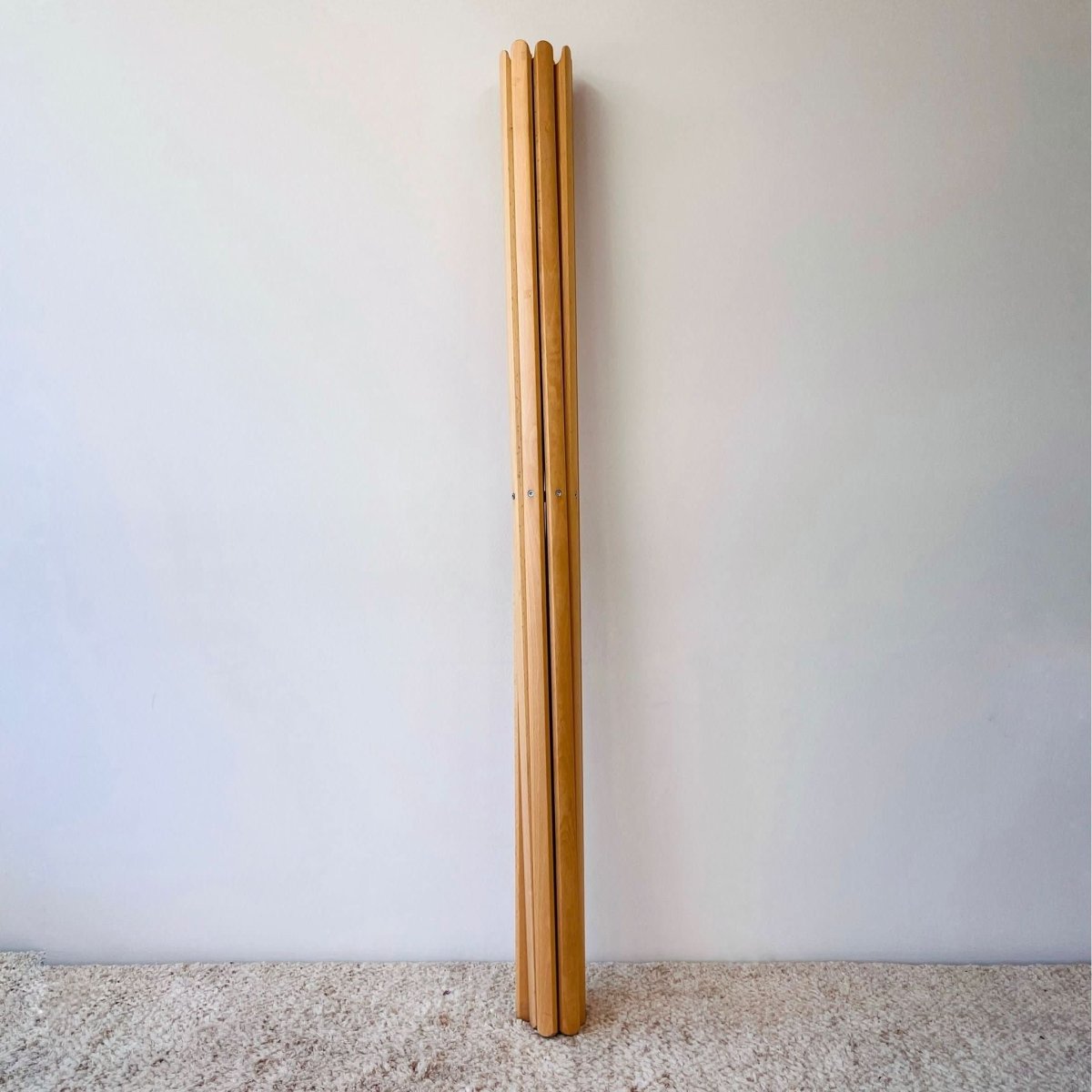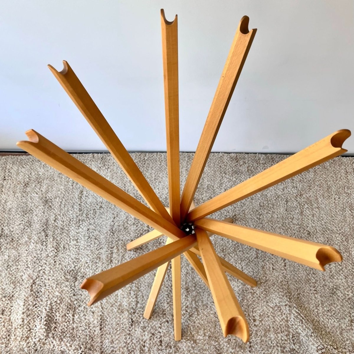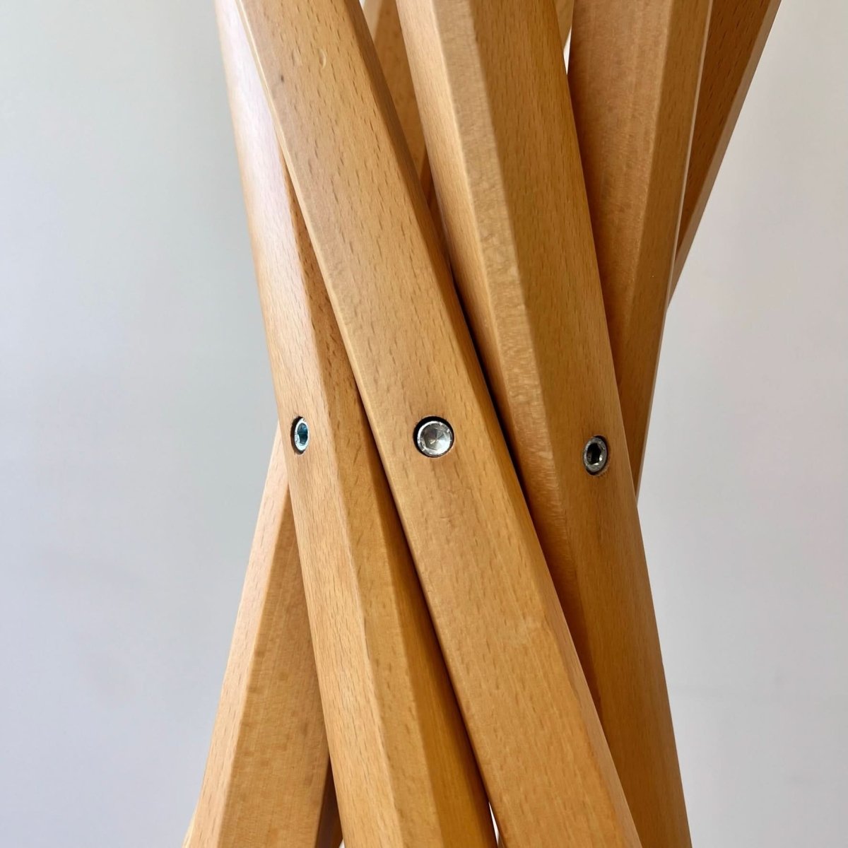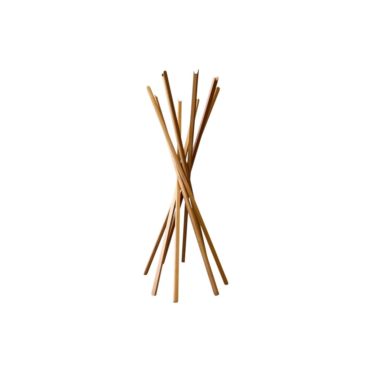 The Sciangai folding coat stand by Italian furniture brand Zanotta, with it's strikingly recognisable silhouette, is a iconic design piece. Inspiration for Sciangai was the Chinese game where wooden sticks are held in the hand and then dropped onto a table. Amazing in its simplicity, it won the Compasso d’Oro Award in 1979. This coat stand can be easily closed up and open effortlessly into an elegant sculptural form. Each pole is delicately notched in the top to hang coats, hats, or other pieces of clothing. All the elements are connected right above the middle. This allows for a wide base that ensures stability.