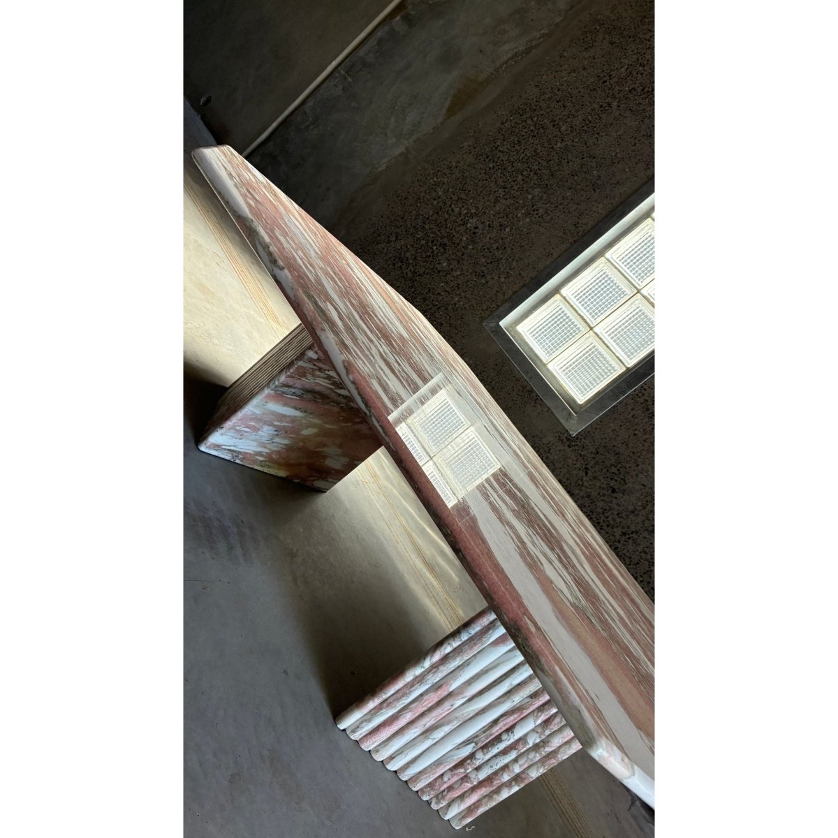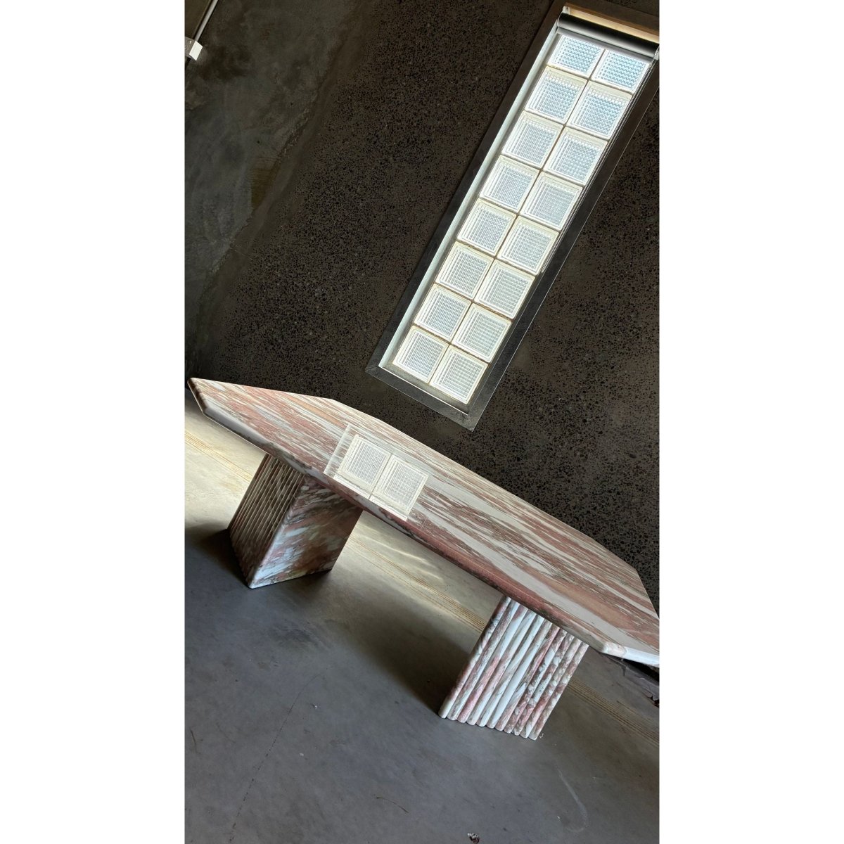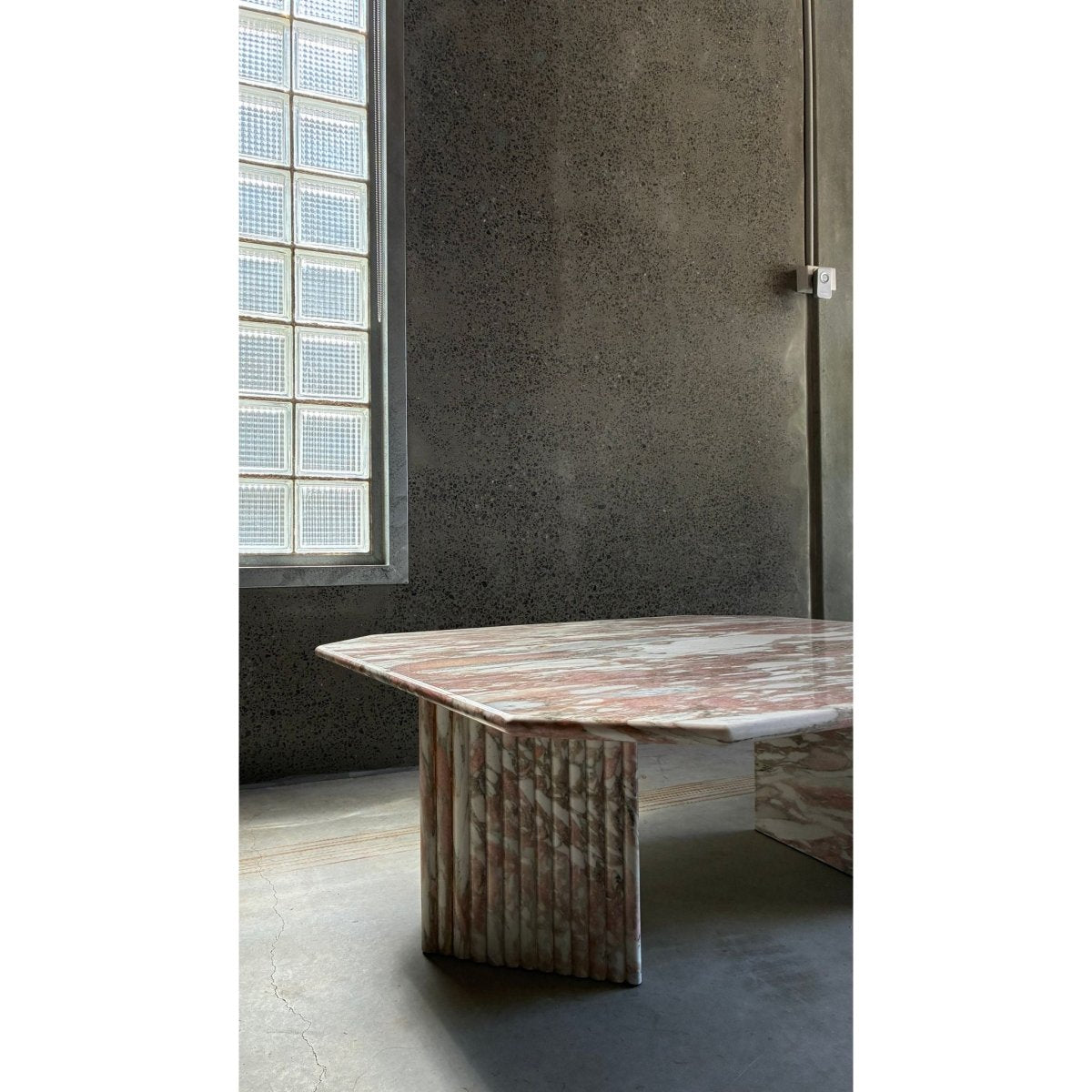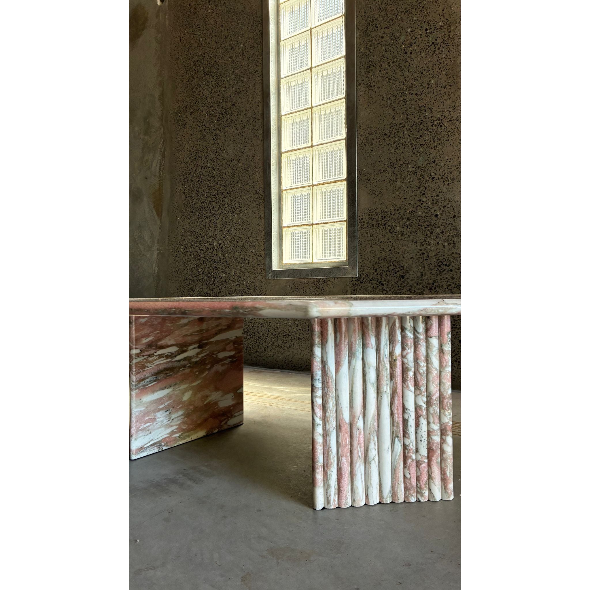 Crafted from Norwegian Rose marble, this piece balances geometric strength with refined detailing. A fluted triangular leg and solid slab base supporting a generously proportioned top.