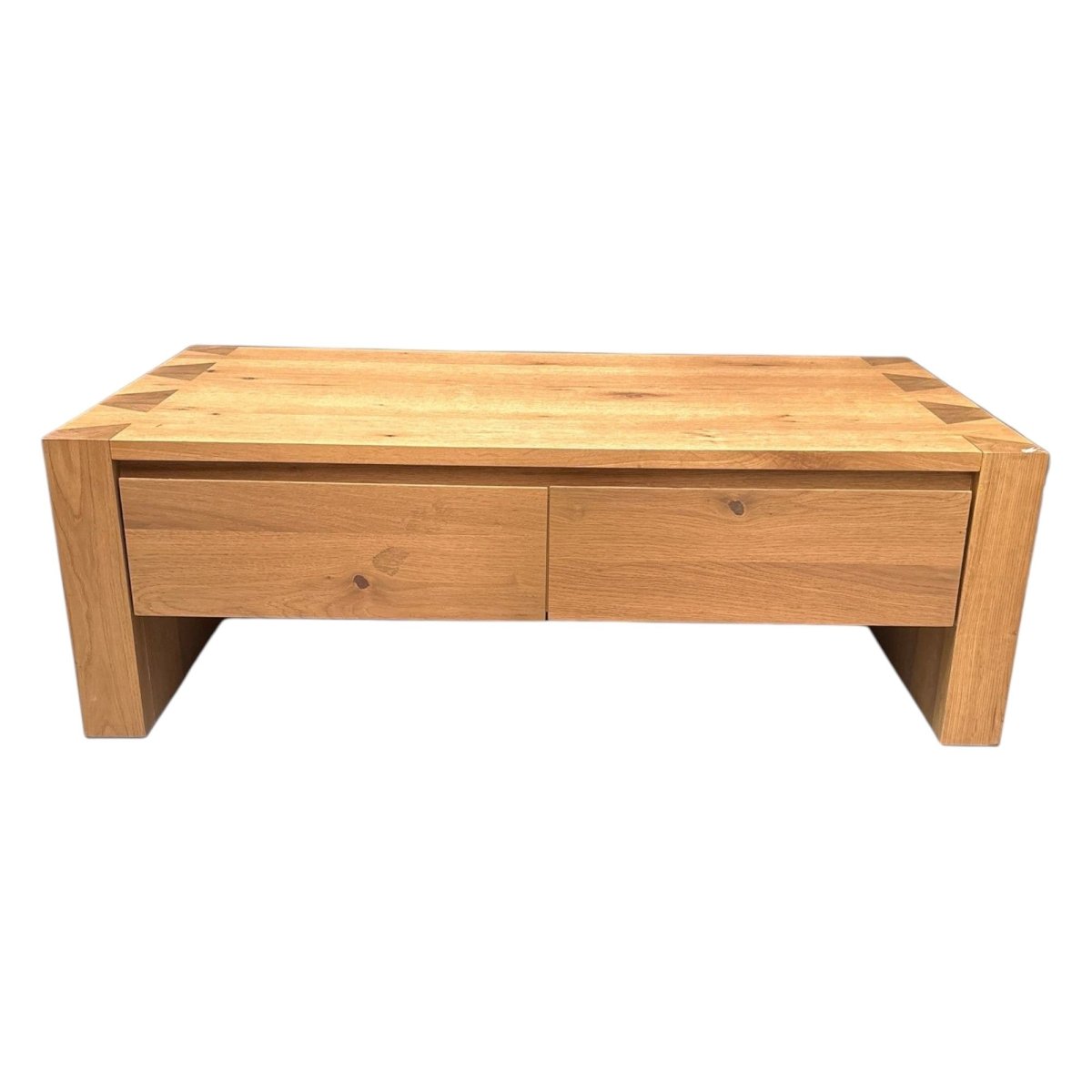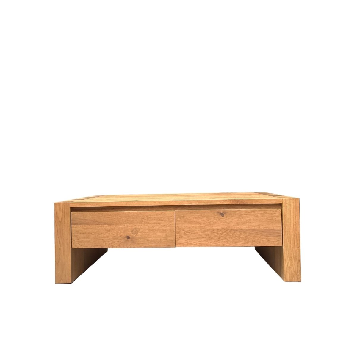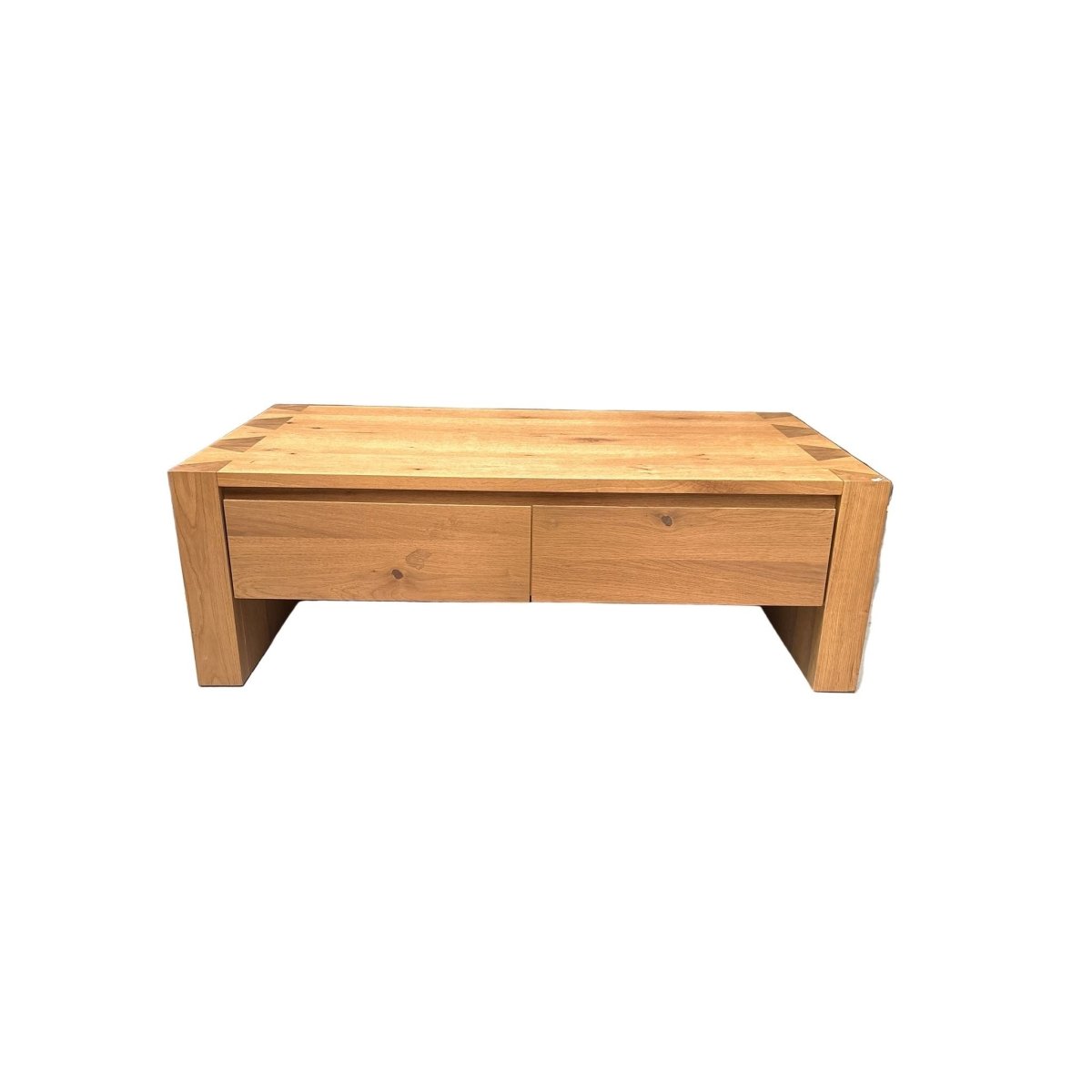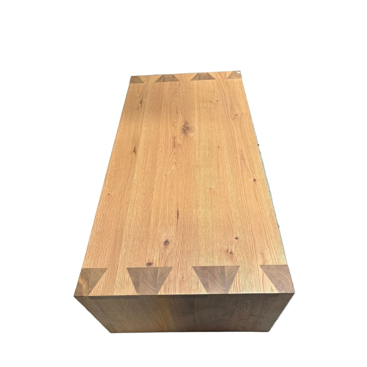 The Bradley coffee table showcases exceptional craftsmanship through its signature dovetail joinery and meticulously finished solid edges. Its wire-brushed natural finish reveals the wood's authentic character, while substantial, statement-making legs deliver a commanding presence. Ideal for discerning buyers who appreciate quality construction and architectural design, this piece combines functional storage with timeless appeal.