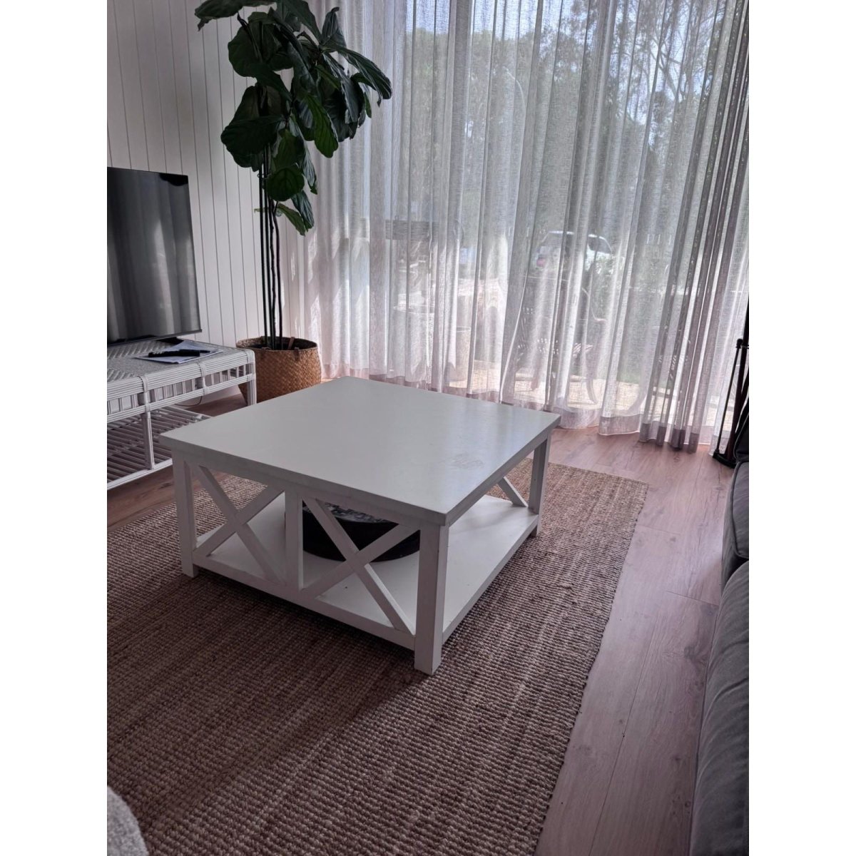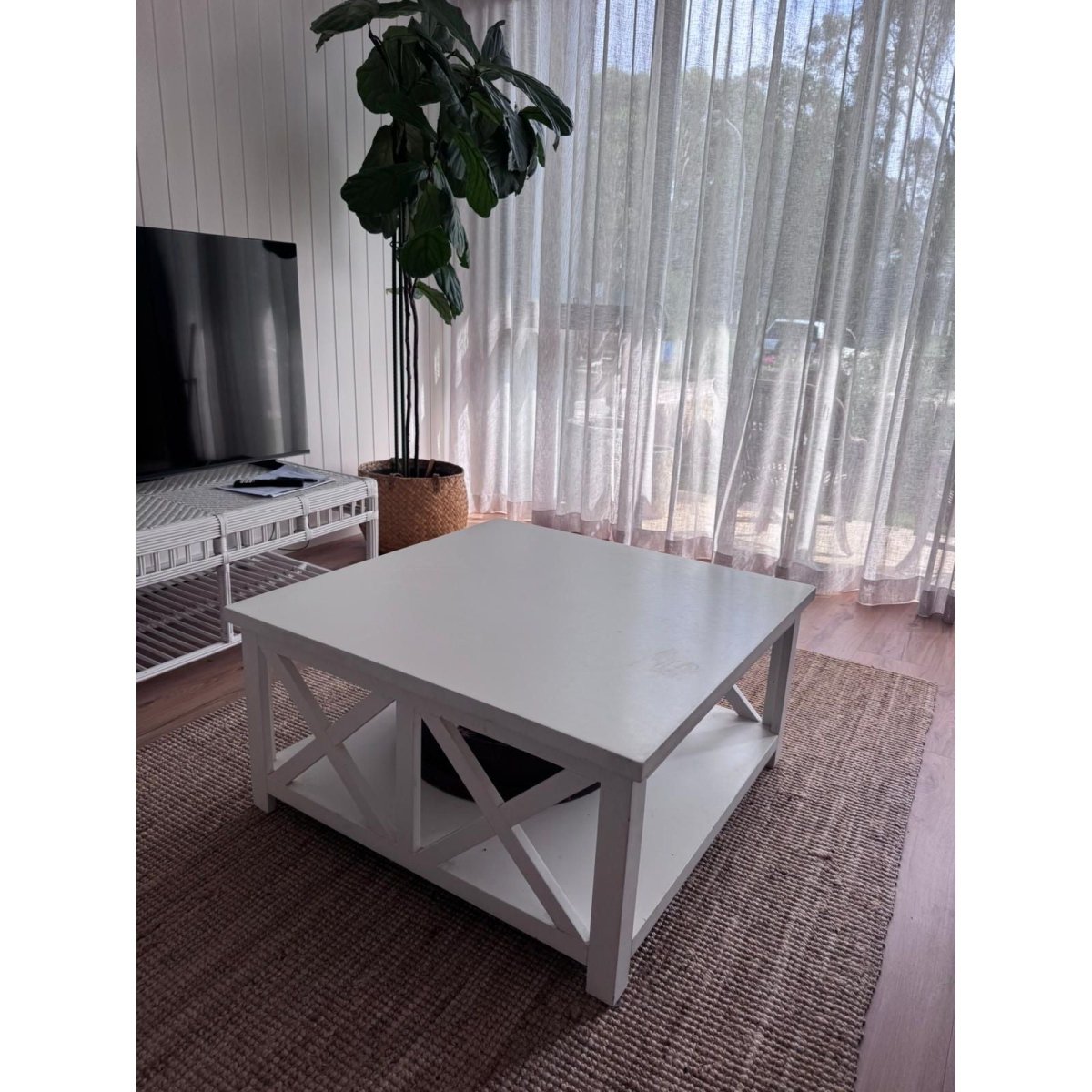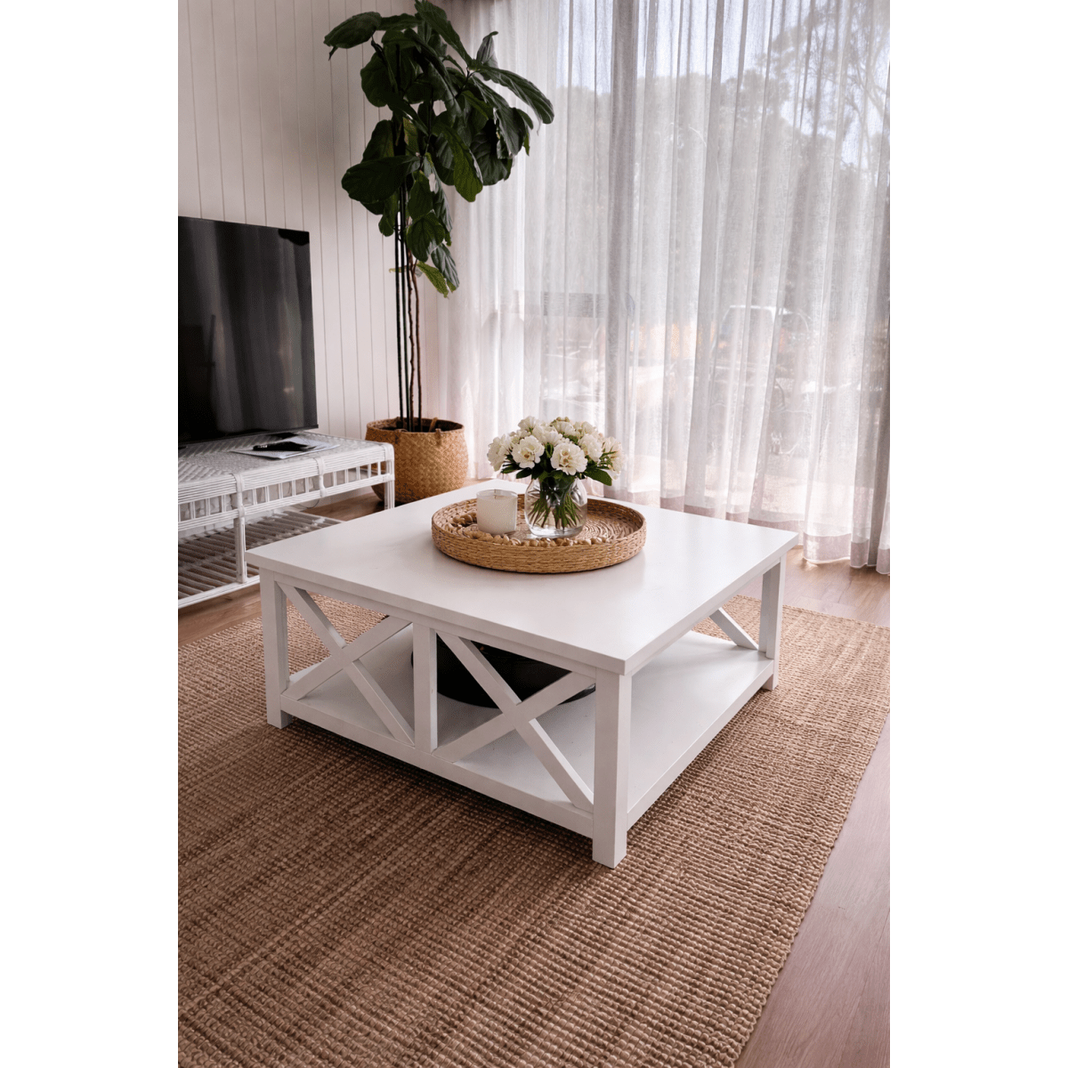 Classic white Hamptons style coffee table with a square profile and practical lower storage shelf.