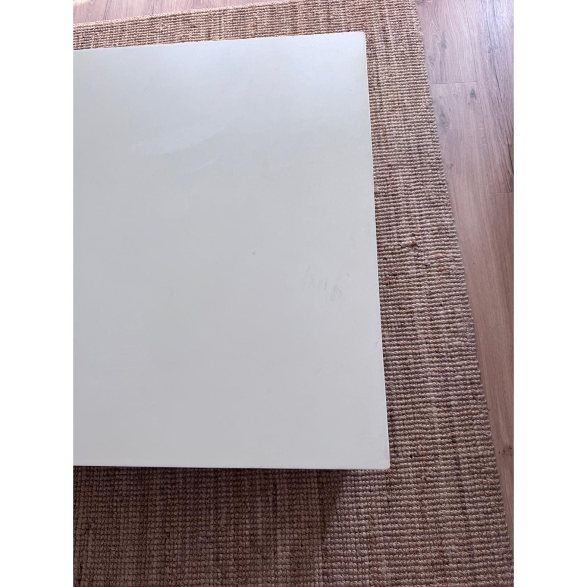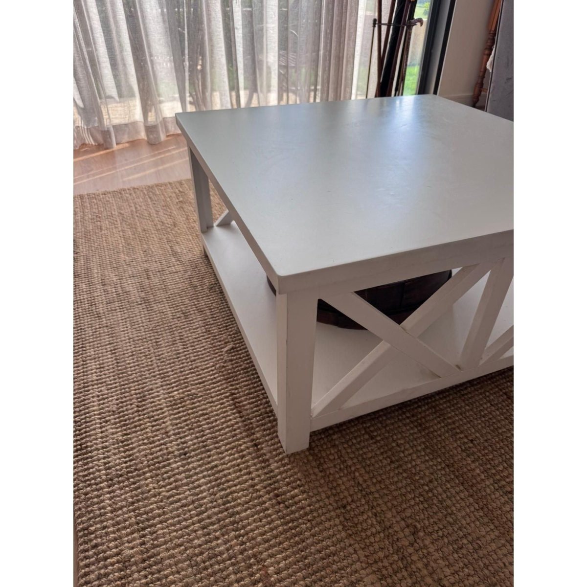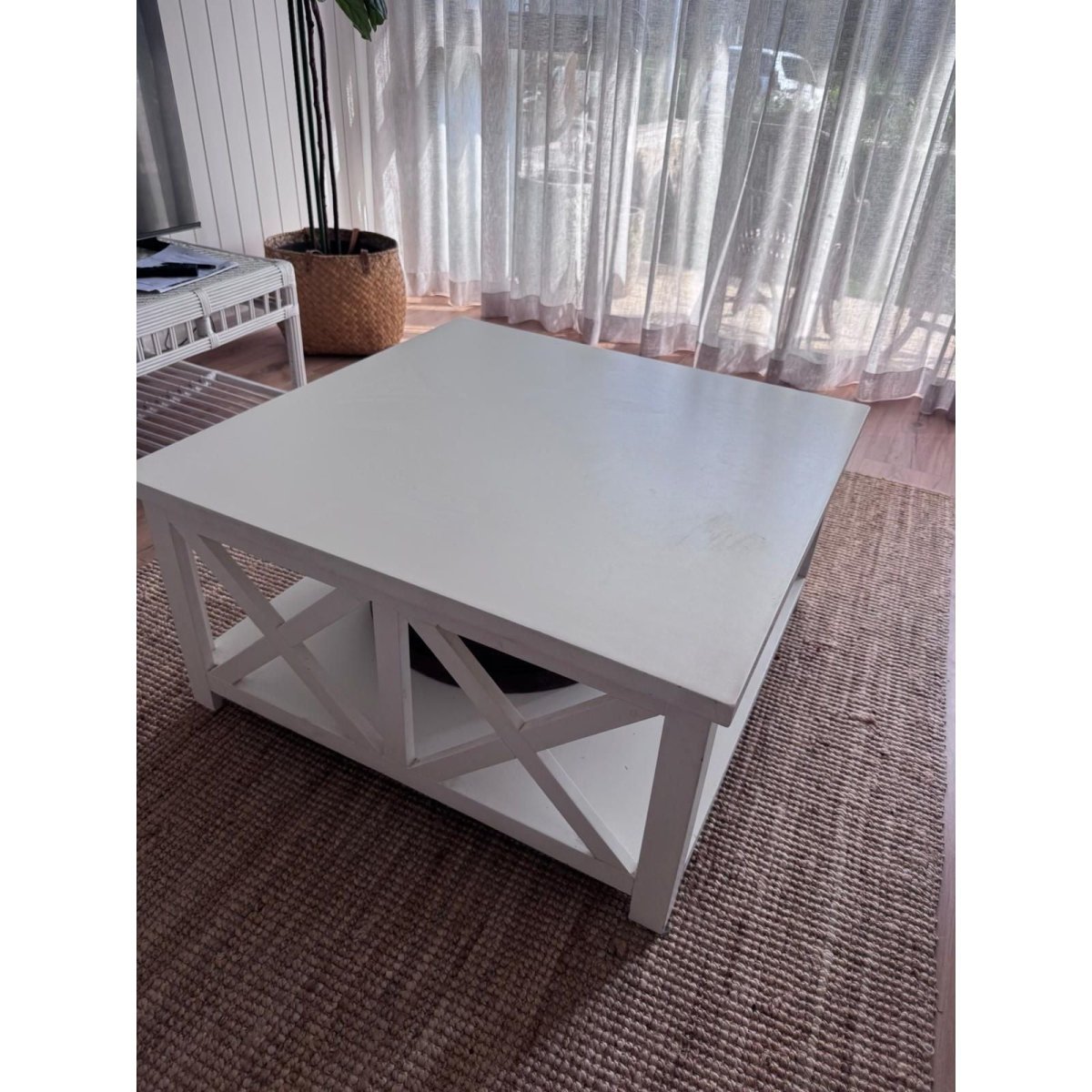 Classic white Hamptons style coffee table with a square profile and practical lower storage shelf.
