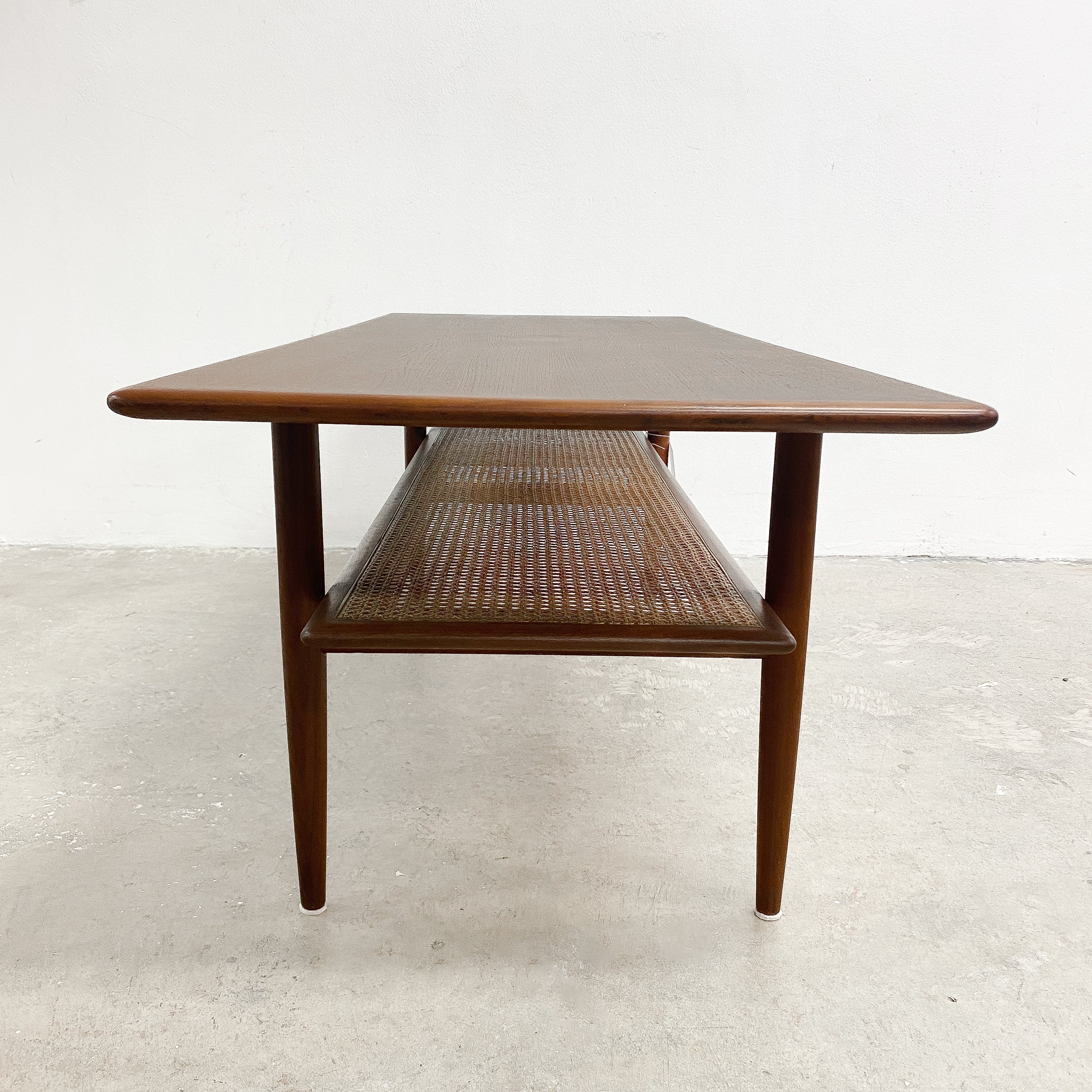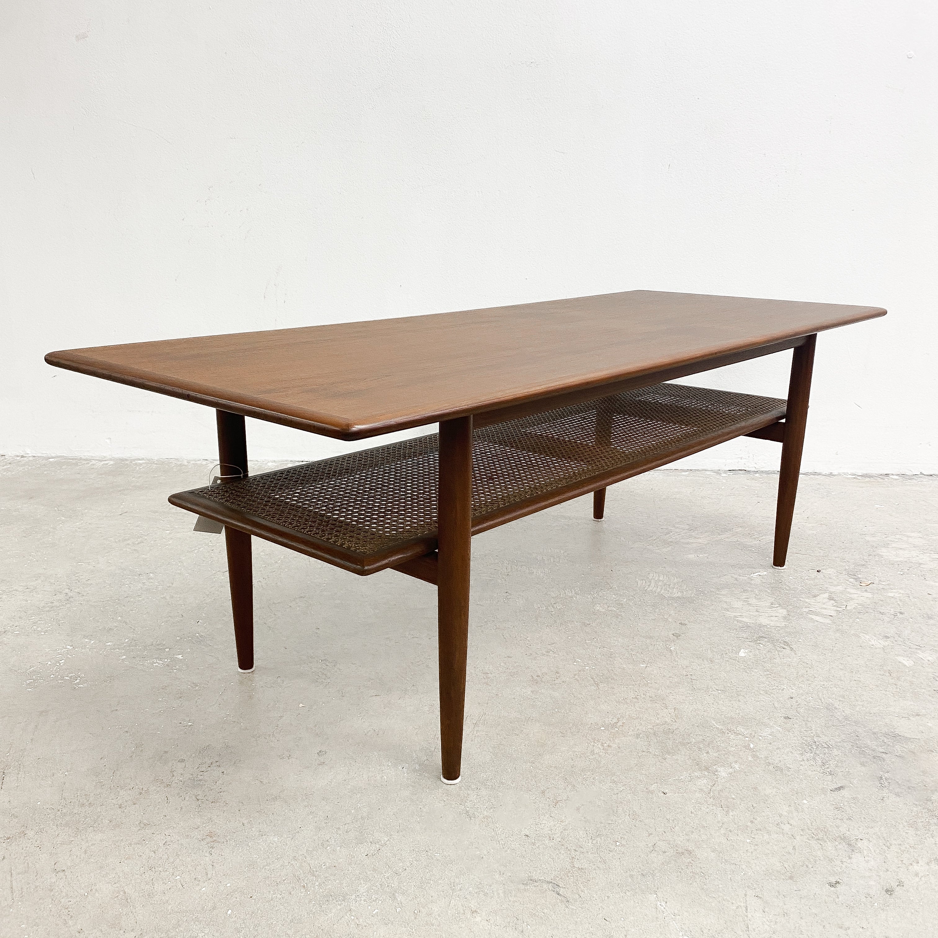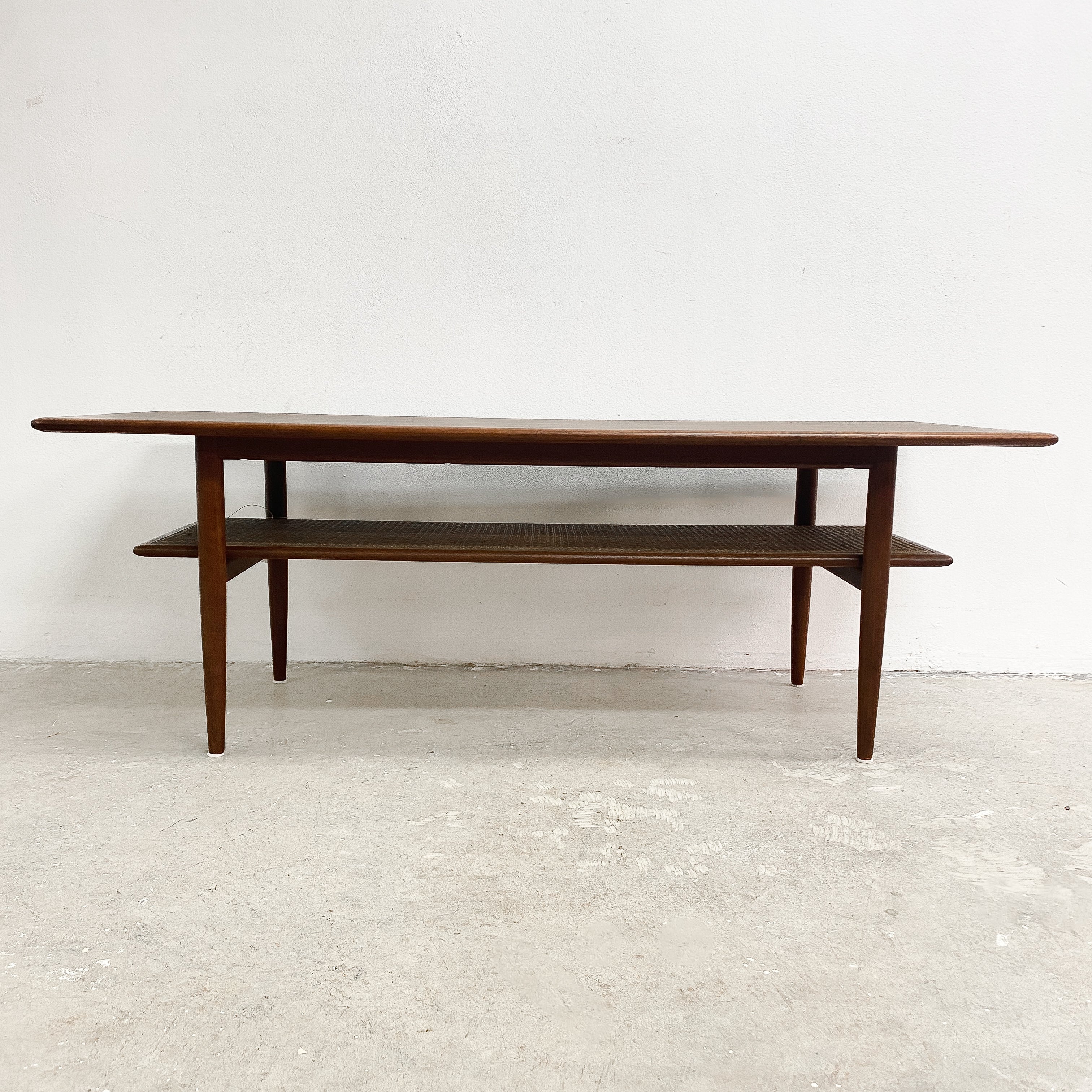 The largest of the Parker mid century teak coffee tables with a rattan magazine shelf. The table has been professionally restored and is in excellent condition.