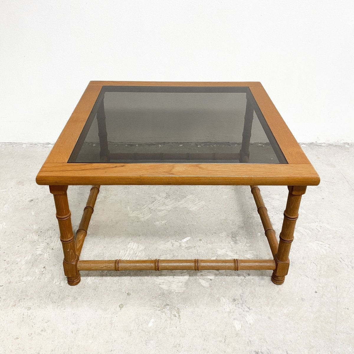 Great mid century square teak coffee table. Featuring fun faux bamboo base and smokey glass top. In good condition with some minor signs of use commensurate with age.