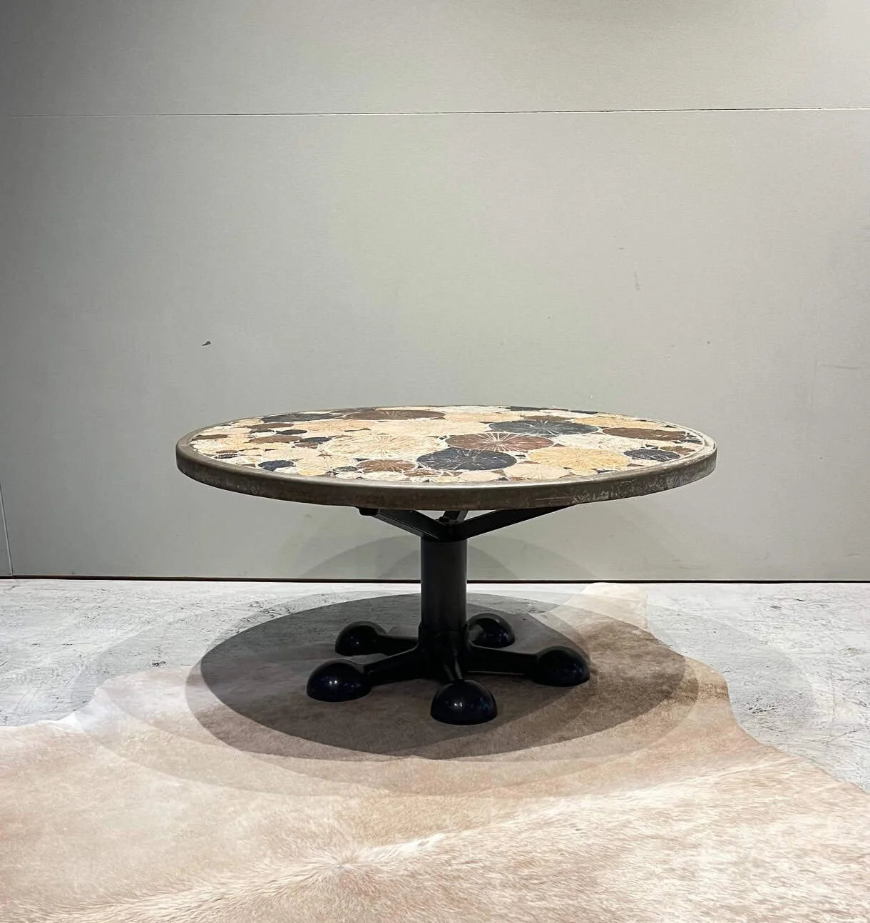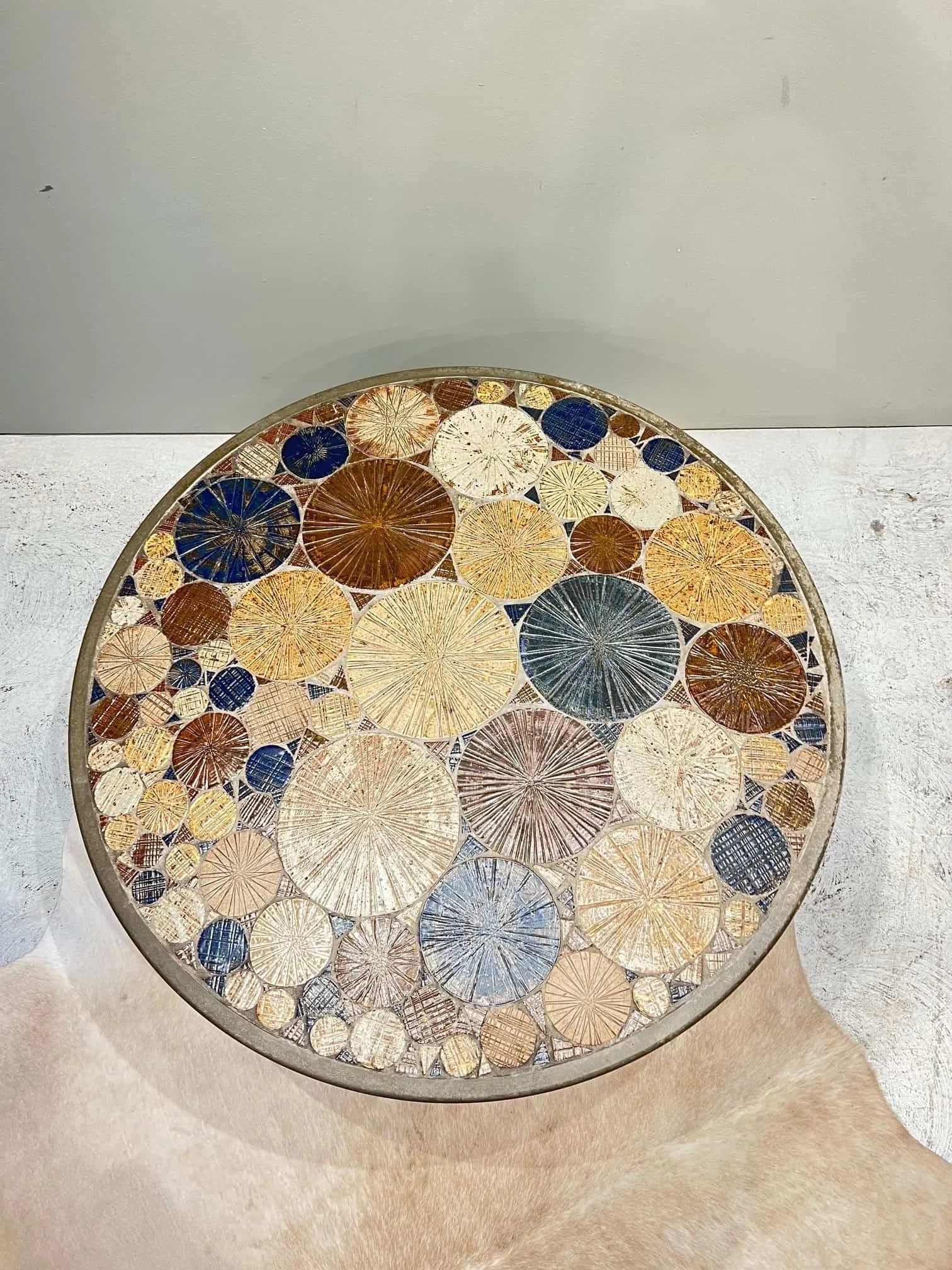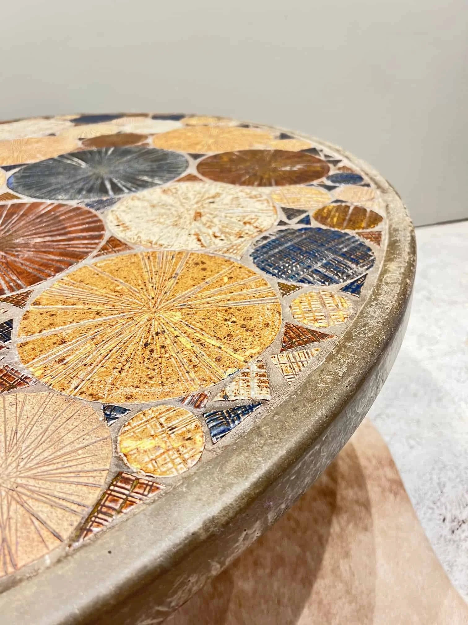Mid-century modern coffee table by Tue Poulsen, Denmark, 1970s — the circular top is decorated with colourful hand-made ceramic tiles, on a metal base.
