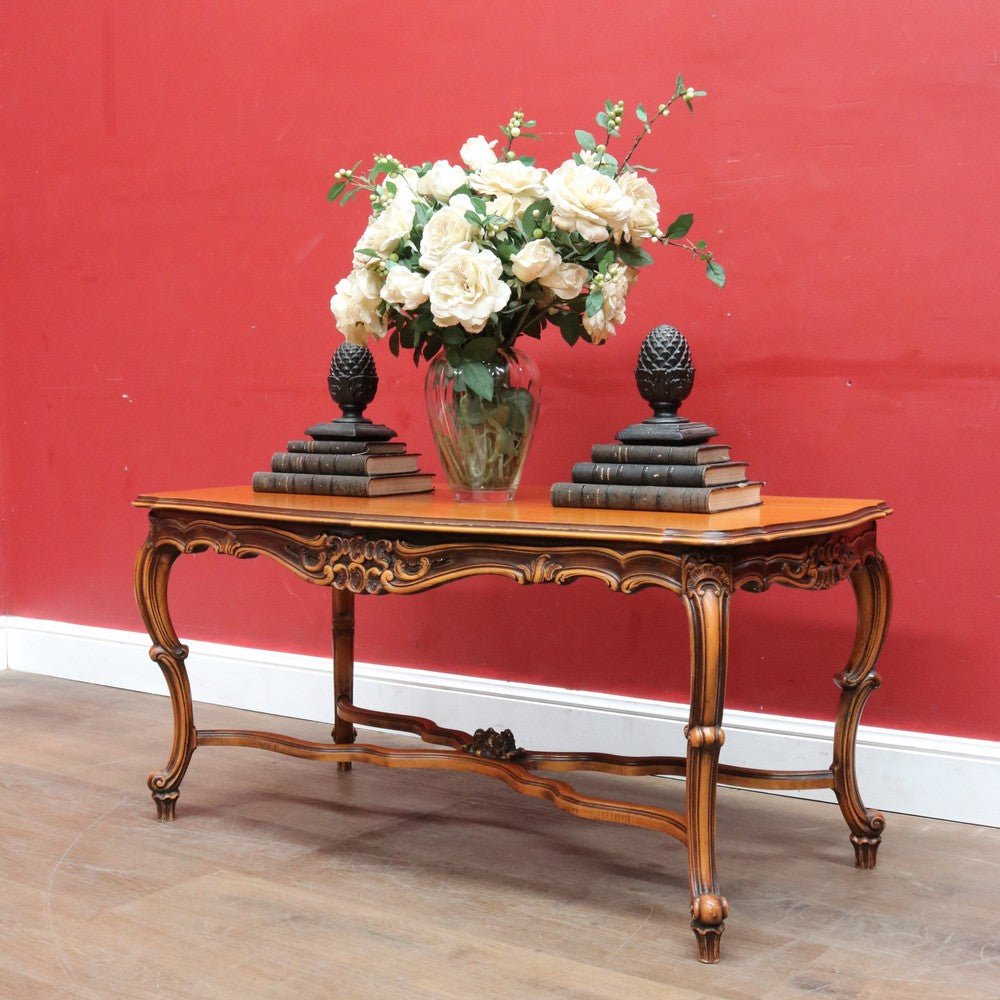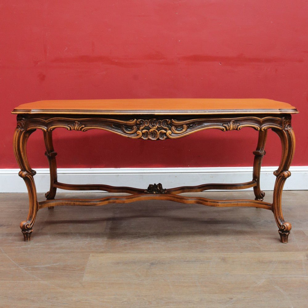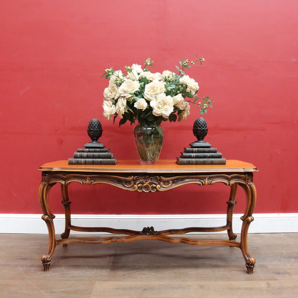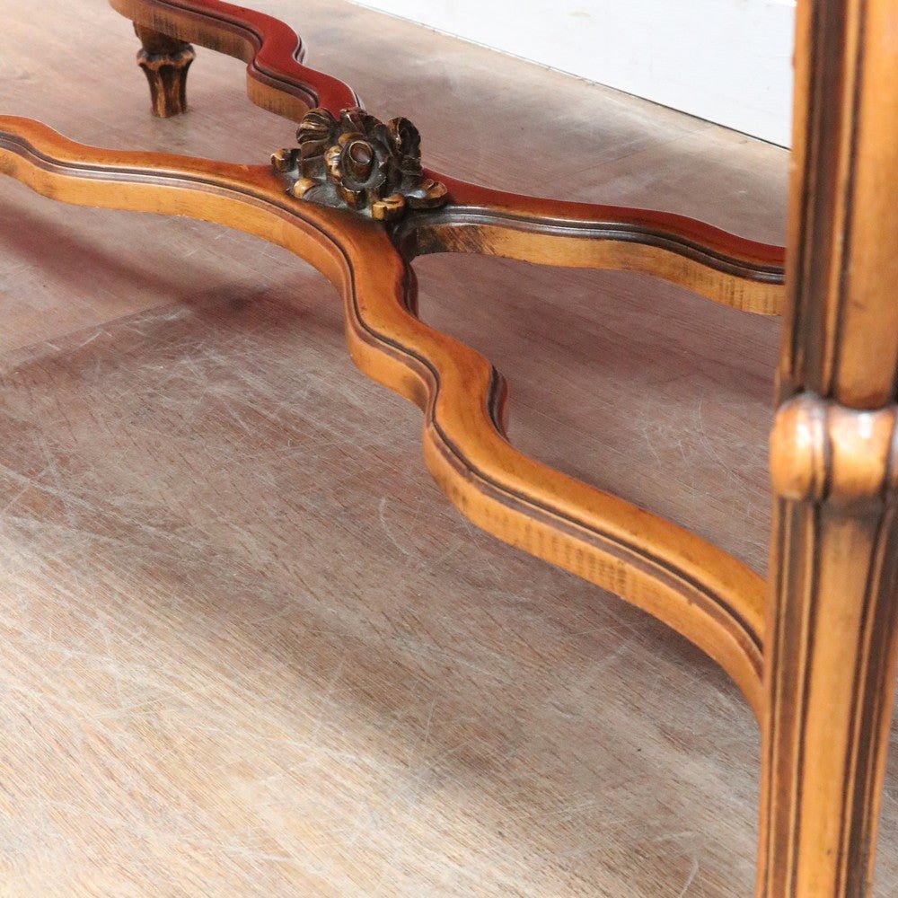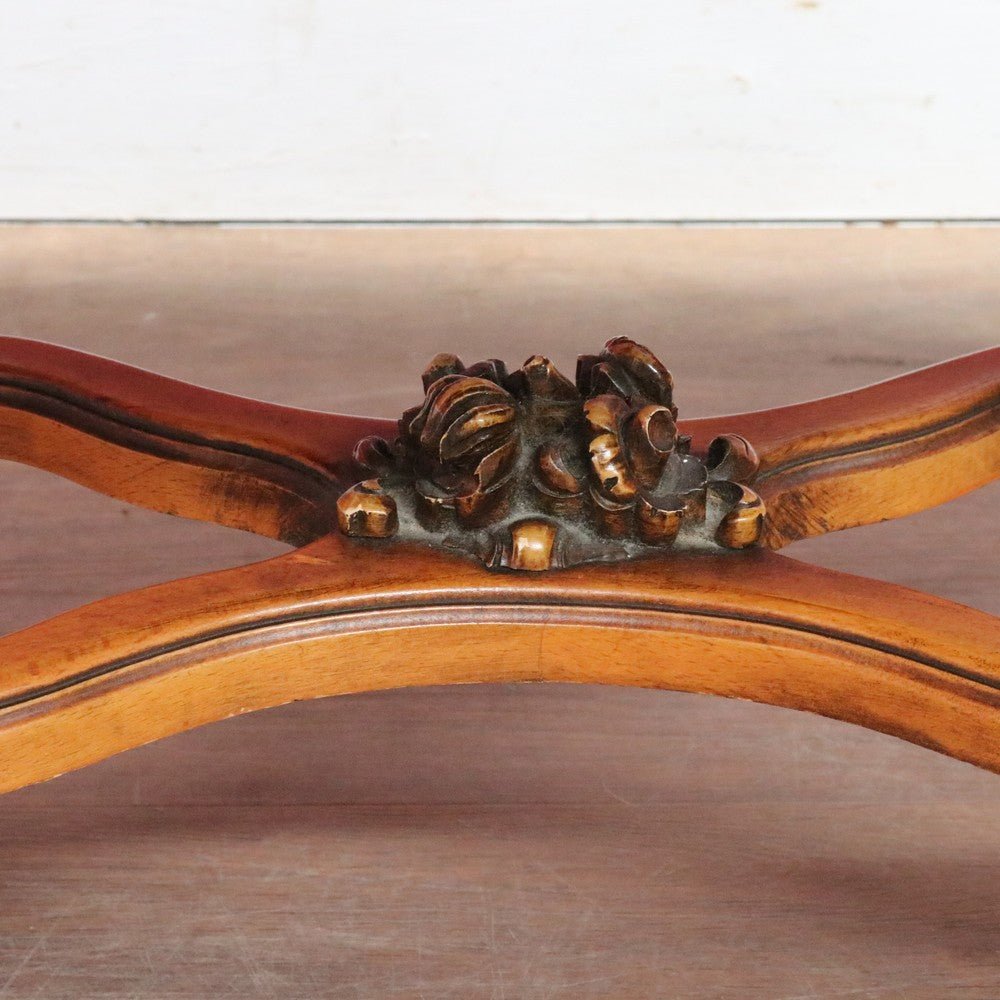 Elegant French vintage coffee table crafted from rich cherry wood, featuring a distinctive cross stretcher base and intricately carved apron detail. This timeless piece exemplifies classic European craftsmanship with its refined proportions and decorative elements. Perfect for adding authentic period charm to traditional or eclectic interiors. A statement-making centerpiece that celebrates the artistry of vintage furniture design.