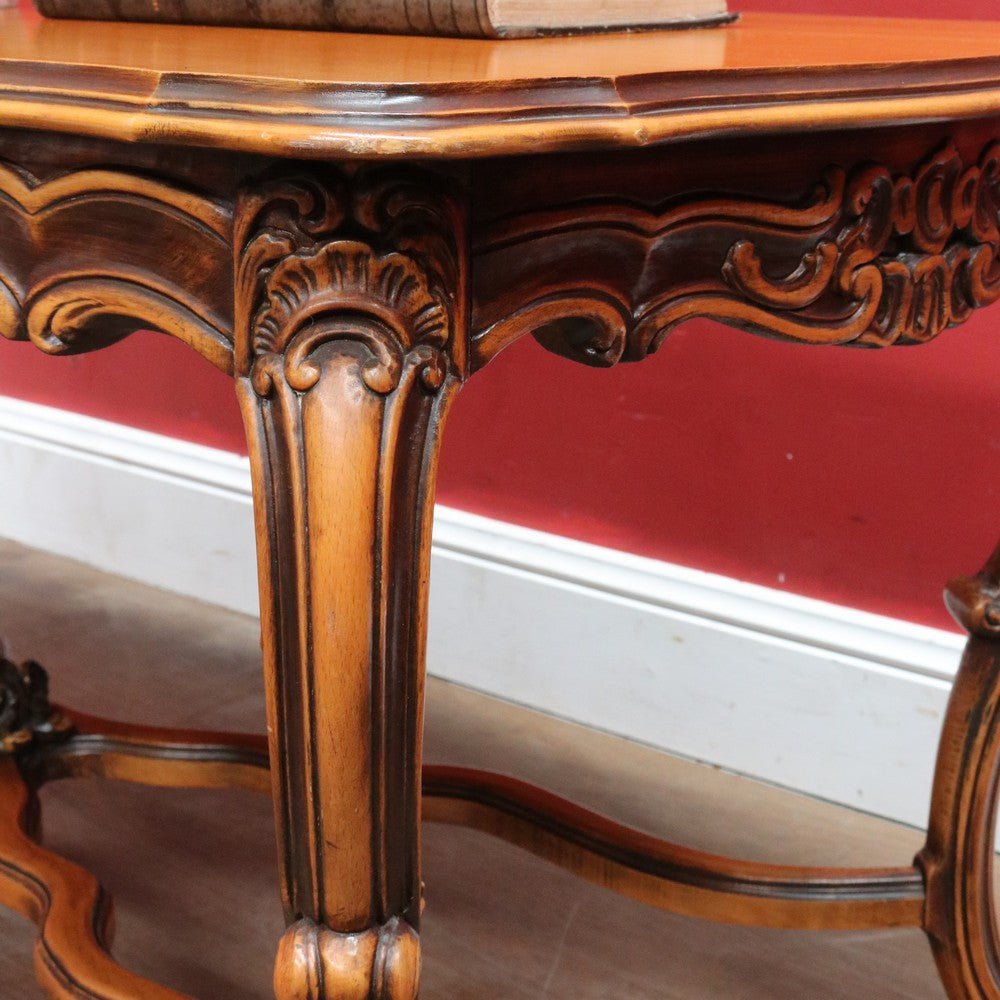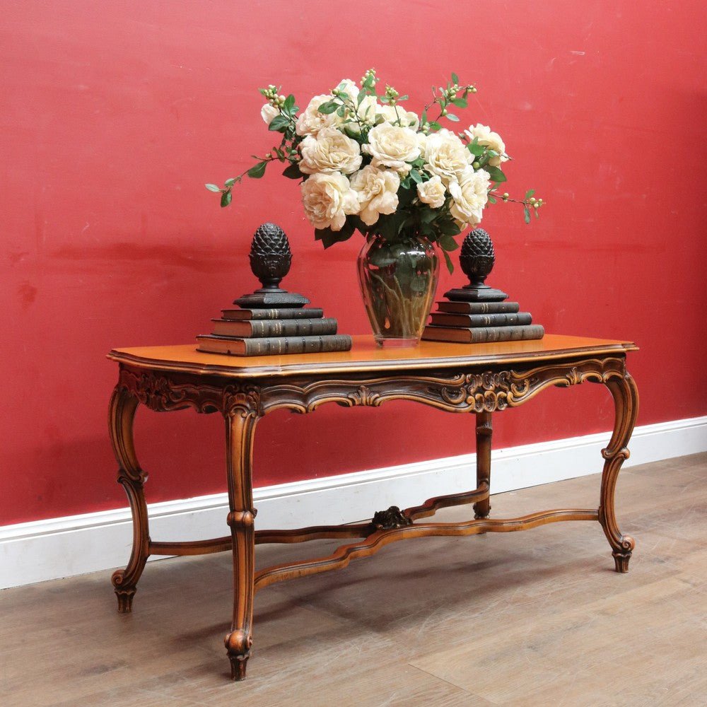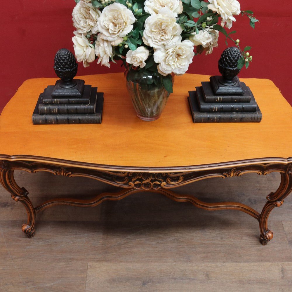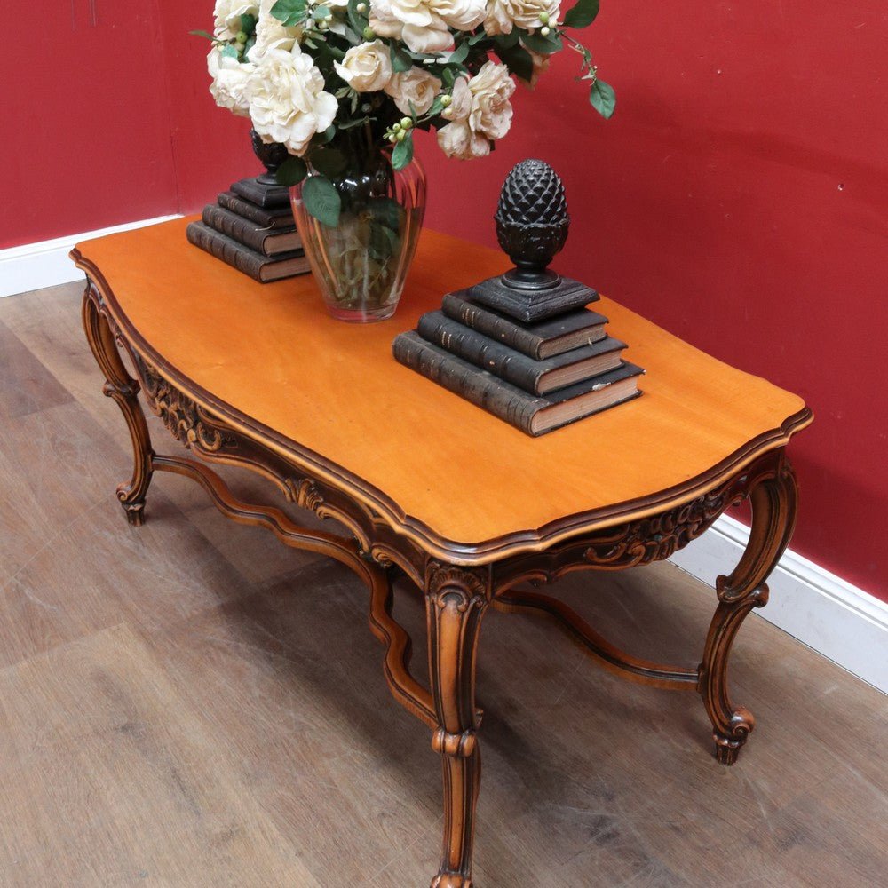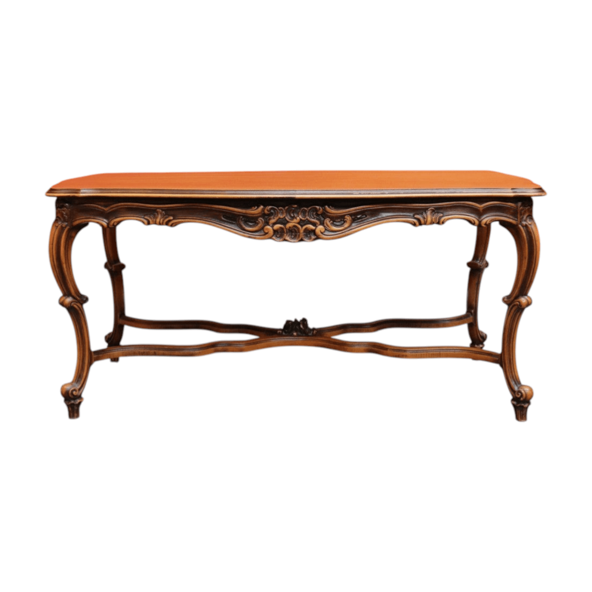 Elegant French vintage coffee table crafted from rich cherry wood, featuring a distinctive cross stretcher base and intricately carved apron detail. This timeless piece exemplifies classic European craftsmanship with its refined proportions and decorative elements. Perfect for adding authentic period charm to traditional or eclectic interiors. A statement-making centerpiece that celebrates the artistry of vintage furniture design.