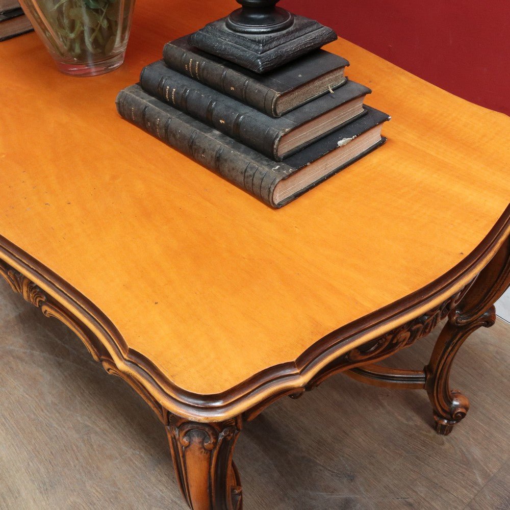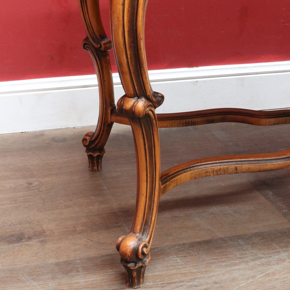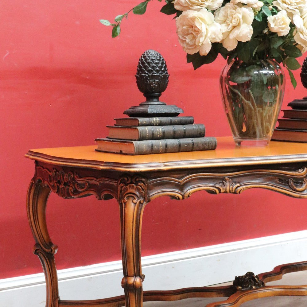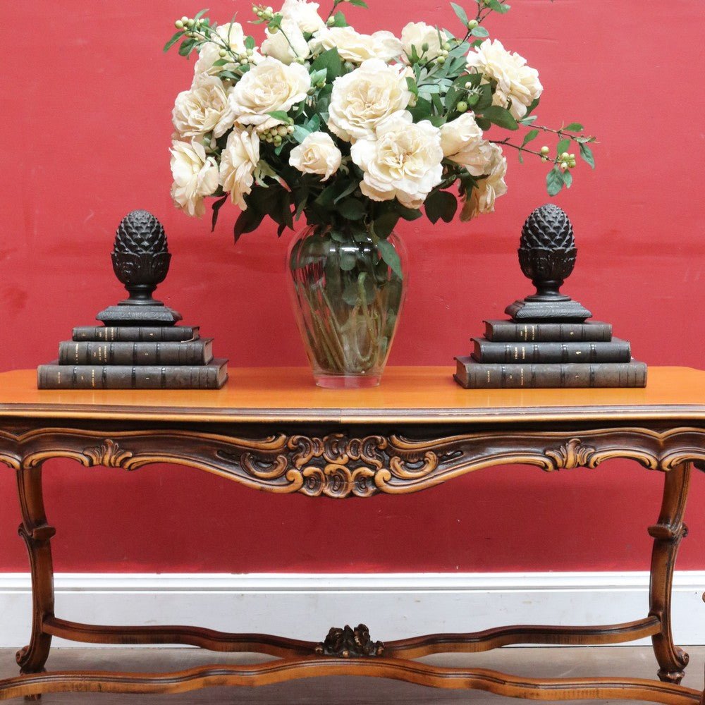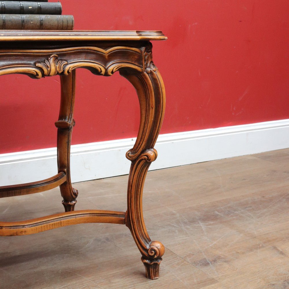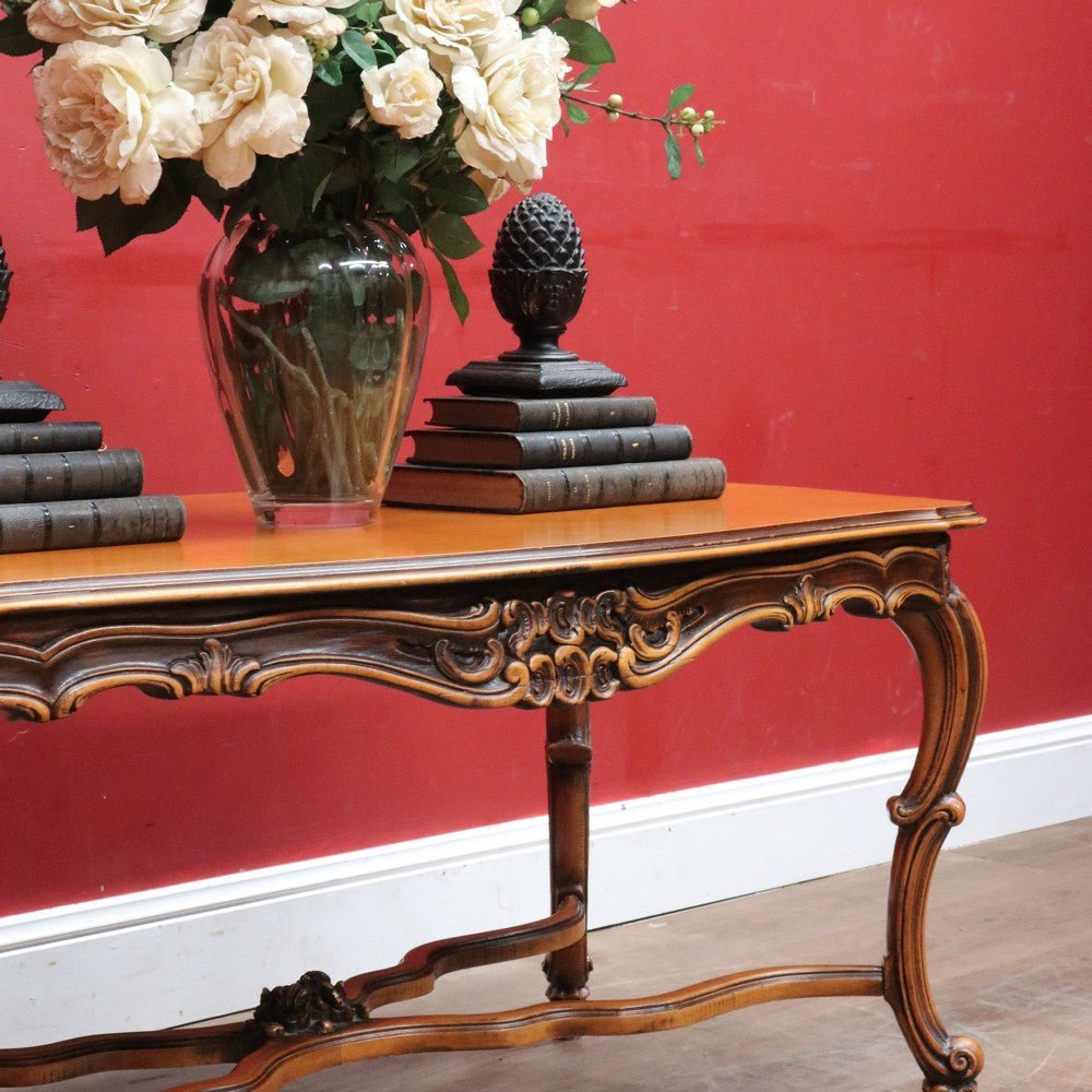 Elegant French vintage coffee table crafted from rich cherry wood, featuring a distinctive cross stretcher base and intricately carved apron detail. This timeless piece exemplifies classic European craftsmanship with its refined proportions and decorative elements. Perfect for adding authentic period charm to traditional or eclectic interiors. A statement-making centerpiece that celebrates the artistry of vintage furniture design.