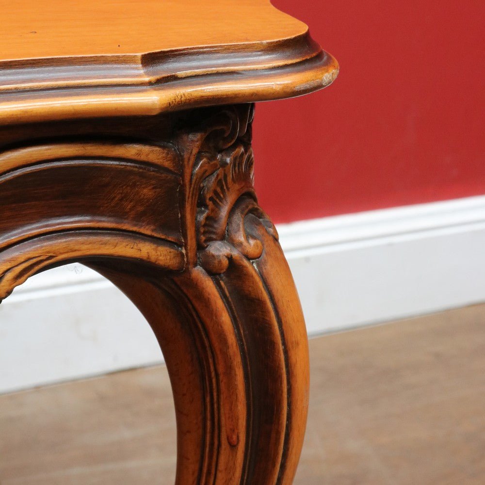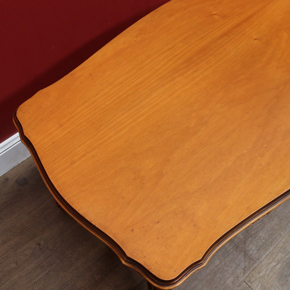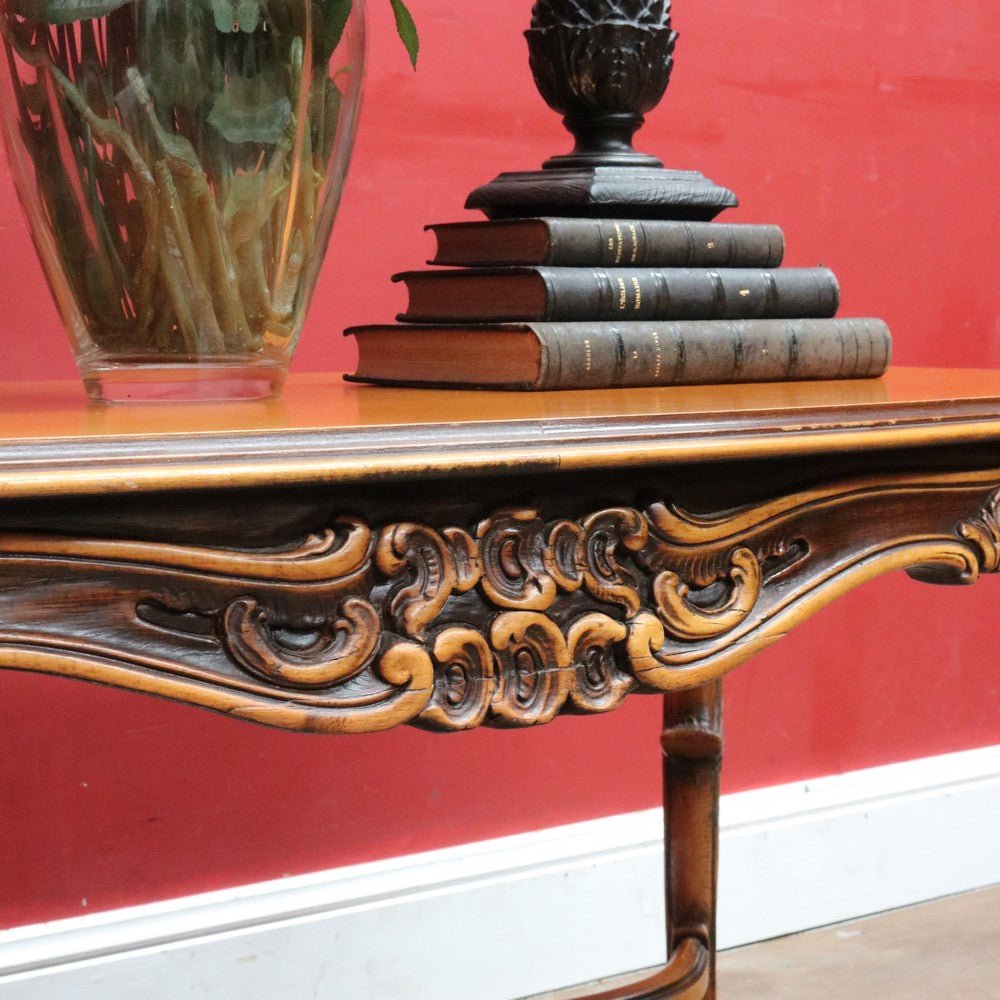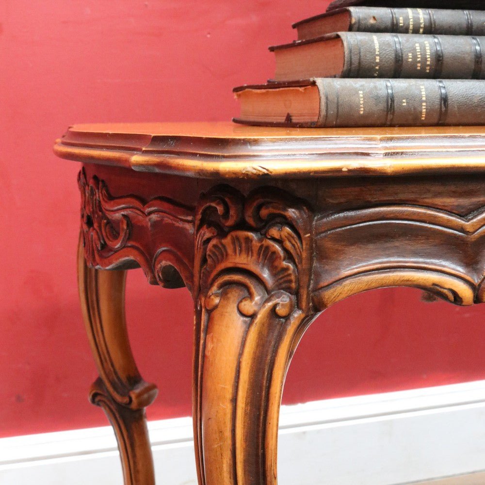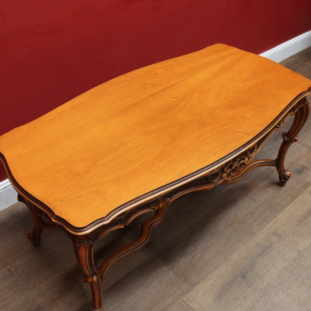 Elegant French vintage coffee table crafted from rich cherry wood, featuring a distinctive cross stretcher base and intricately carved apron detail. This timeless piece exemplifies classic European craftsmanship with its refined proportions and decorative elements. Perfect for adding authentic period charm to traditional or eclectic interiors. A statement-making centerpiece that celebrates the artistry of vintage furniture design.