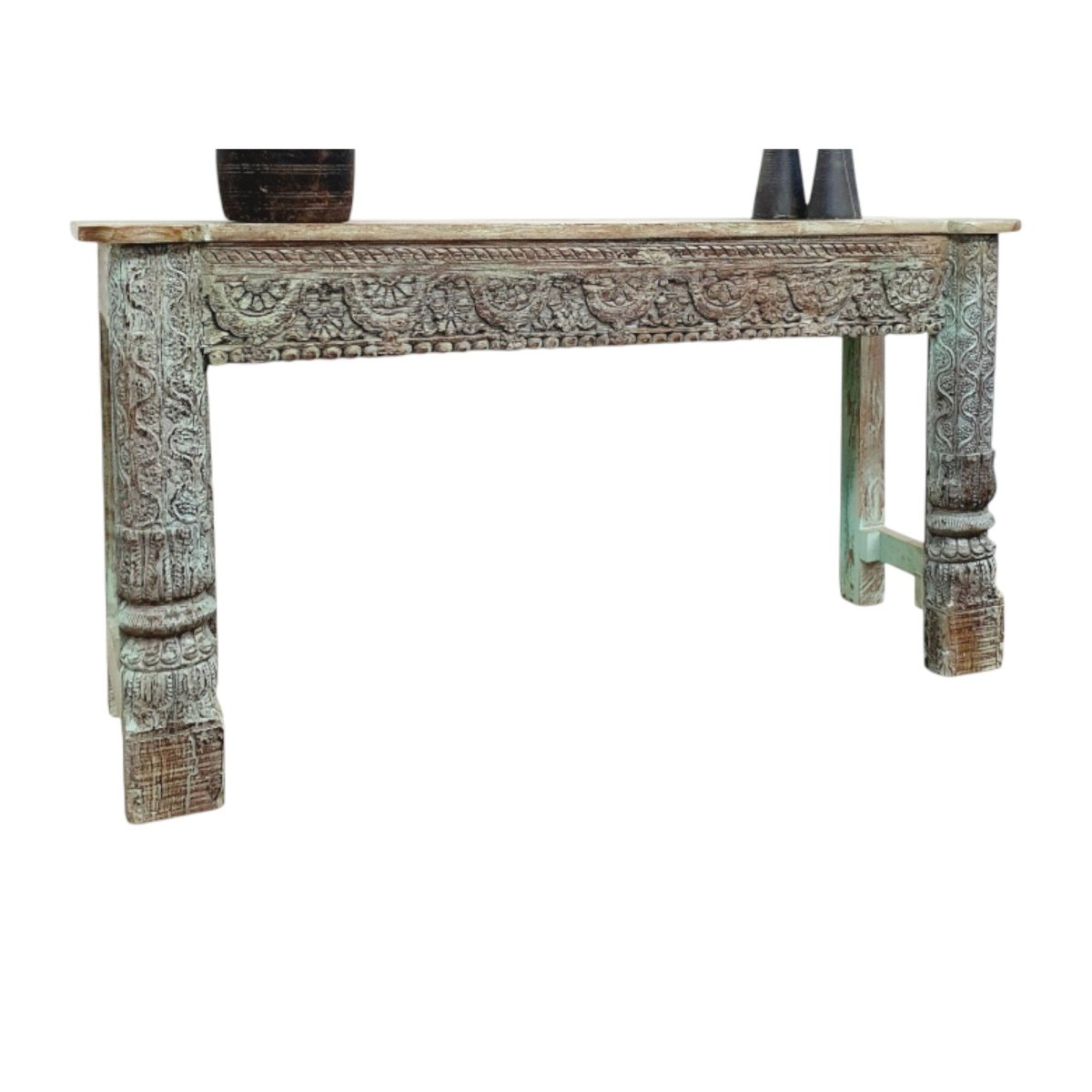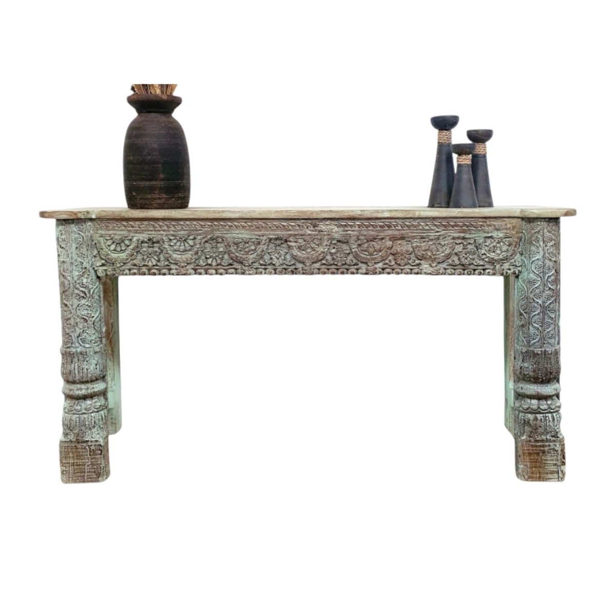 Expertly handcrafted by Indian artisans, this stunning console table has been thoughtfully created using reclaimed vintage components. Part of the Eco Village Collection, it enhances your home’s atmosphere while supporting sustainable craftsmanship. Elevate your space with a distinctive blend of artistry, heritage, and eco-friendly principles through this exceptional piece.