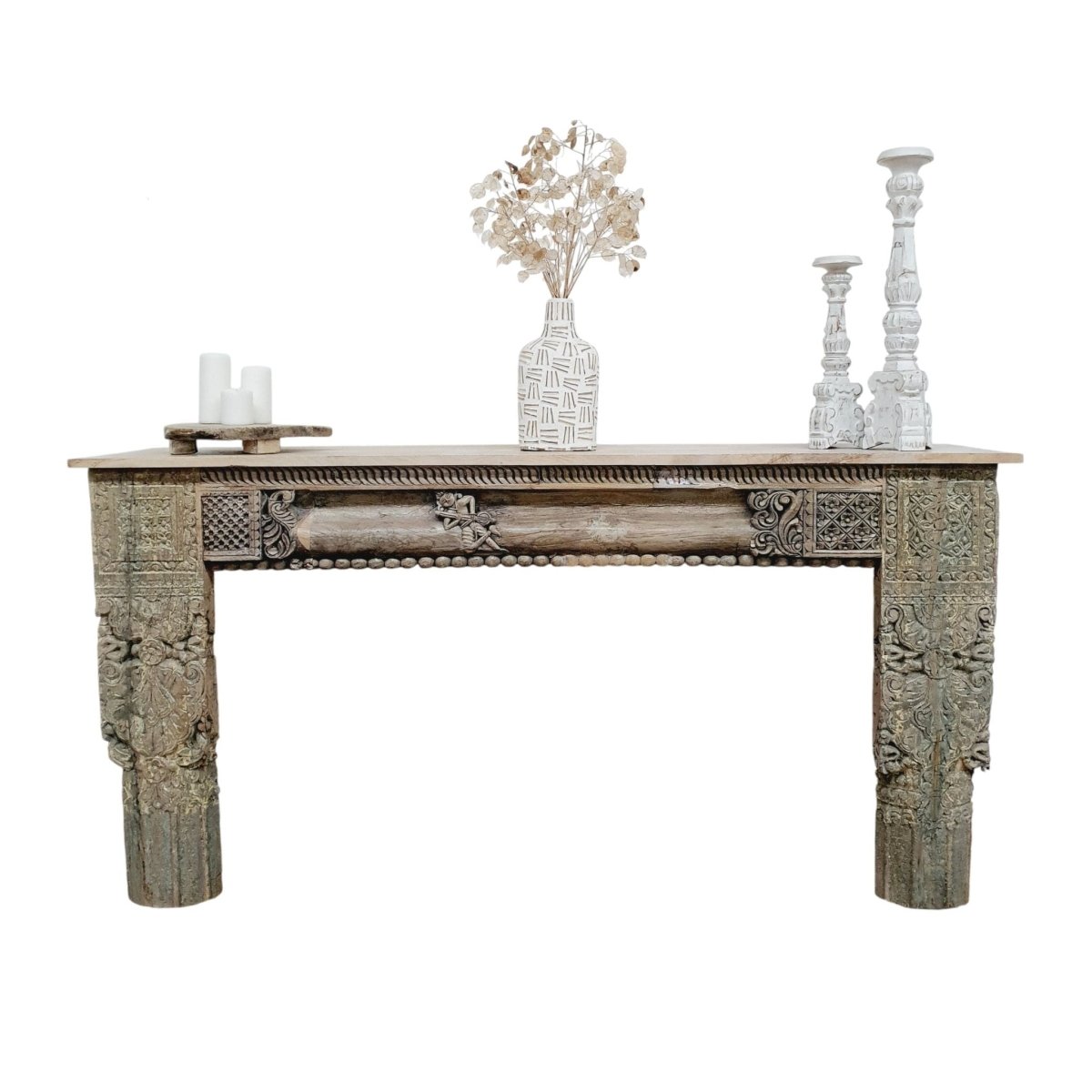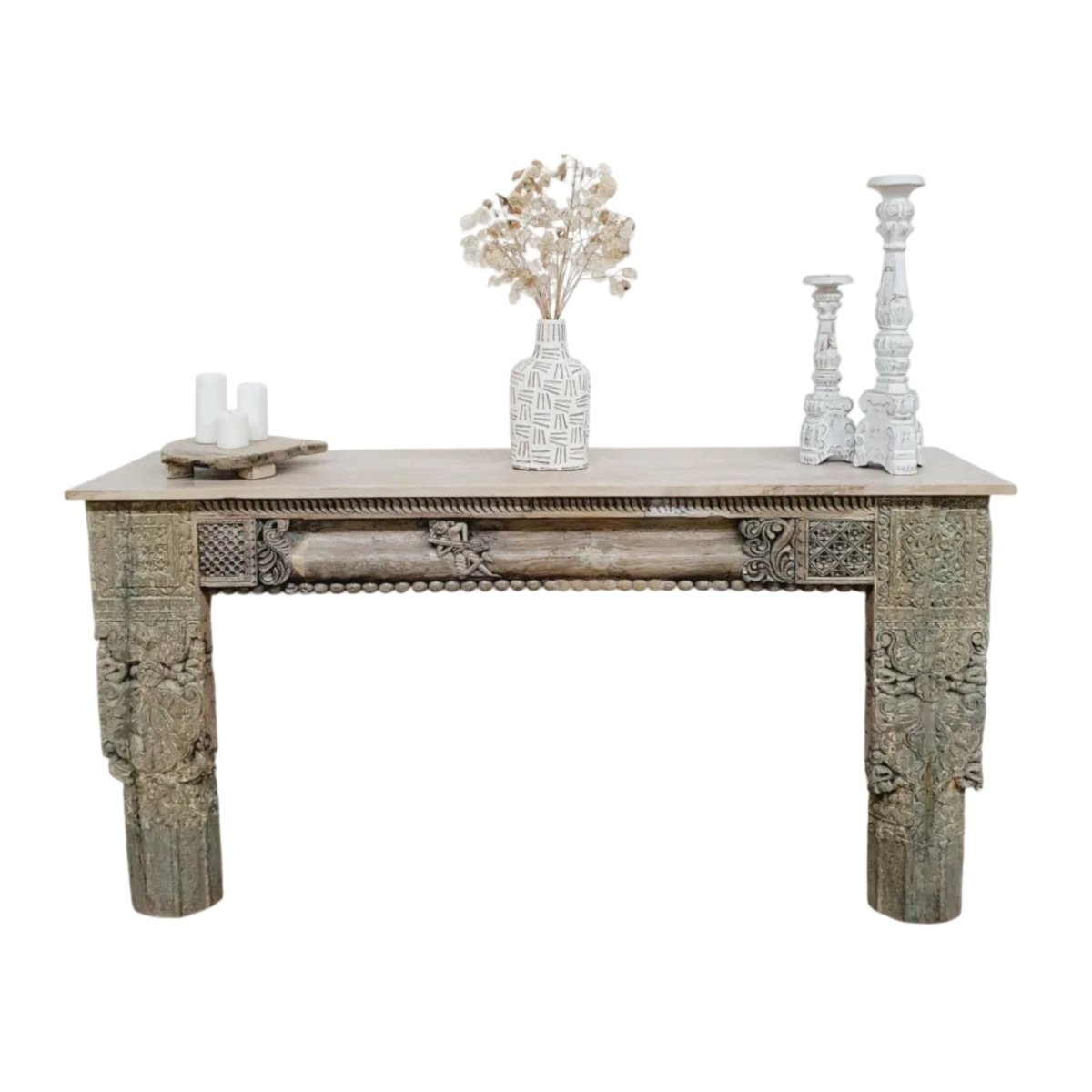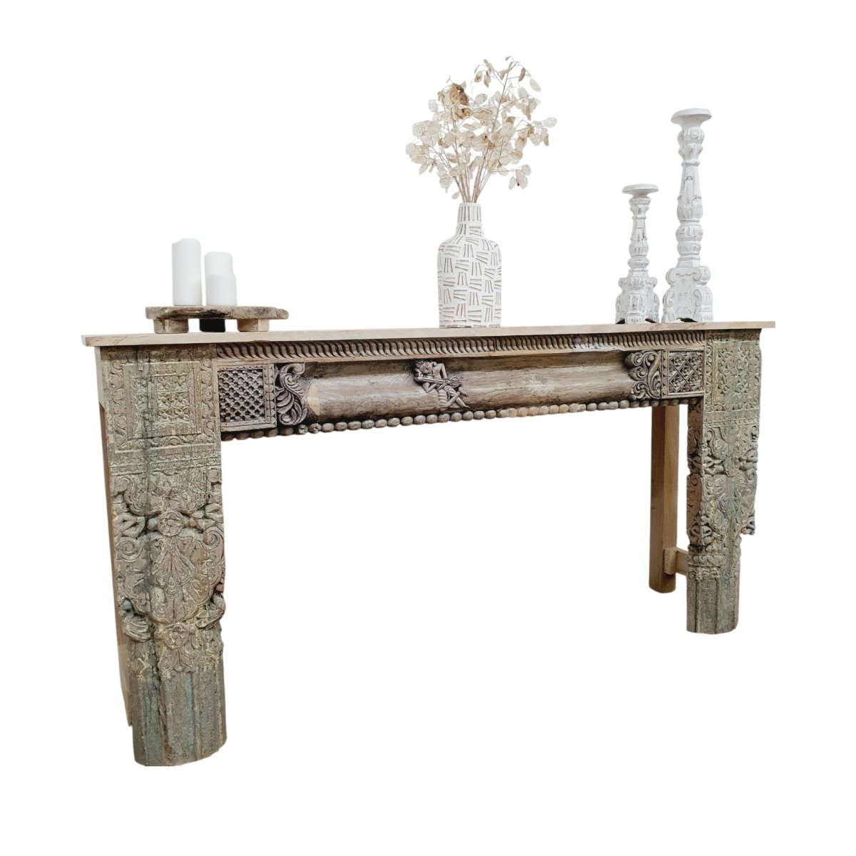 Handcrafted in India, this elegant console table boasts detailed vintage elements that make it a distinctive centerpiece. Featuring intricate carvings and yellow & green hues, this piece has been thoughtfully created using reclaimed vintage components. As part of the Eco Village Collection, it enhances your home’s character while supporting sustainable artisan work. Bring a blend of artistry, heritage, and eco-friendly principles into your living space with this stunning, unique piece.