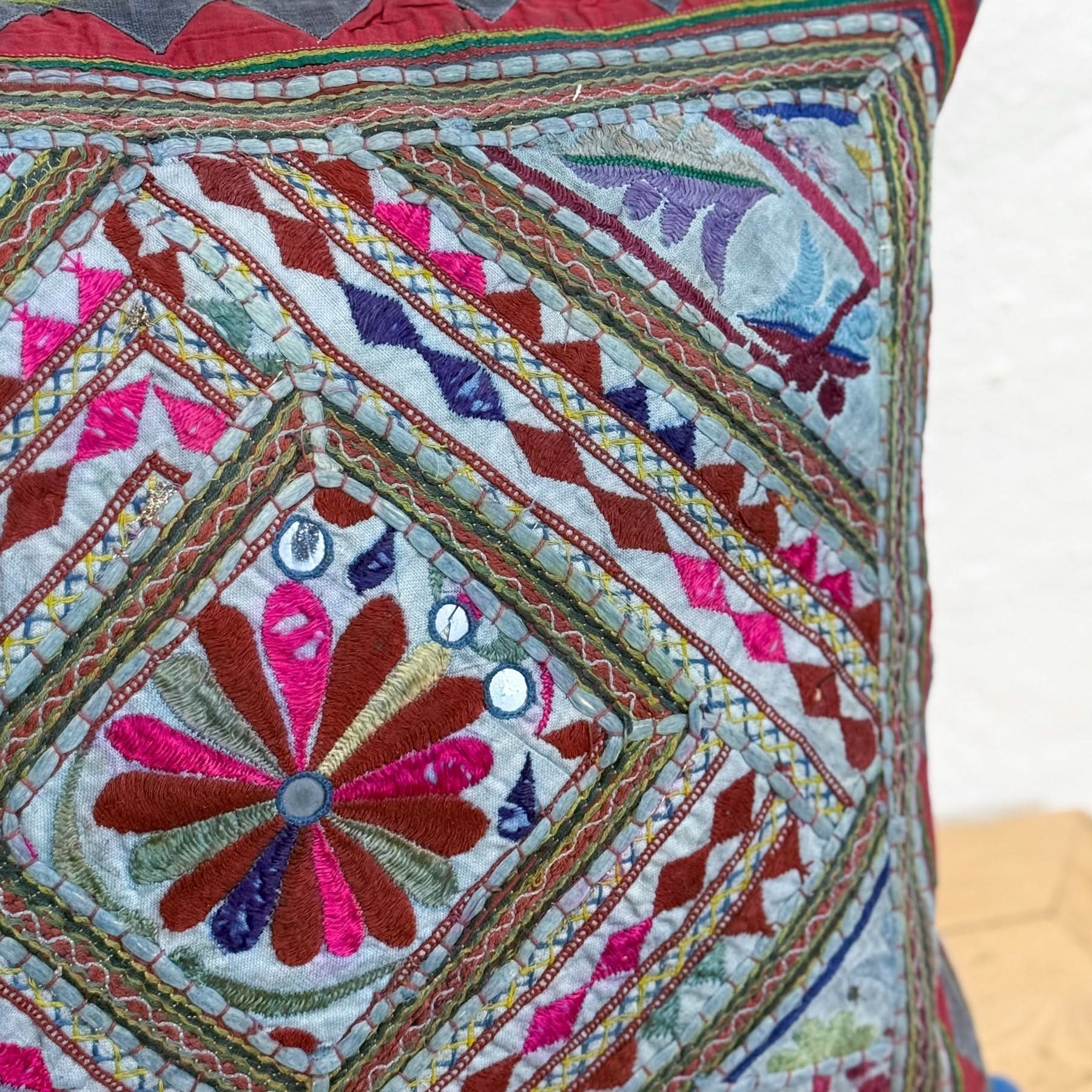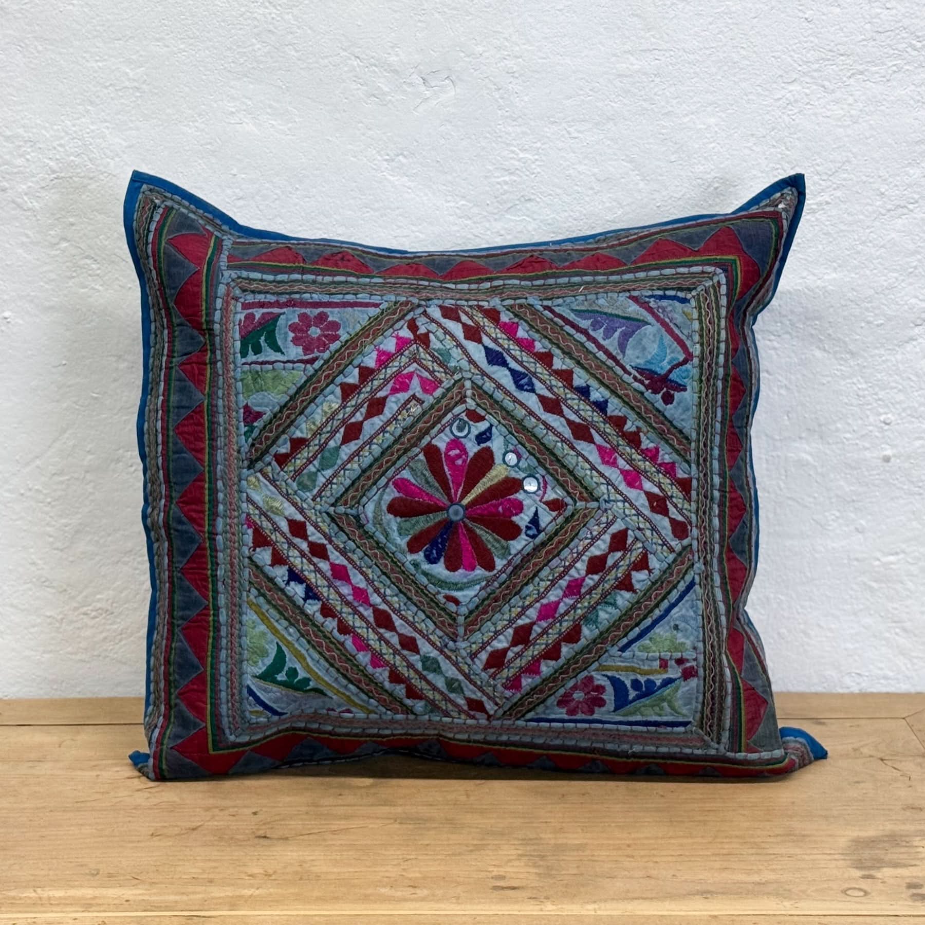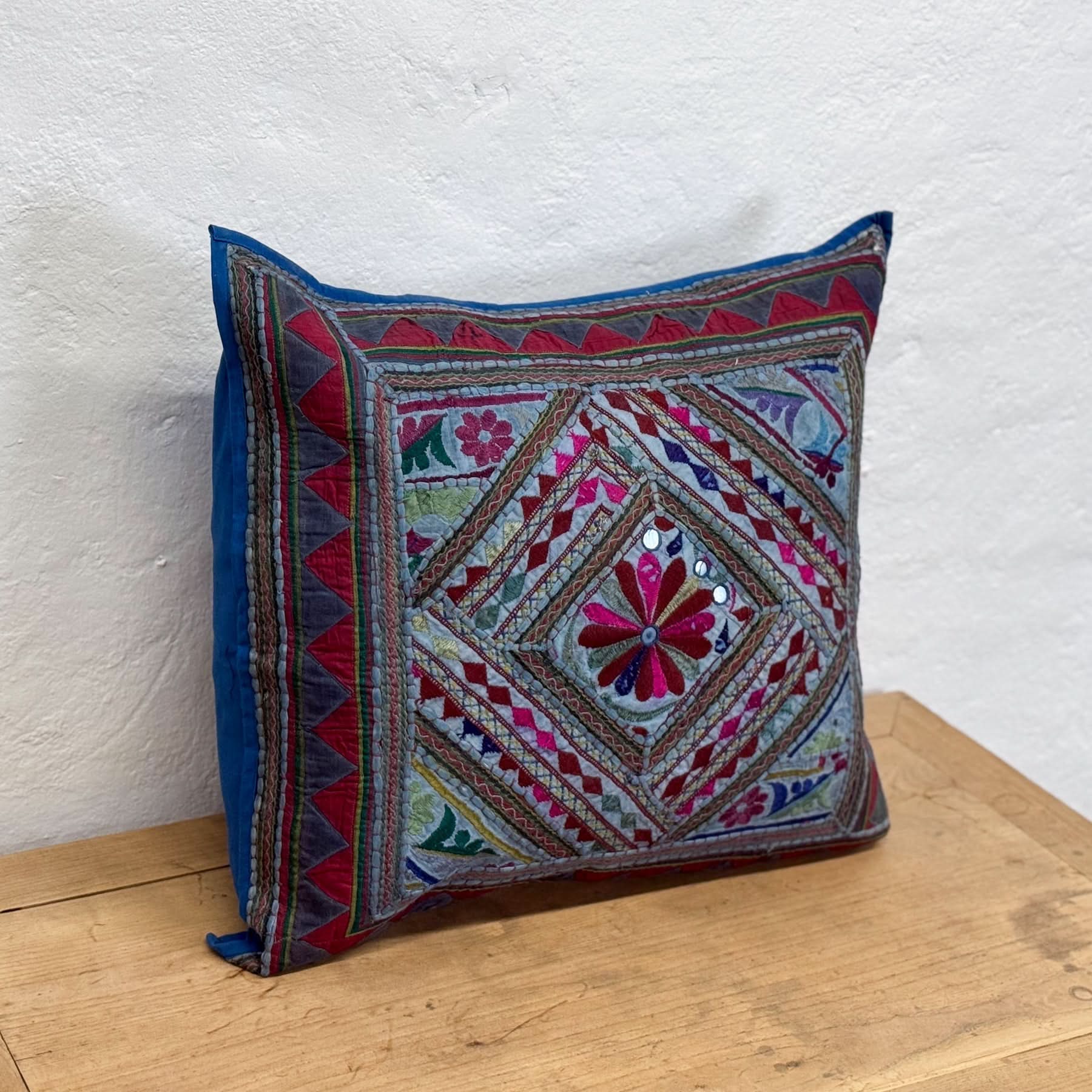 With a rich blue base and warm-toned accent embroidery, this large cotton cushion has a graphic, geometric feel. Its Indian heritage shows in the craftsmanship and colour layering – perfect for balancing pattern and polish.