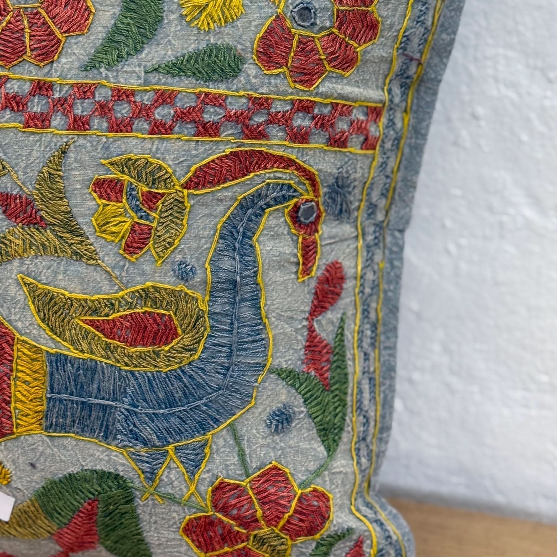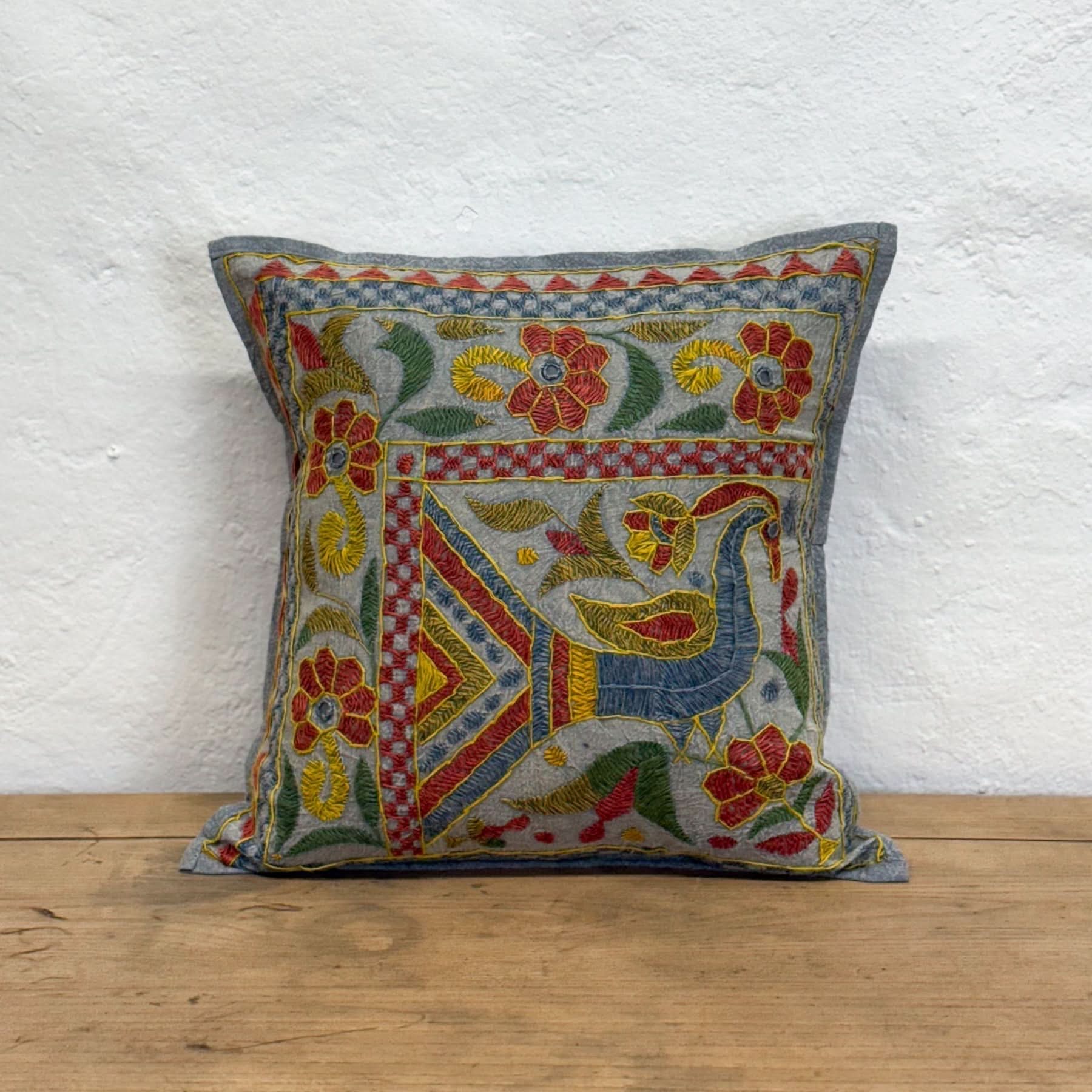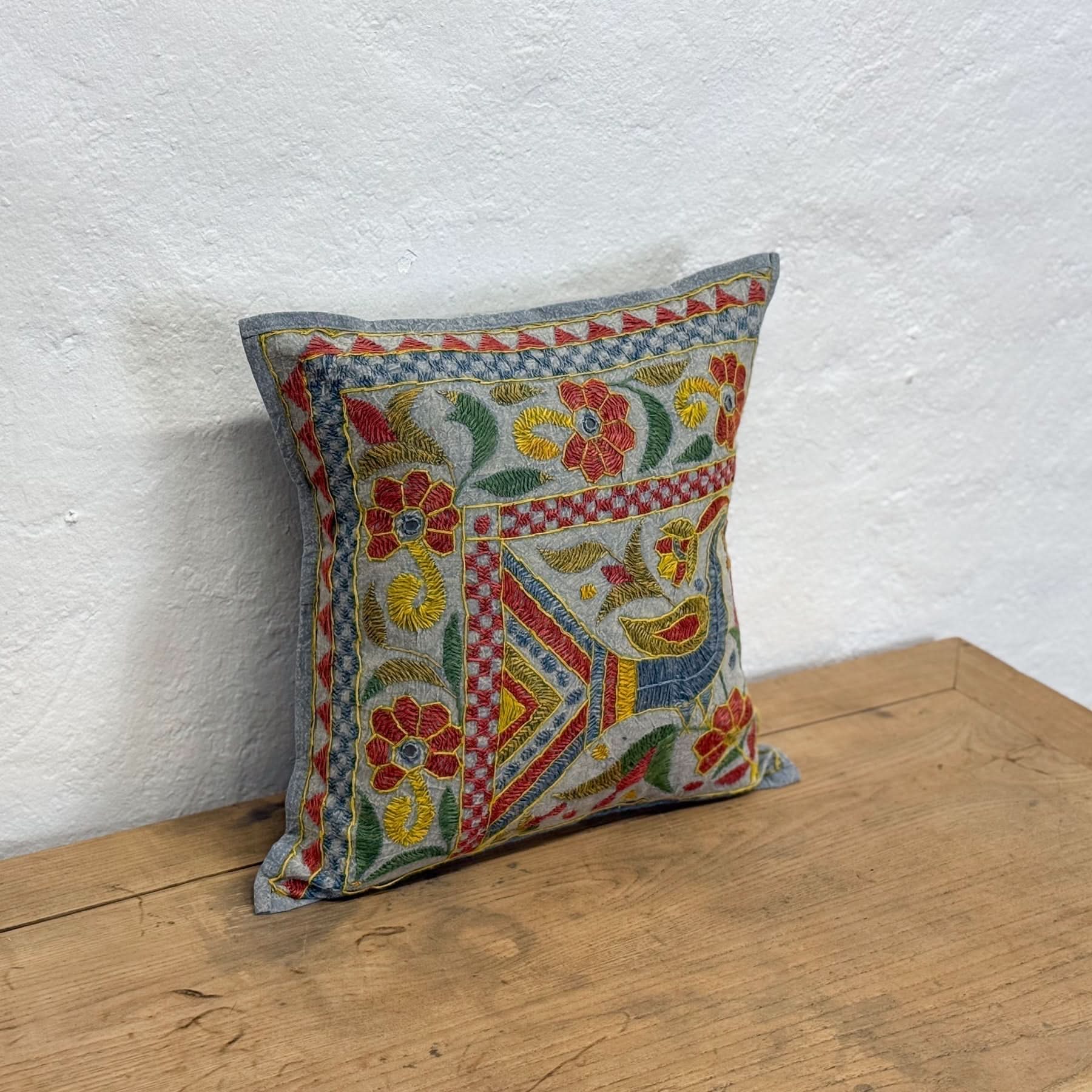 Detailed embroidery in rich, vivid tones contrasts beautifully against a soft, dusty blue background in this small cushion. A charming addition to layered cushion settings.