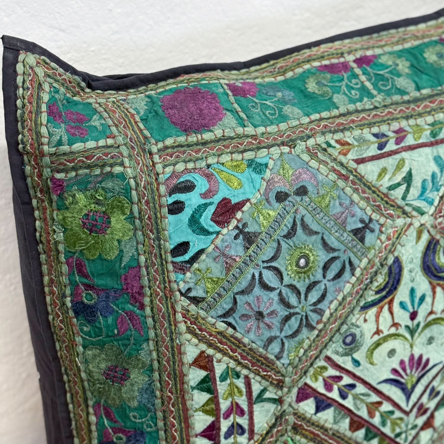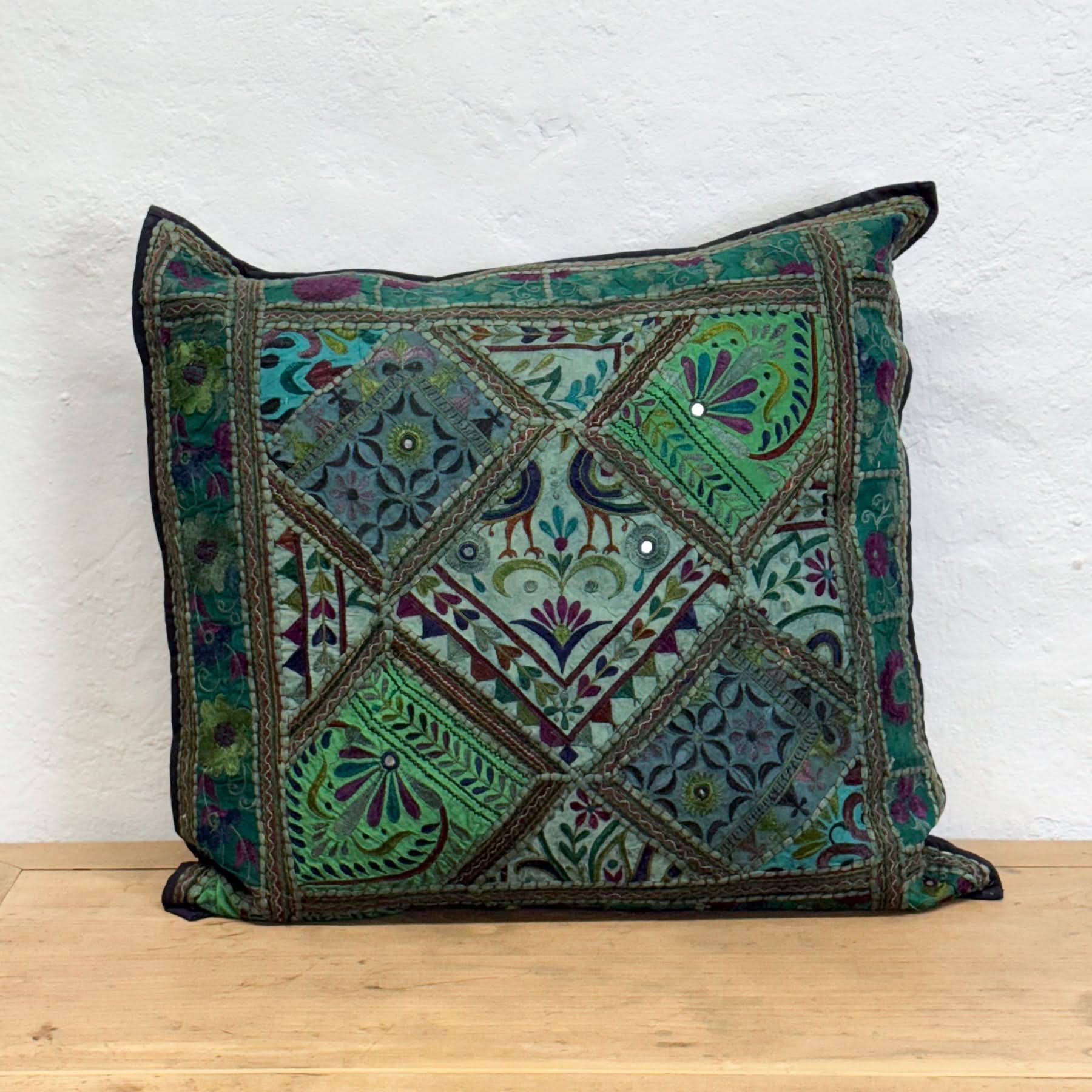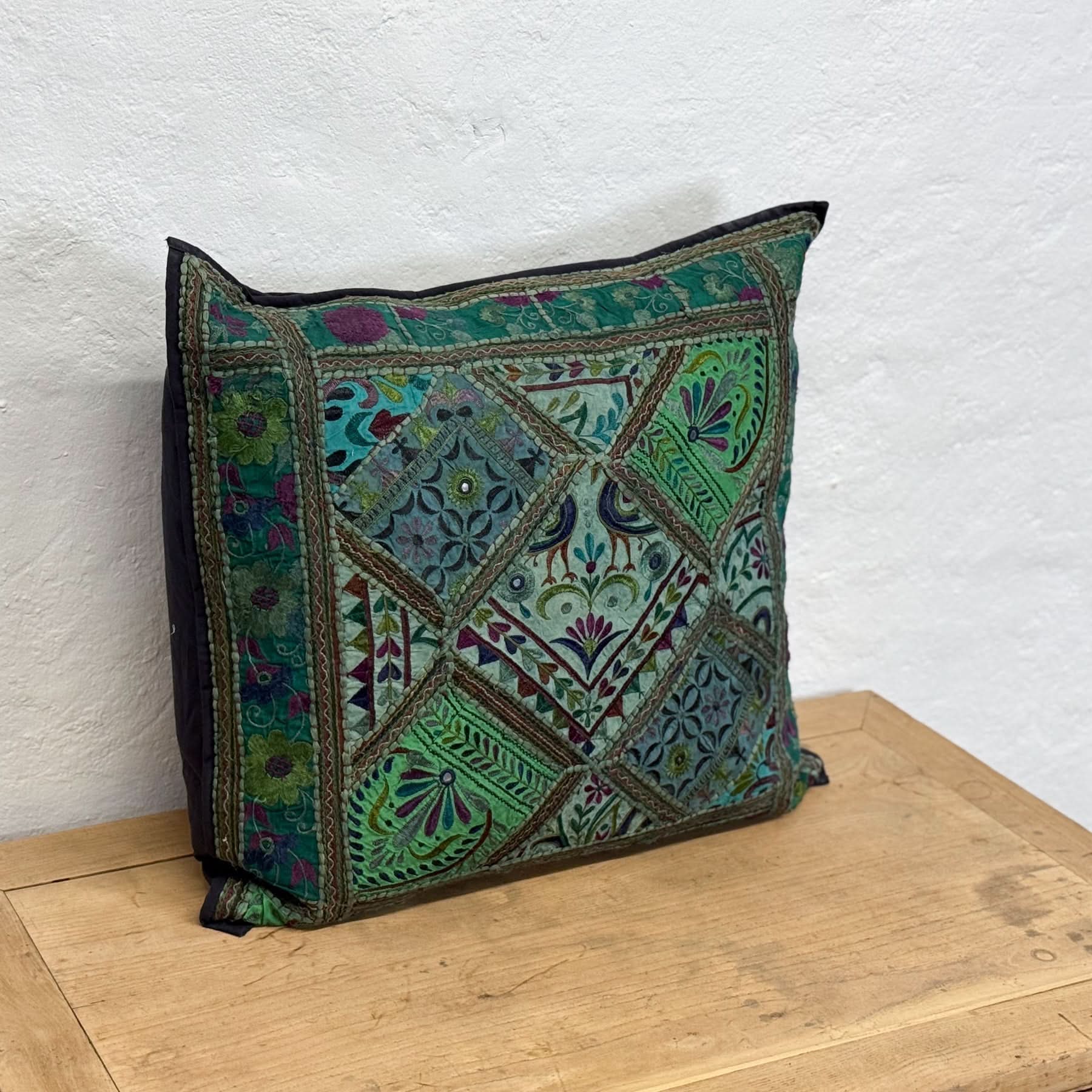 This large Indian cushion features a lively patchwork-style design rendered in saturated greens and accented with rich blues and purples. A strong but balanced piece that holds its own in both refined and relaxed spaces.