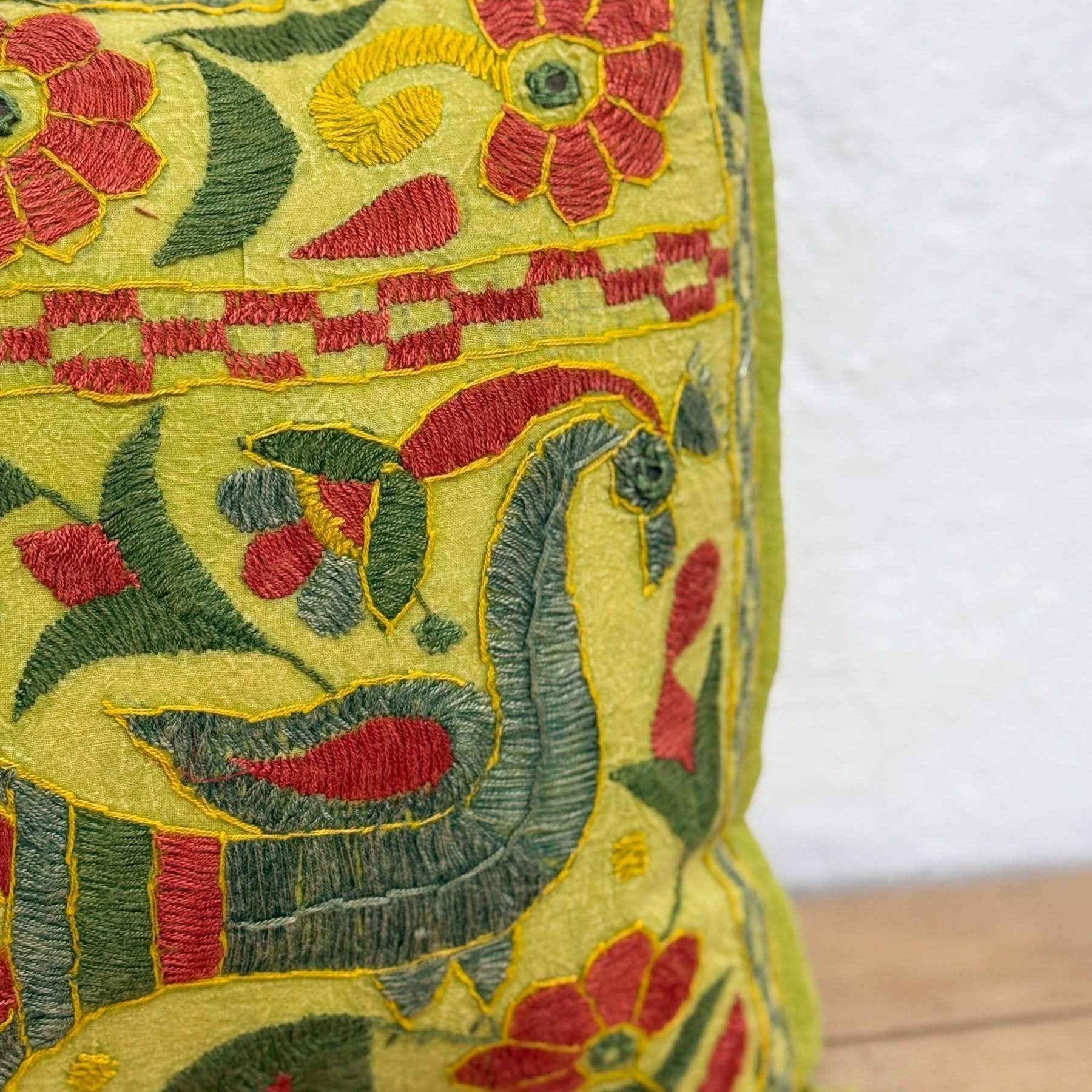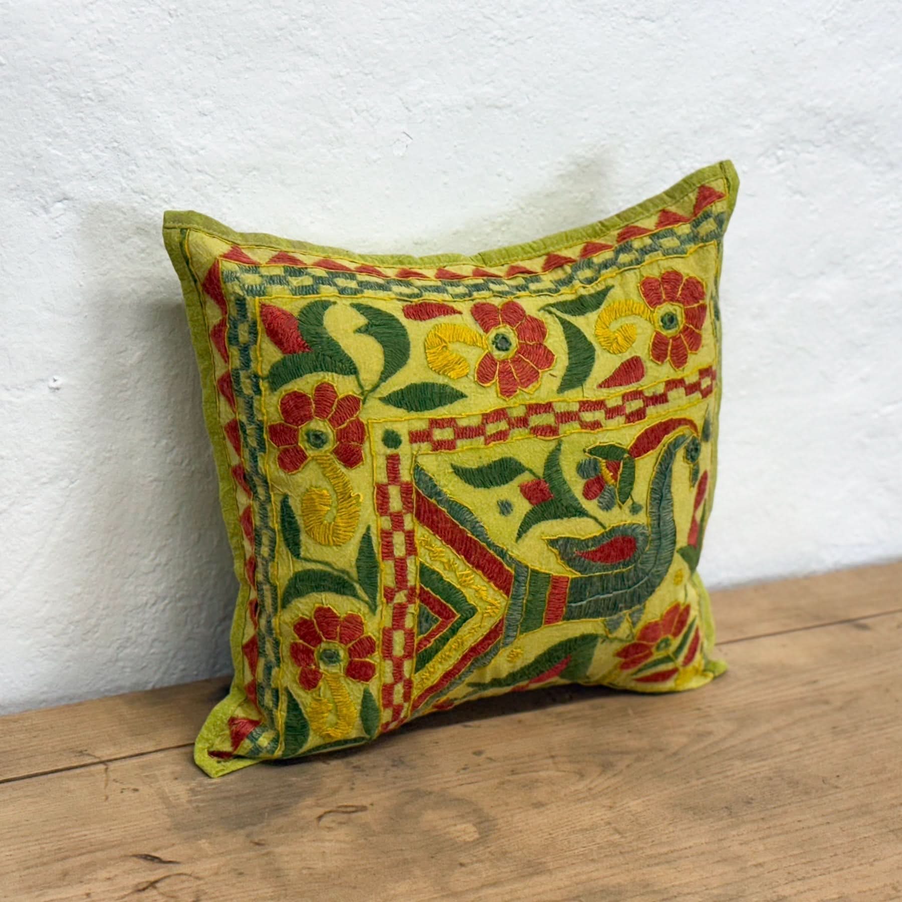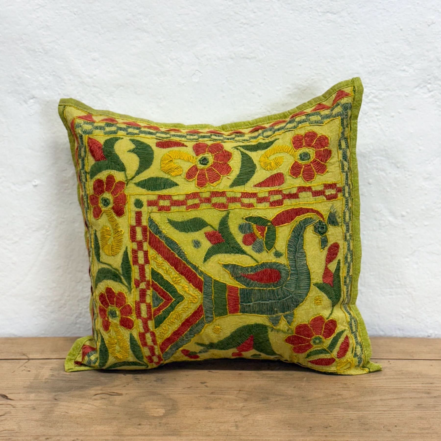 Rich with colour and cultural flair, this small cushion features a vibrant peacock and floral embroidery set against a bold lime green backdrop. A joyful accent with intricate detail.