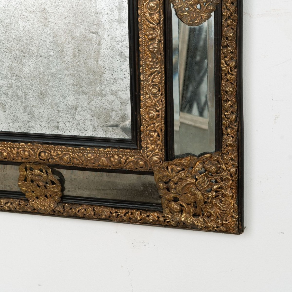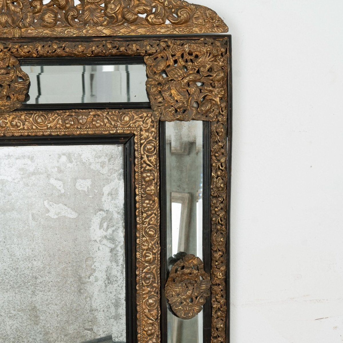 The mirror retains all of its original mirror plates throughout with the central plate set within a mottled ebony border with a wave like design and an impressive pierced gilt metal band with lovely foliate designs.
