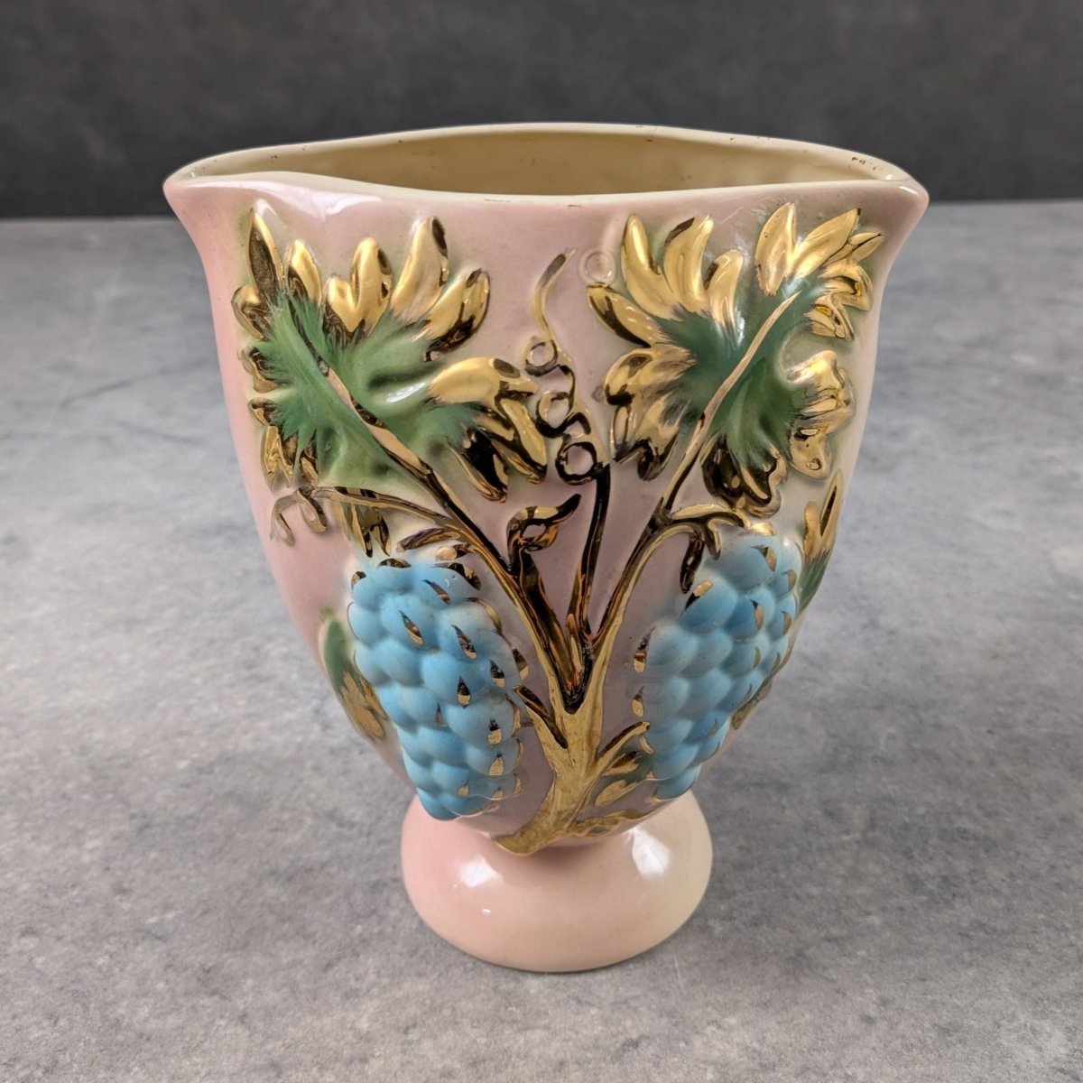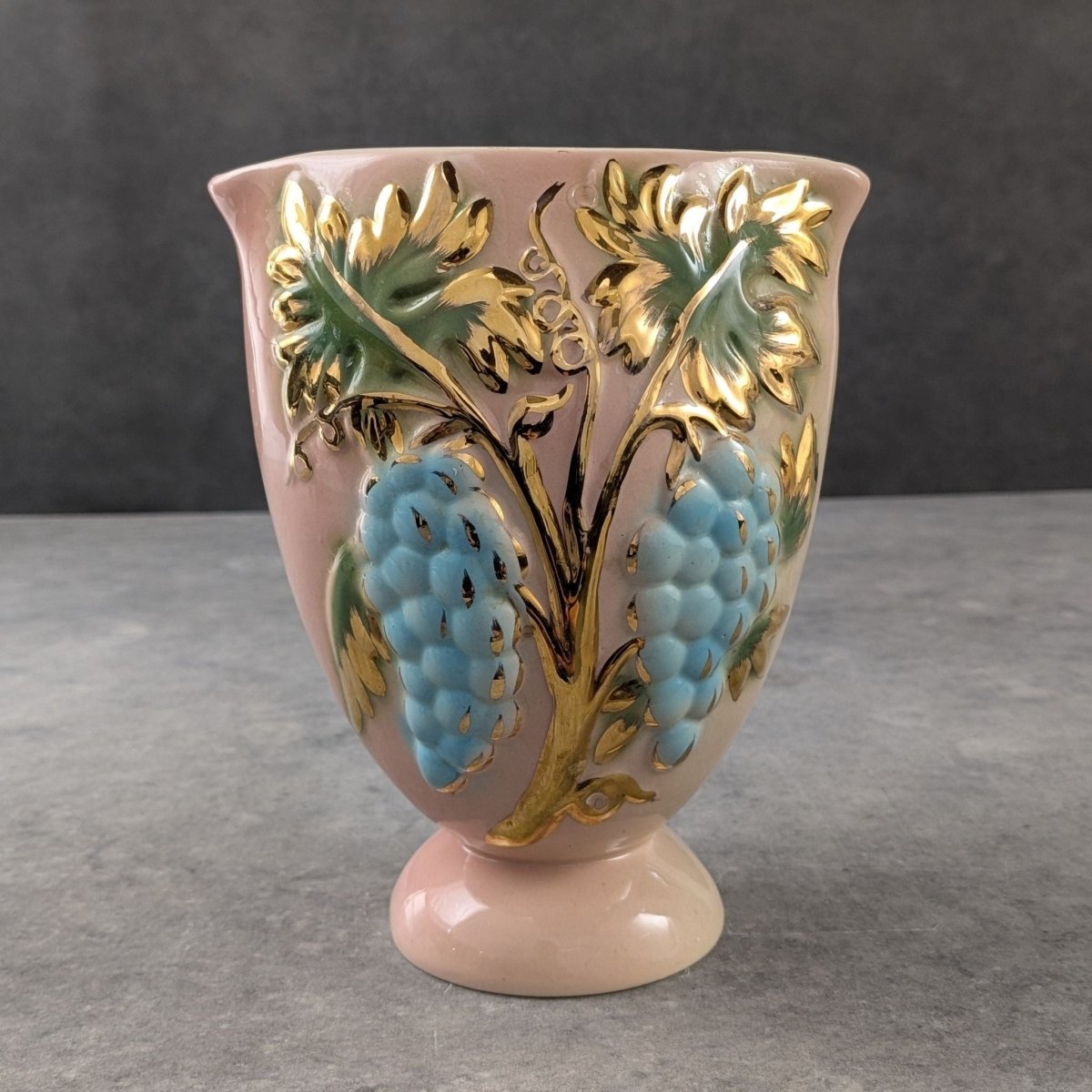 A classic Australian Kalmar vase with the richness and dimensionality the studio became known for. The soft blush glaze carries raised clusters of blue grapes and curling leaves finished in high-gloss gold, giving the surface a depth that shifts with light. The palette is unmistakably mid century. The detailing leans toward majolica tradition while staying rooted in Kalmar’s local Australian production. It sits as an object of pure ornament. Warm, characterful, and instantly noticeable in any interior that benefits from colour and texture.