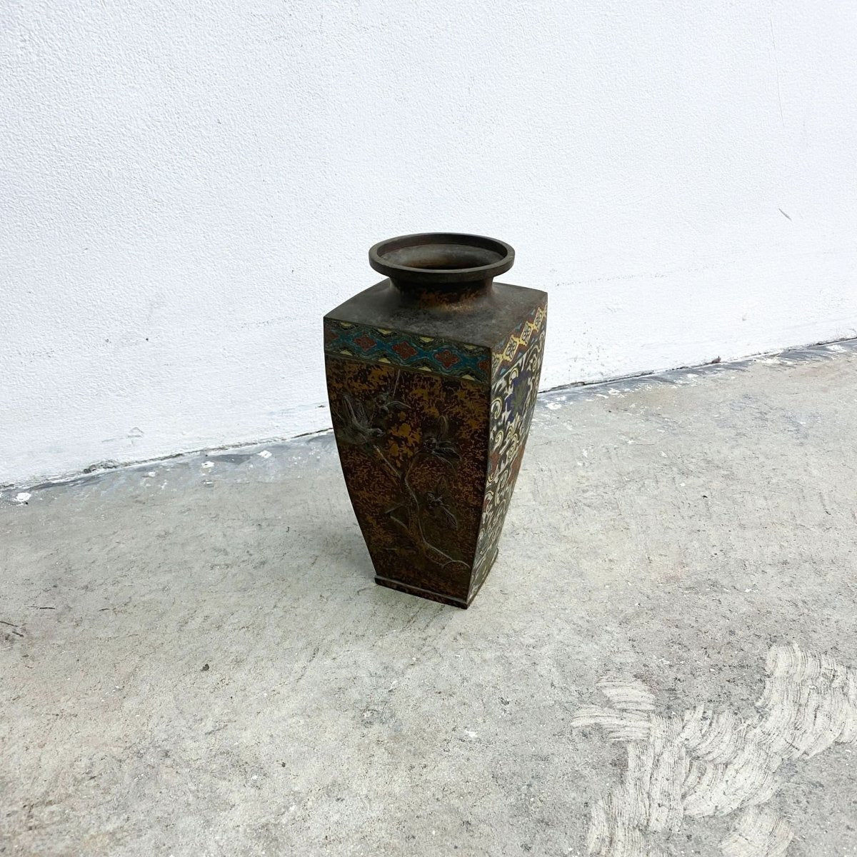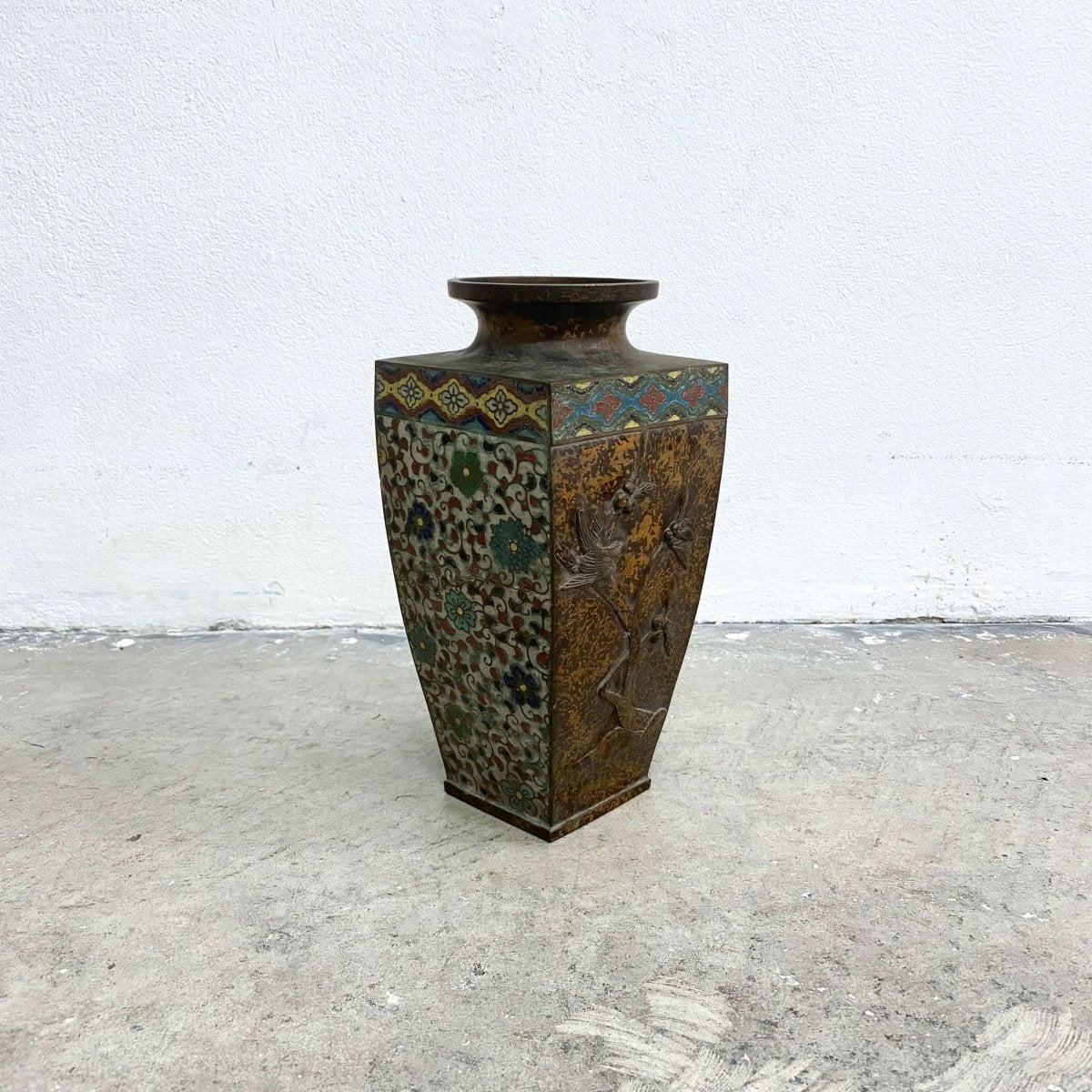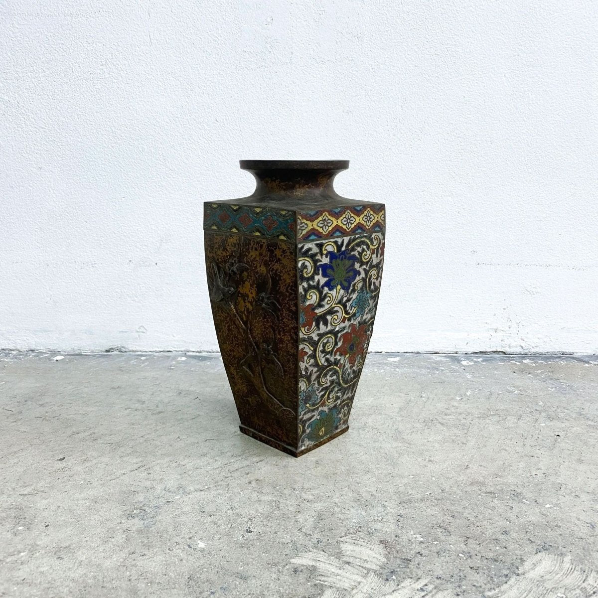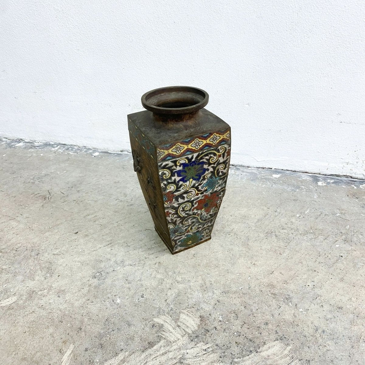 Antique Chinese cloisonné vase featuring intricated floral design on white background. In very good condition with some cracking to the enamel.