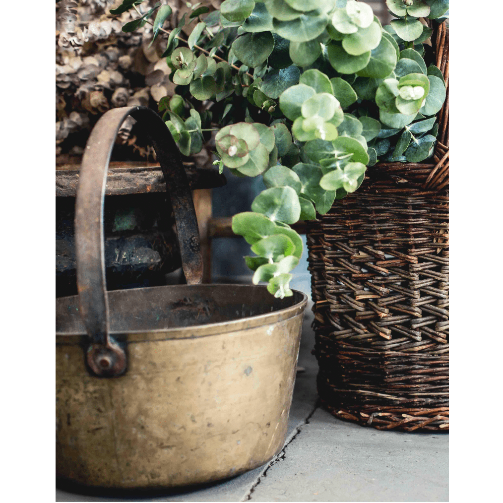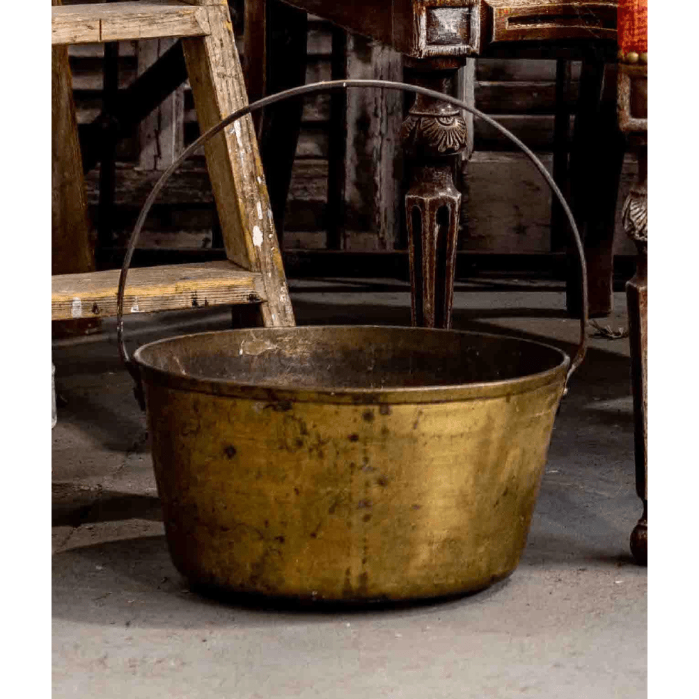Lovely antique French solid brass basin with iron handle, from the French Alps