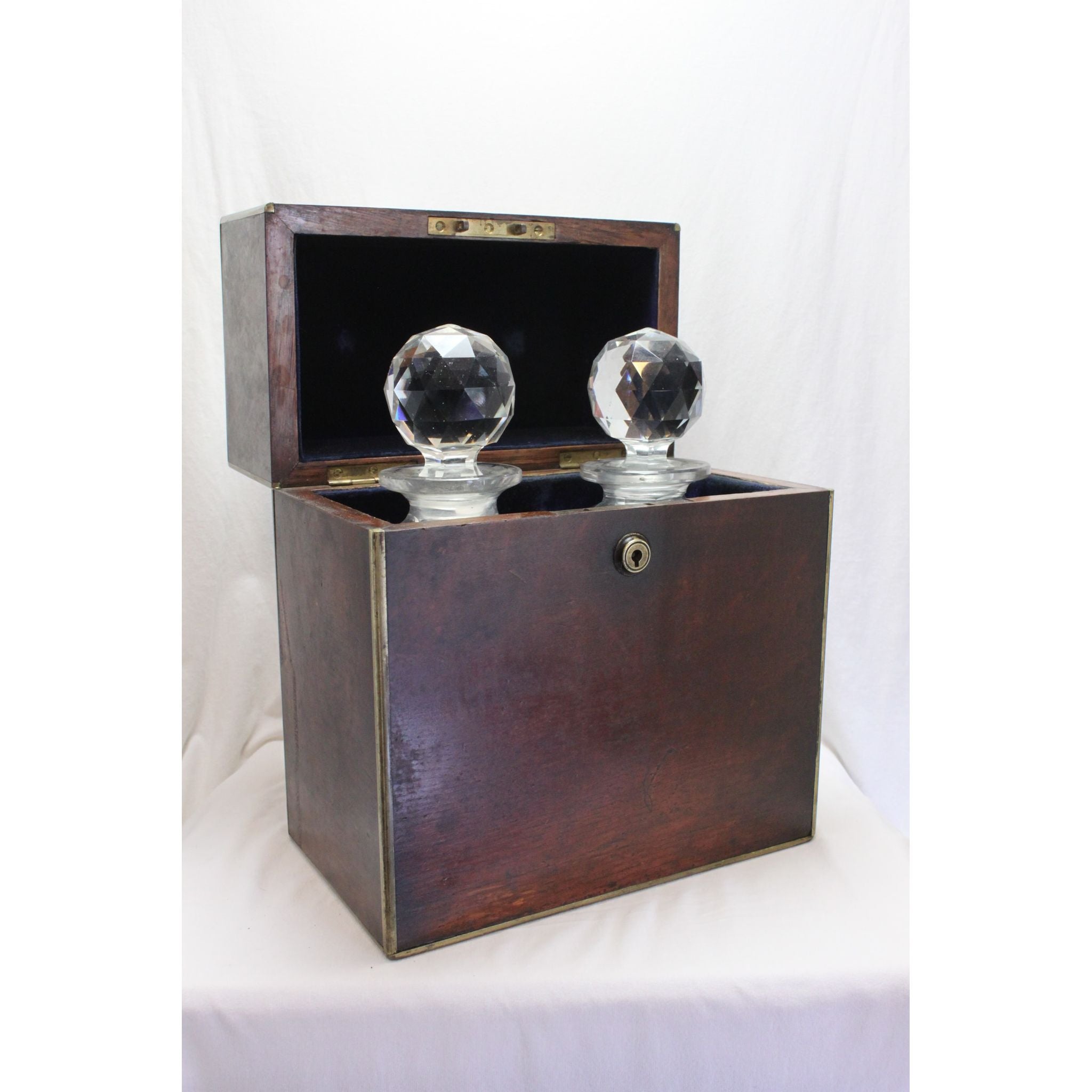 This good quality brass bound campaign decanter box is made of oak, which has been stained a reddish colour. The walls of the piece are 14 mm thick, which is a touch over half an inch, and it carries a good quality Bramah lock. The box stands 286 mm (11.25 inches) high, is 245 mm (9 5/8ths of an inch) wide and 143 mm (5 5/8ths inches) deep. The interior is lined with a dark blue velvet. The decanters are replacements and are in very good condition, with only some very small chips to the bases to detract from them. There is also a bruise to the bottom of one of the stoppers. With the decanters in place it weighs just under 7 kilograms (15.5 pounds). C 1800.