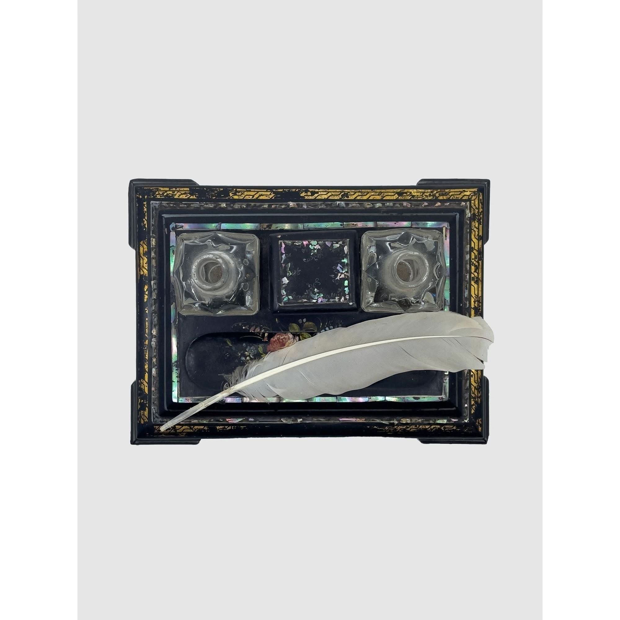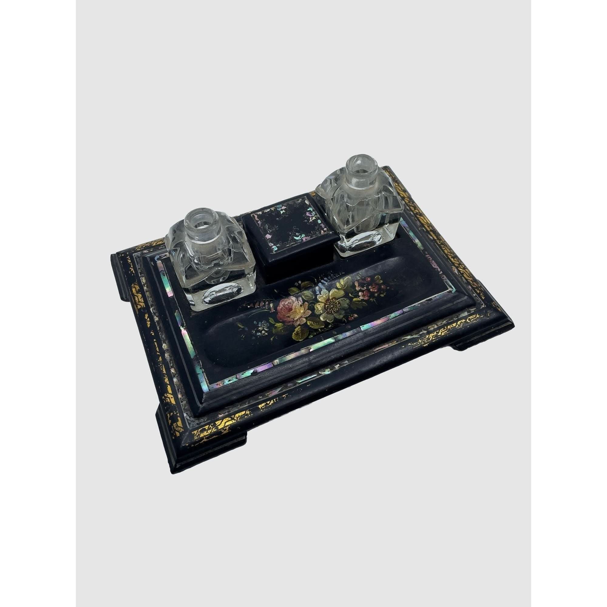 Victorian papier-mâché desk set with mother-of-pearl inlay and floral painted detail and two glass inkwells.