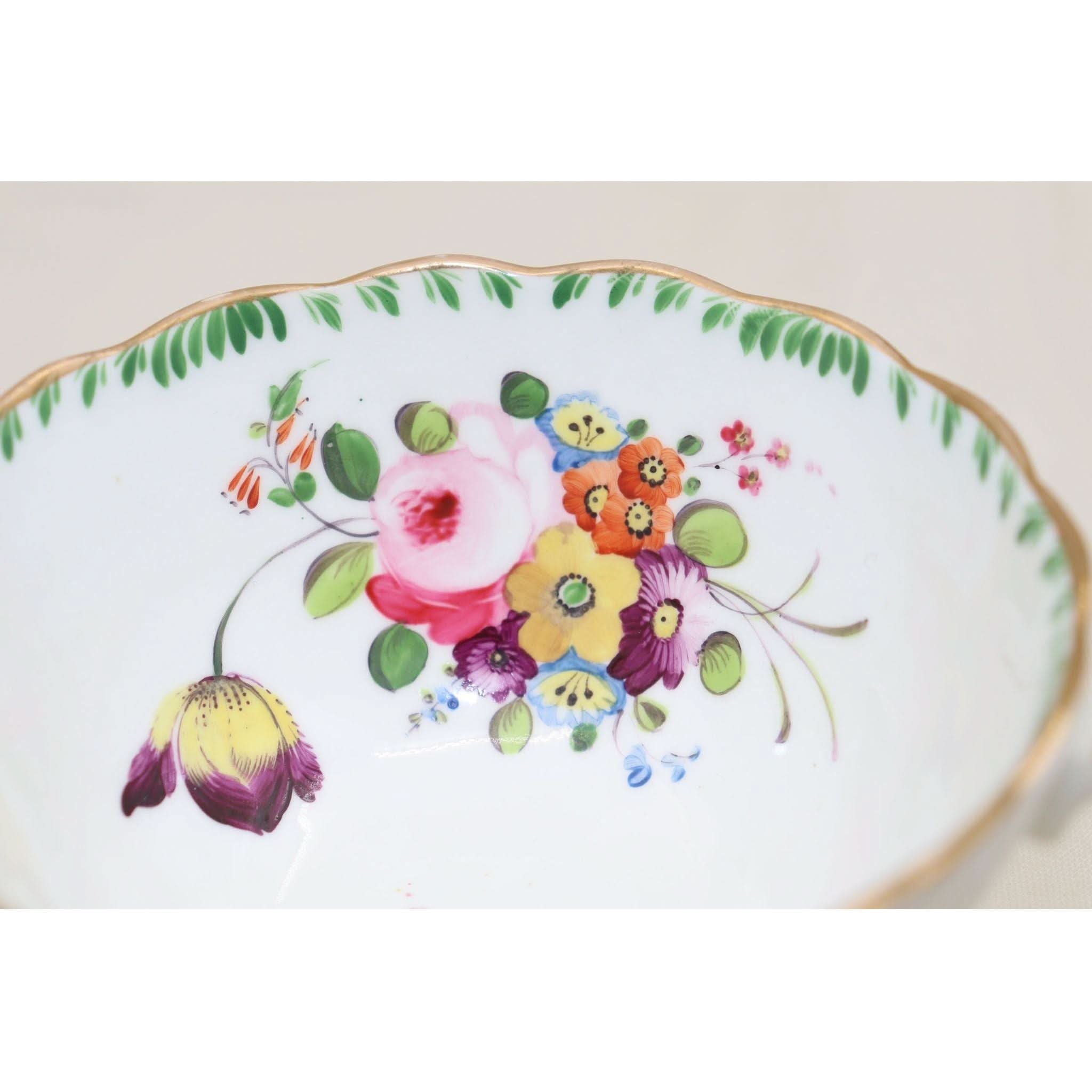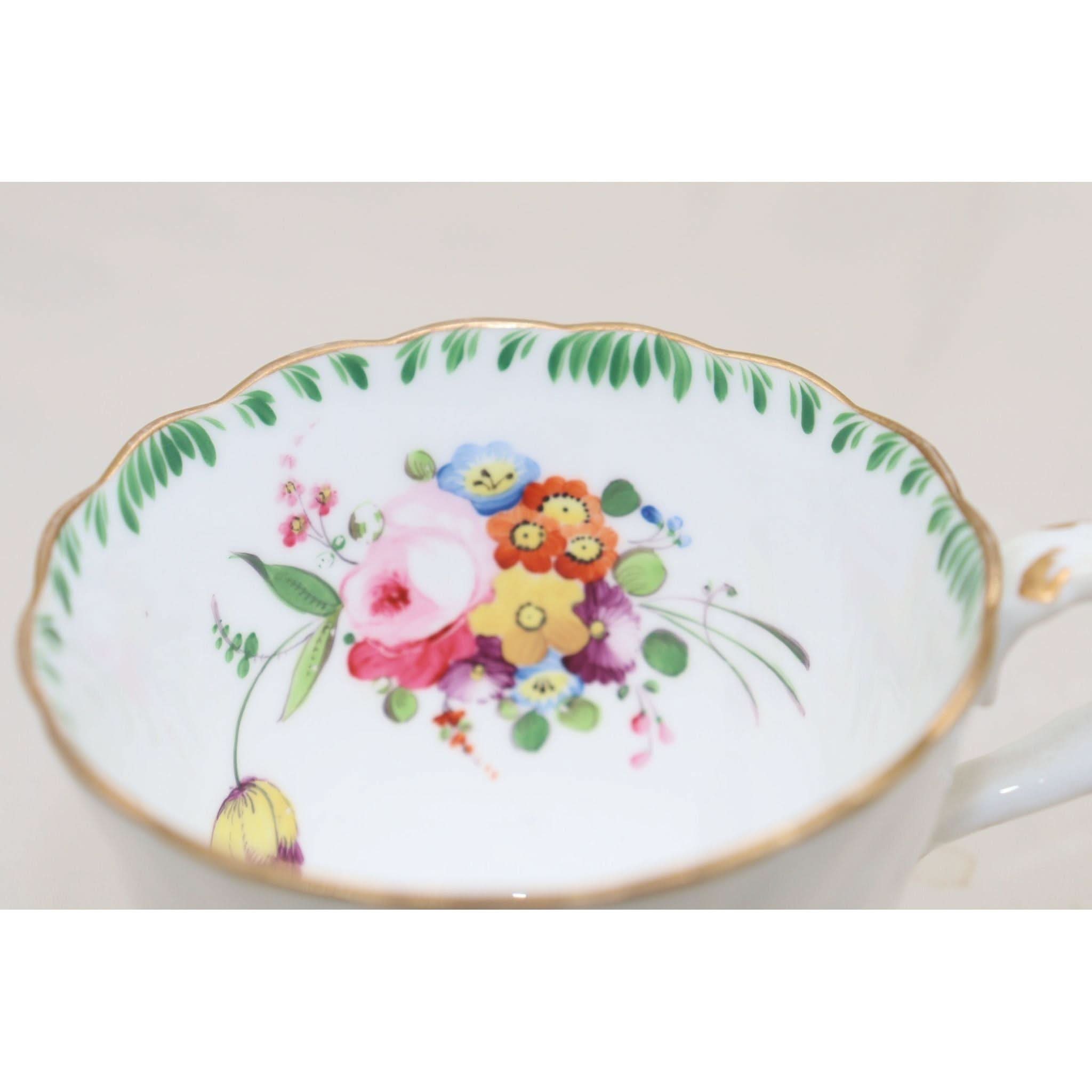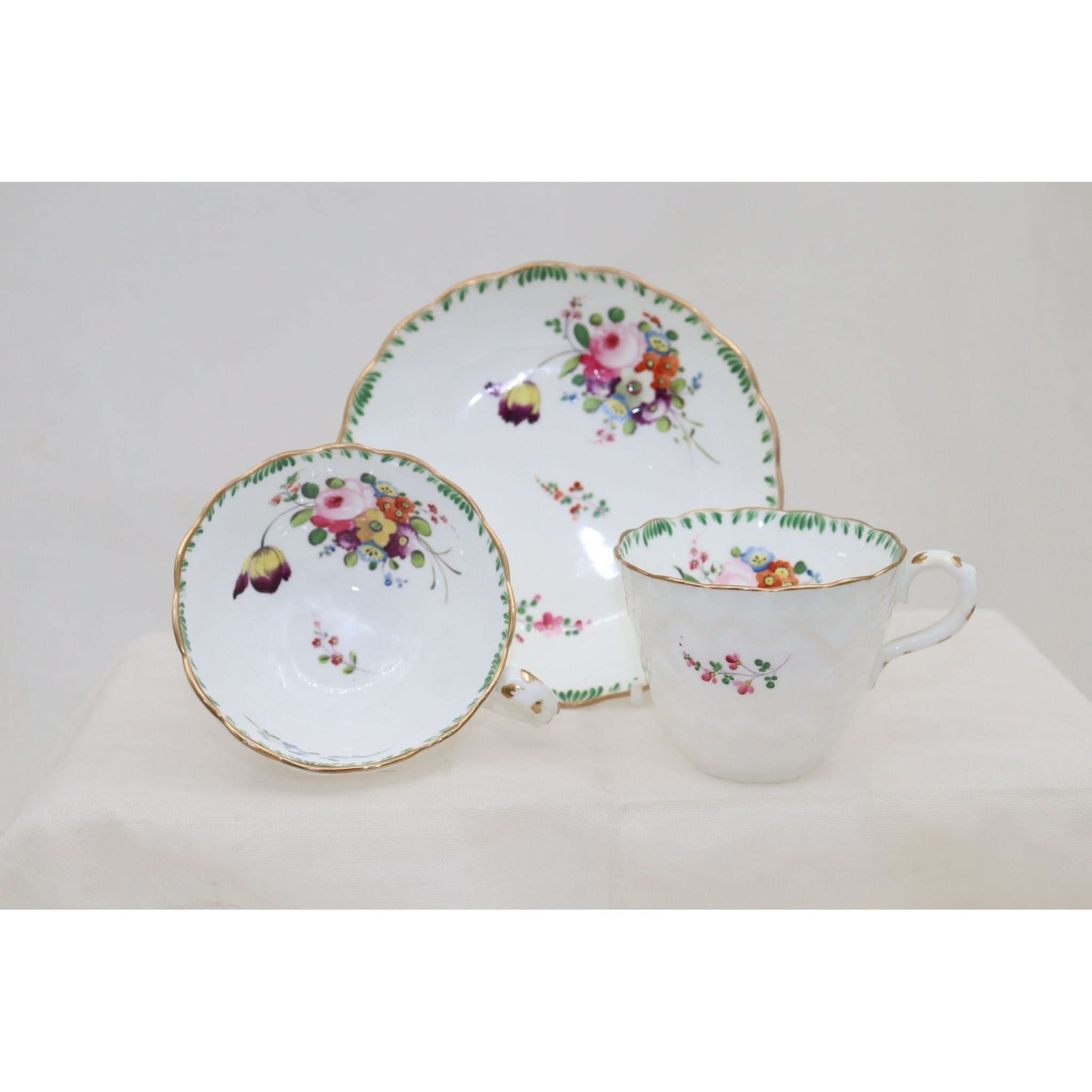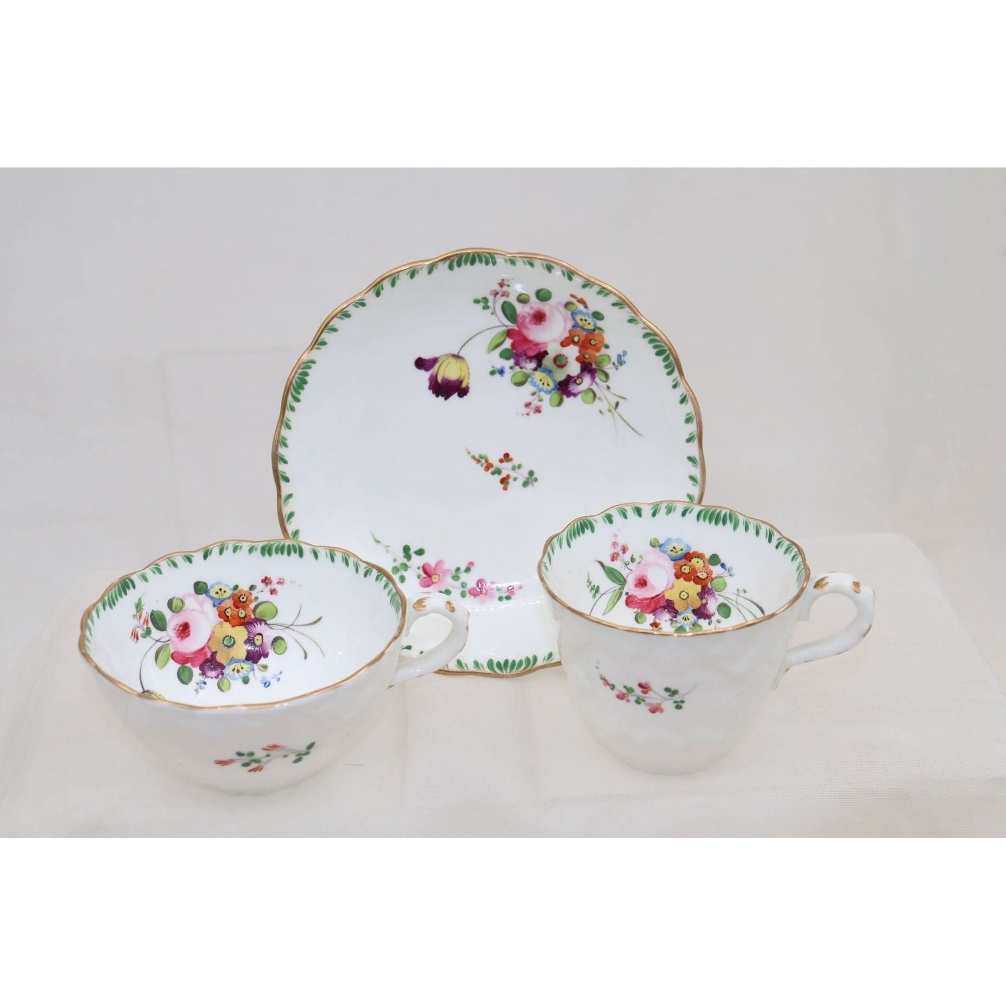 A very pretty Rockingham hand painted and gilded porcelain trio decorated with pattern 958. The shape is "Basket Weave", with a moulded basket weave pattern to the outside of the cups and to the base of the saucer. There are plain cartouches on either side of the cups which have been decorated with small sprays of hand painted flowers. The inside of the cups feature sprays of hand painted flowers below a ring of pendant green leaves to the rim, with the same decoration on the saucer. There is some very faint crazing and a very small area of light discolouration to the outside of the coffee cup-otherwise it is in superb condition. It would date from the period 1830-42.
