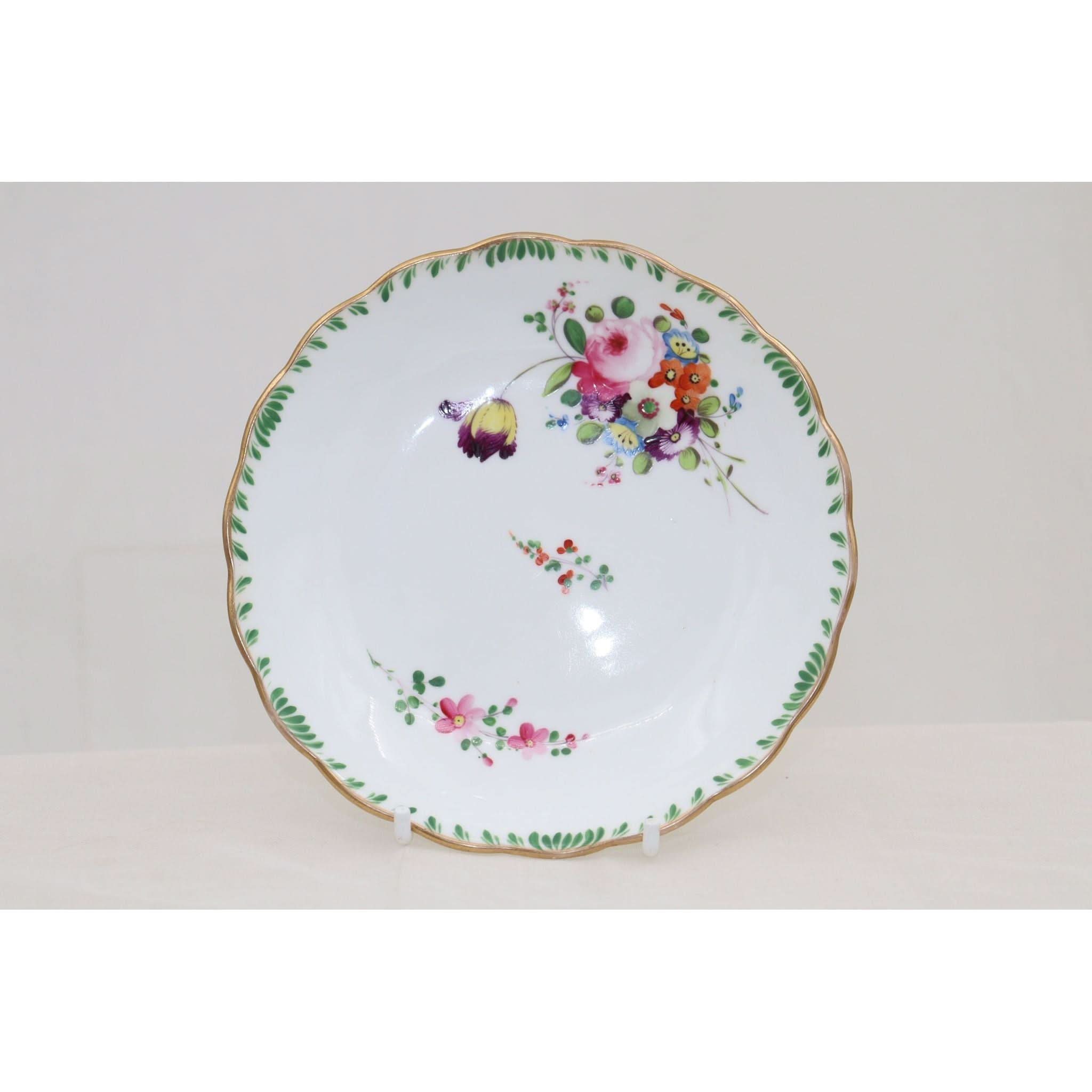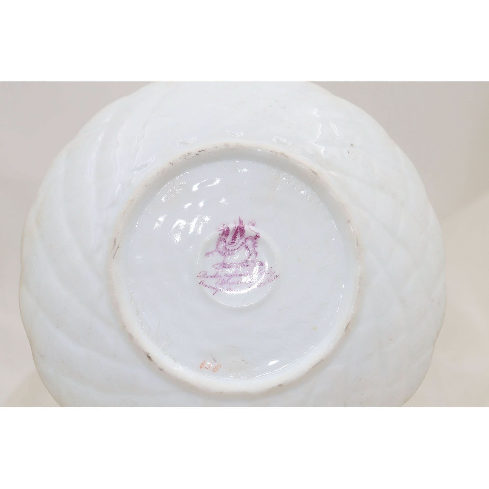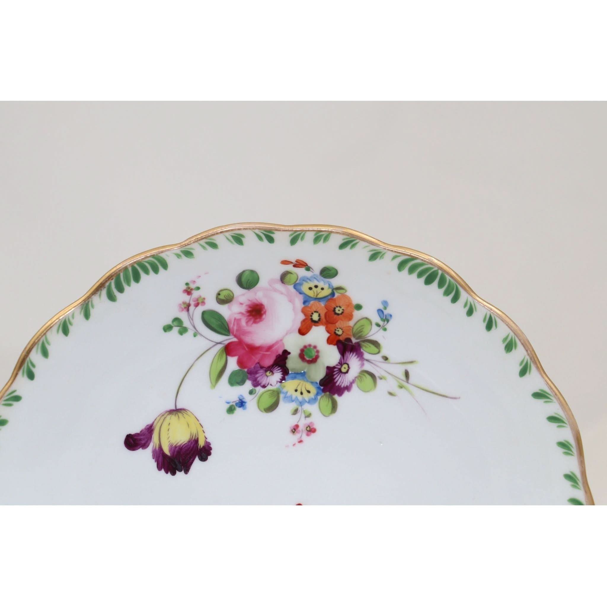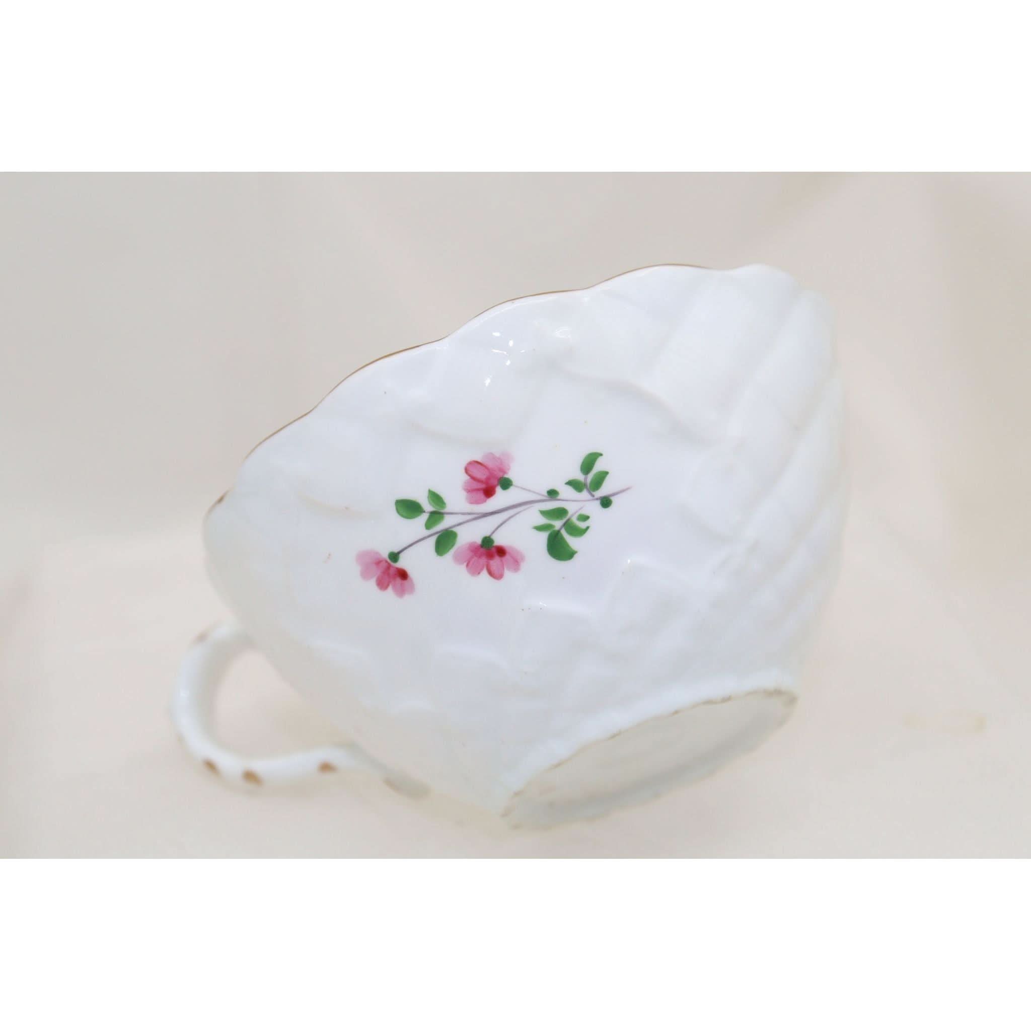 A very pretty Rockingham hand painted and gilded porcelain trio decorated with pattern 958. The shape is "Basket Weave", with a moulded basket weave pattern to the outside of the cups and to the base of the saucer. There are plain cartouches on either side of the cups which have been decorated with small sprays of hand painted flowers. The inside of the cups feature sprays of hand painted flowers below a ring of pendant green leaves to the rim, with the same decoration on the saucer. There is some very faint crazing and a very small area of light discolouration to the outside of the coffee cup-otherwise it is in superb condition. It would date from the period 1830-42.