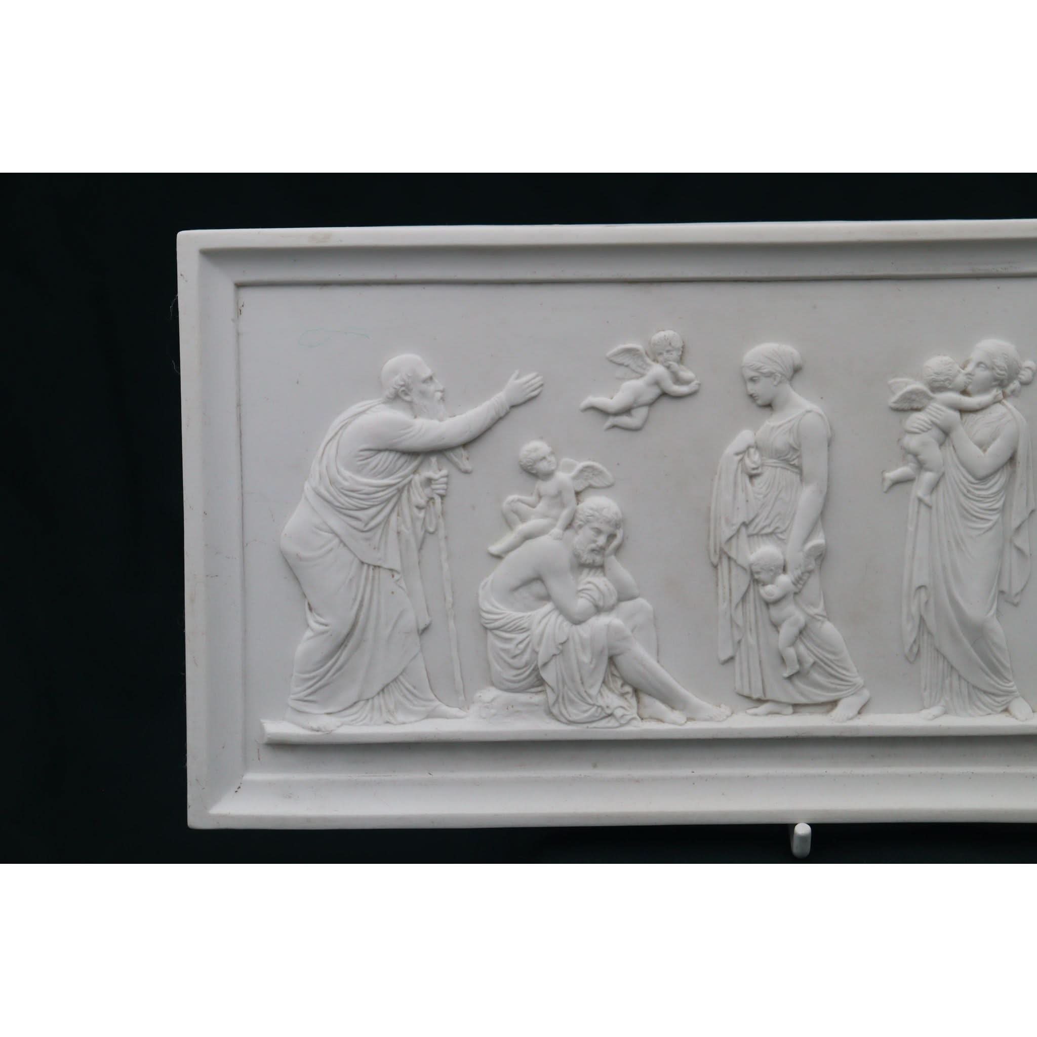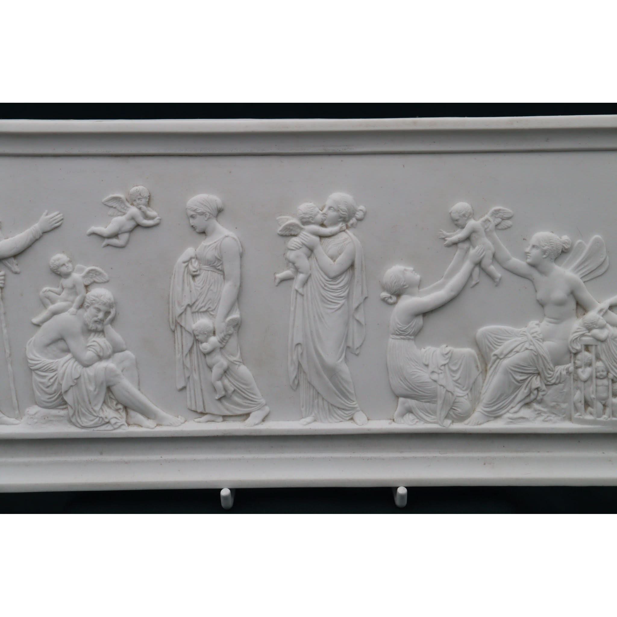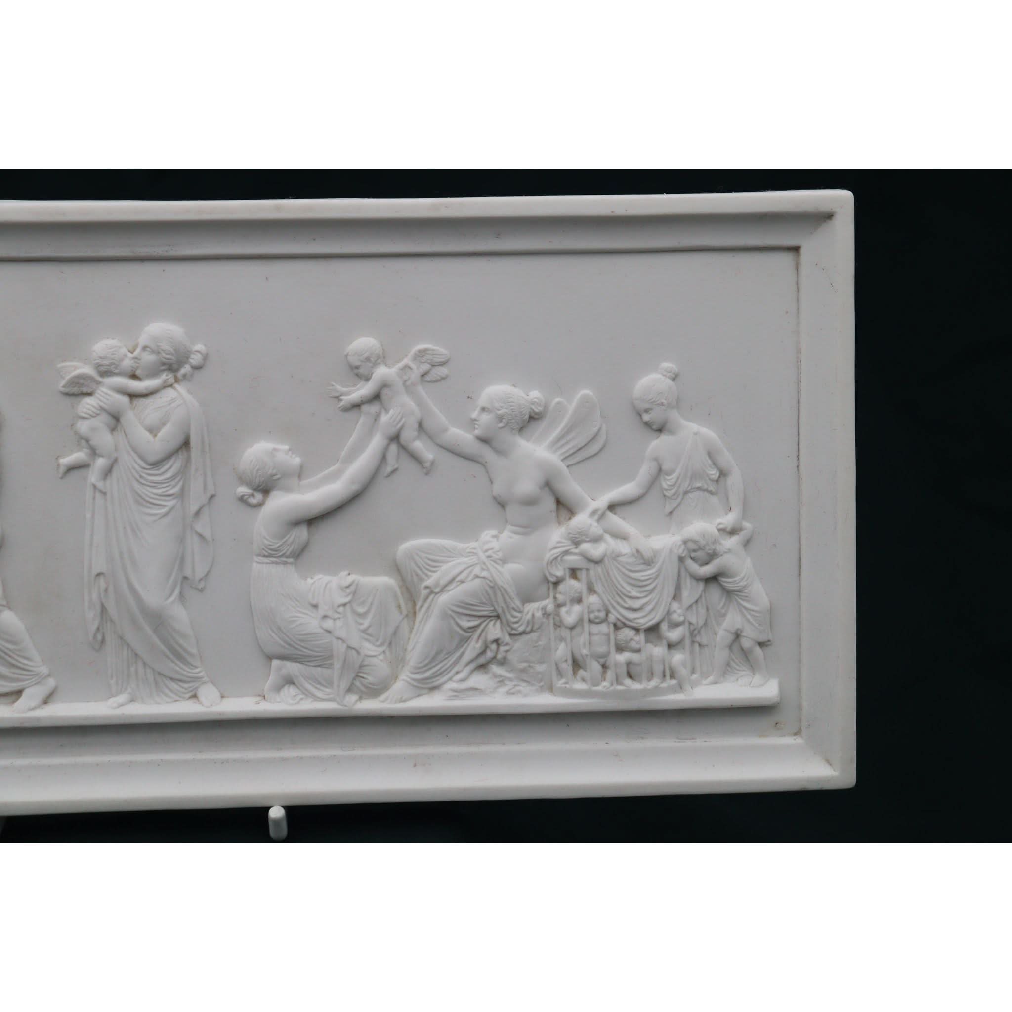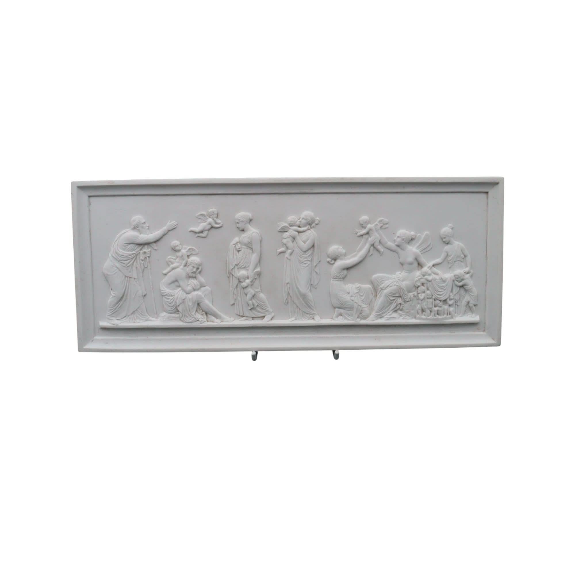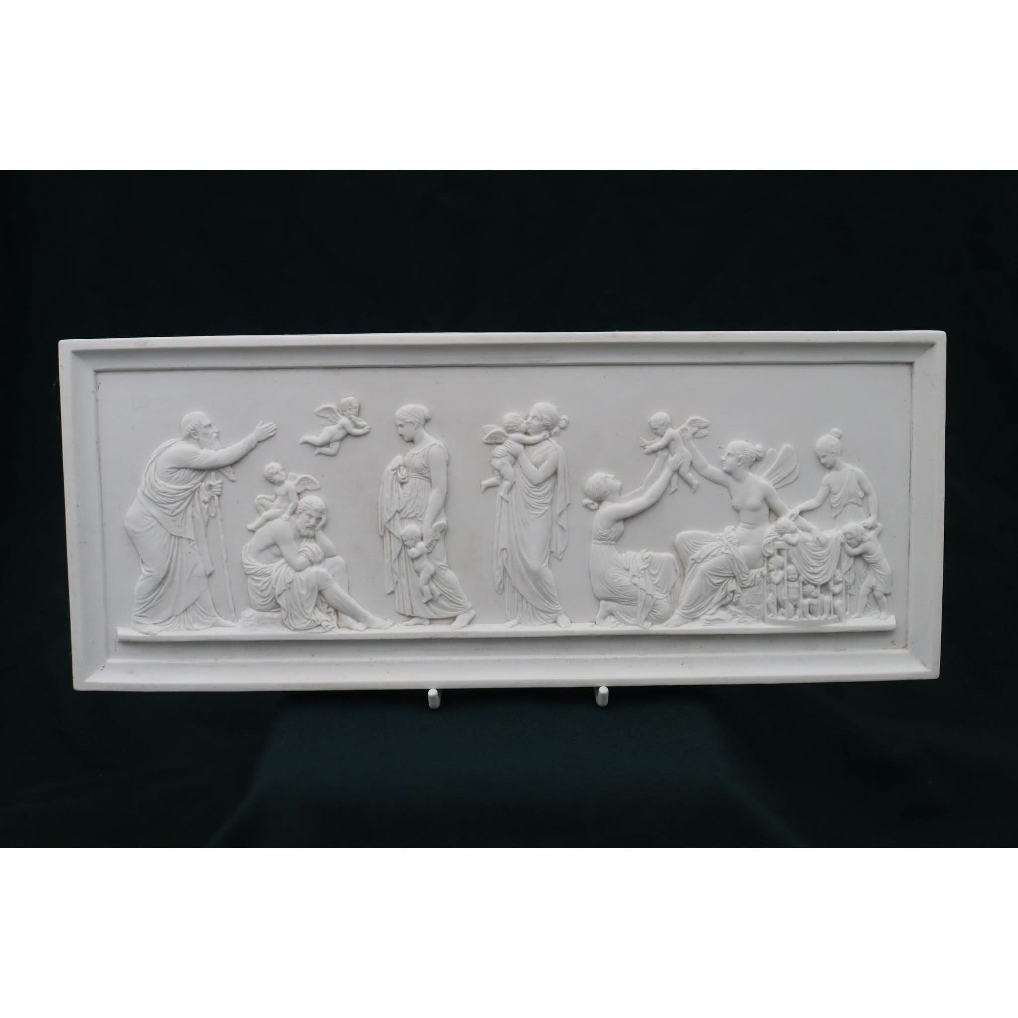 This relief moulded Royal Copenhagen wall plaque is made of biscuit porcelain and features Psyche, the goddess of the soul, handing out small cupids, which symbolises love. It is entitled "Love Ages #15", or the "Ages of Love". There are holes in the top for wire or cord, that allow it to be hung on a wall, or it could be supported on a stand for display. It is after the Danish sculptor Bertel Thorvaldsen's (1770-1844) relief sculpture of the mid 1800's, which itself was based on an ancient relief. It measures 310 mm (just over 12 inches) in width, 125 mm (5 inches) high and is 11 mm (.5 of an inch) thick. It is in very good condition, but there is a small chip to the edge at the rear on one side which is not particularly noticeable from the front. The Royal Copengagen mark used on this plaque was in use from 1870-90.