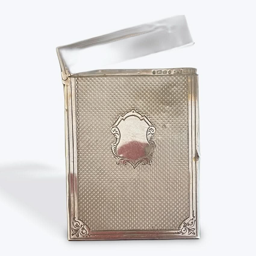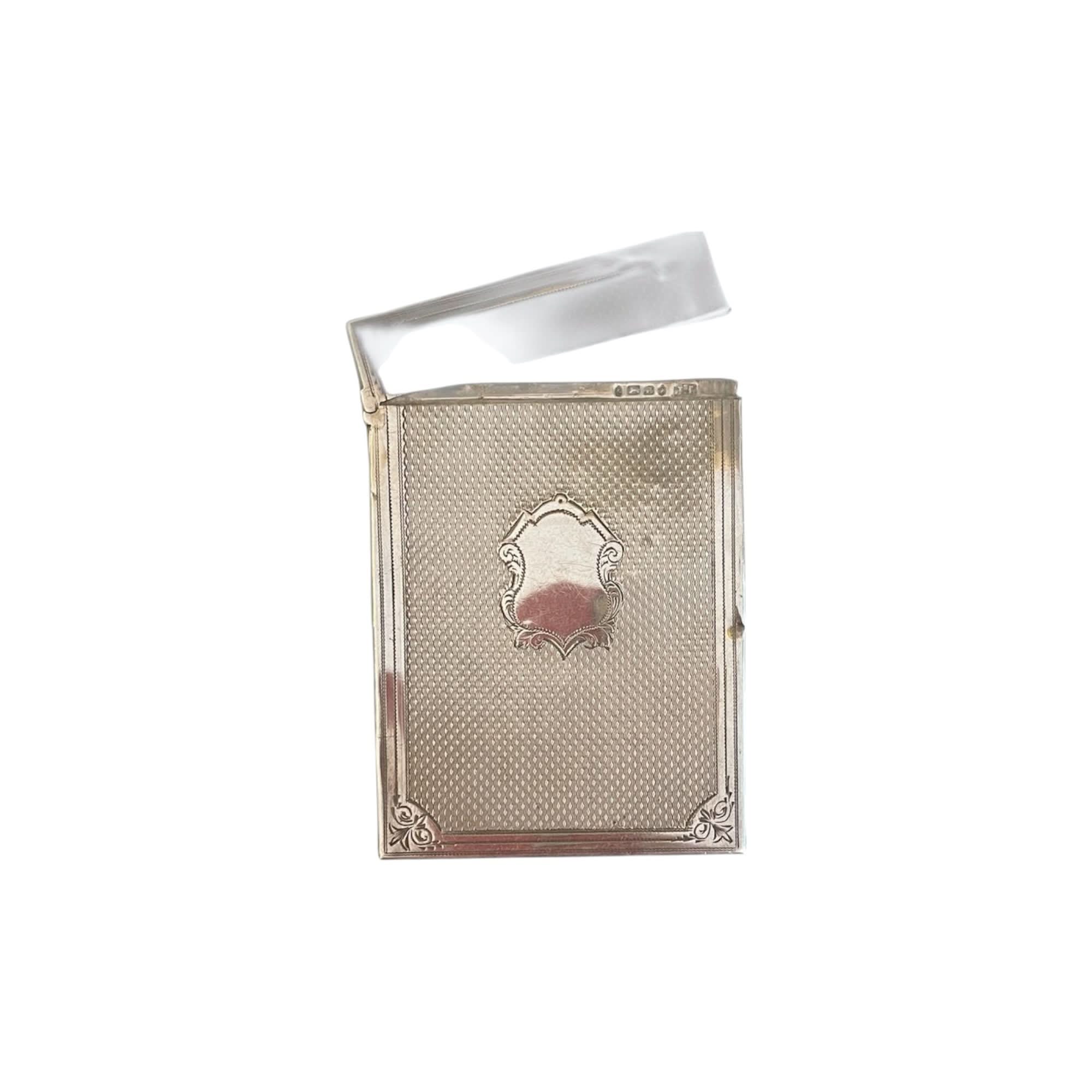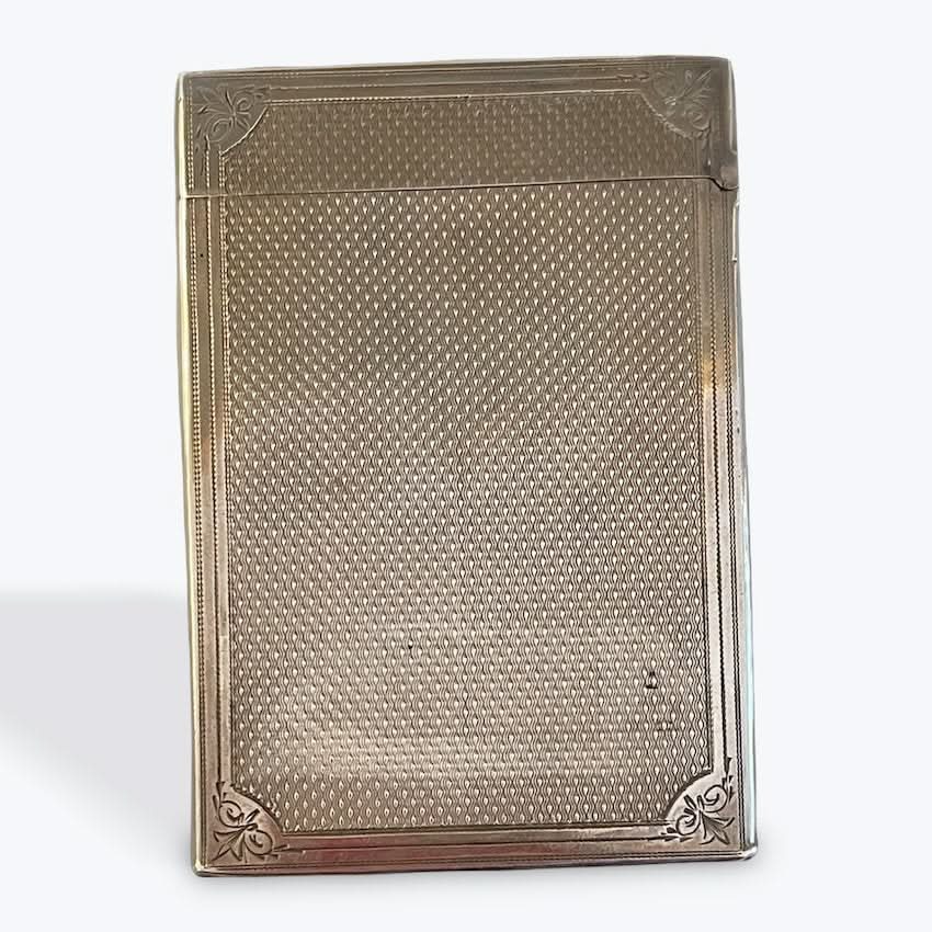 A nicely etched sterling silver card case with shield central pattern. Made by John Linegar 1879 Birmingham England. size:9.5 cm h x 6.5cm w